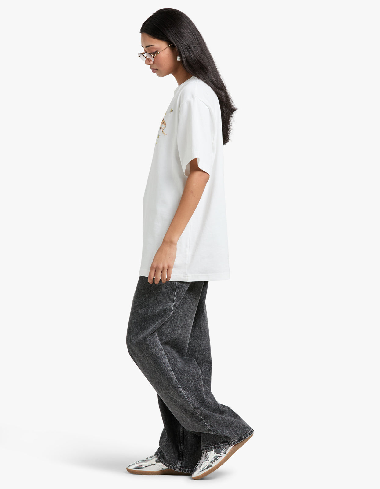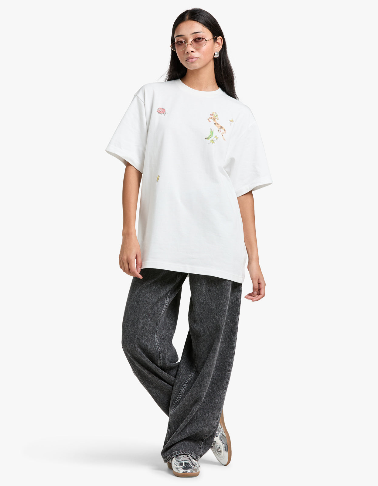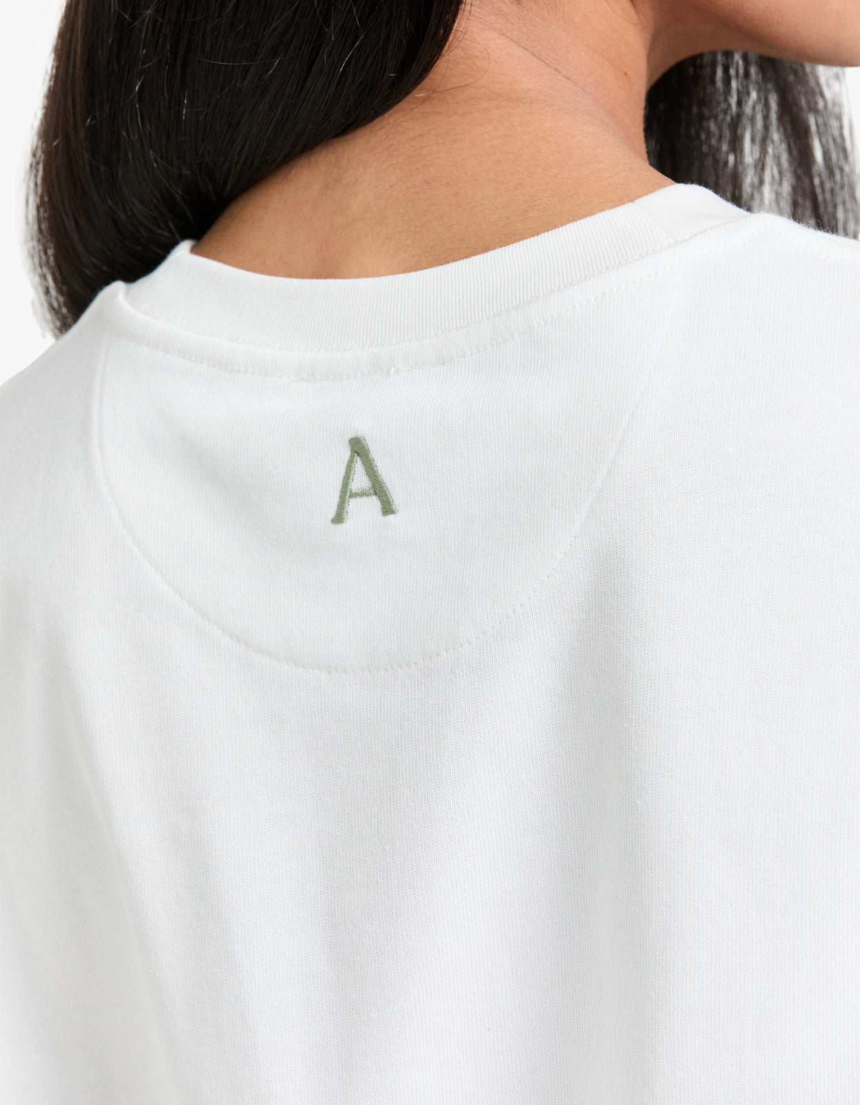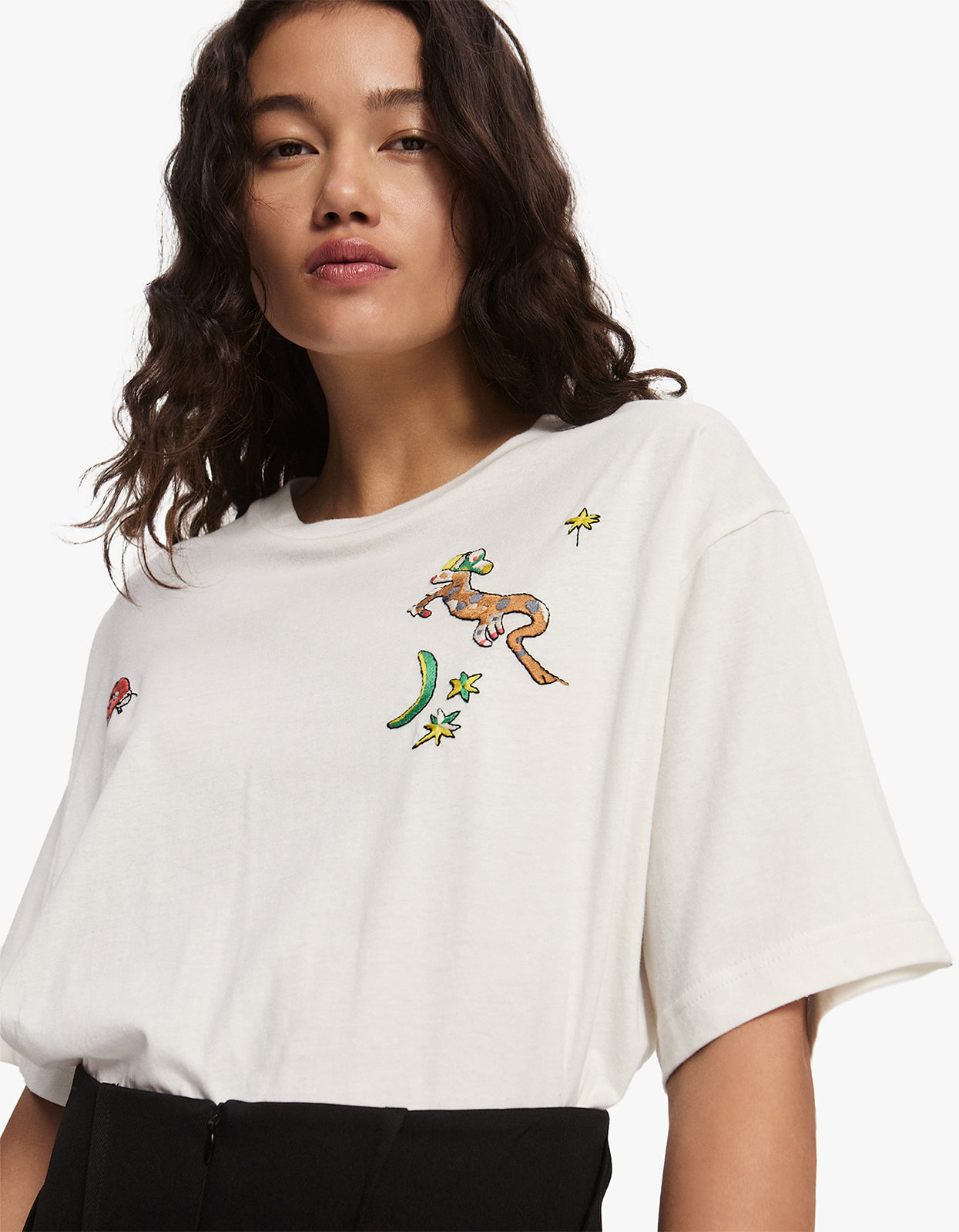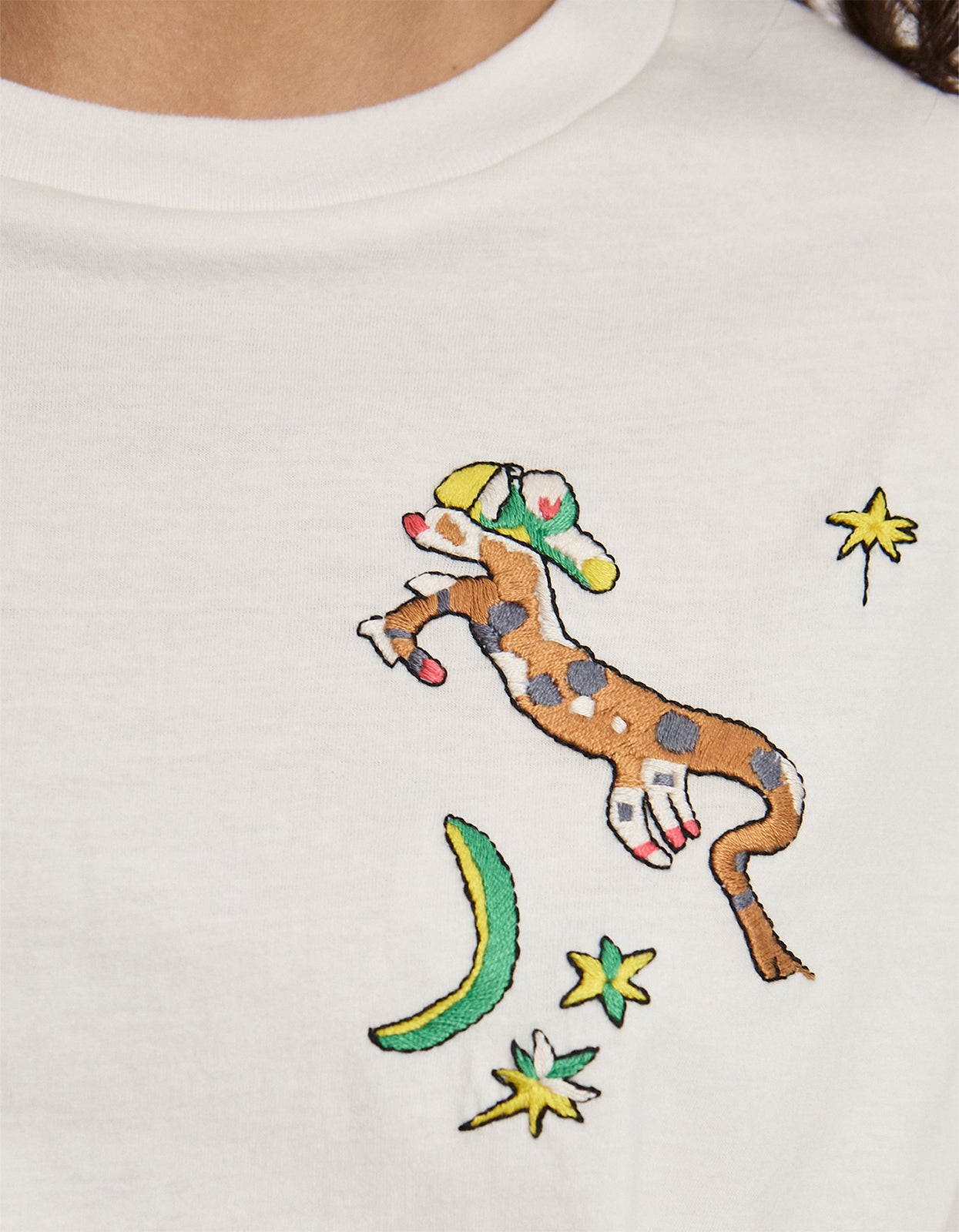With delicate embroidery and a soft cream hue, this tee seamlessly combines luxury and comfort. Elevate your wardrobe with this exclusive piece and make a statement wherever you go.