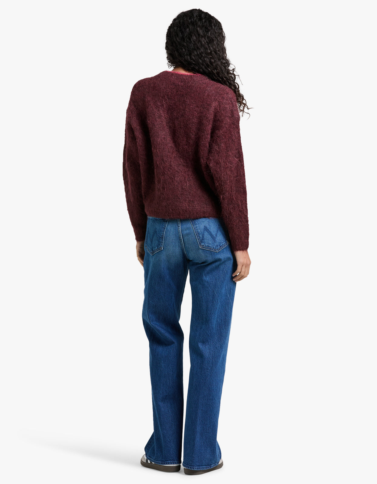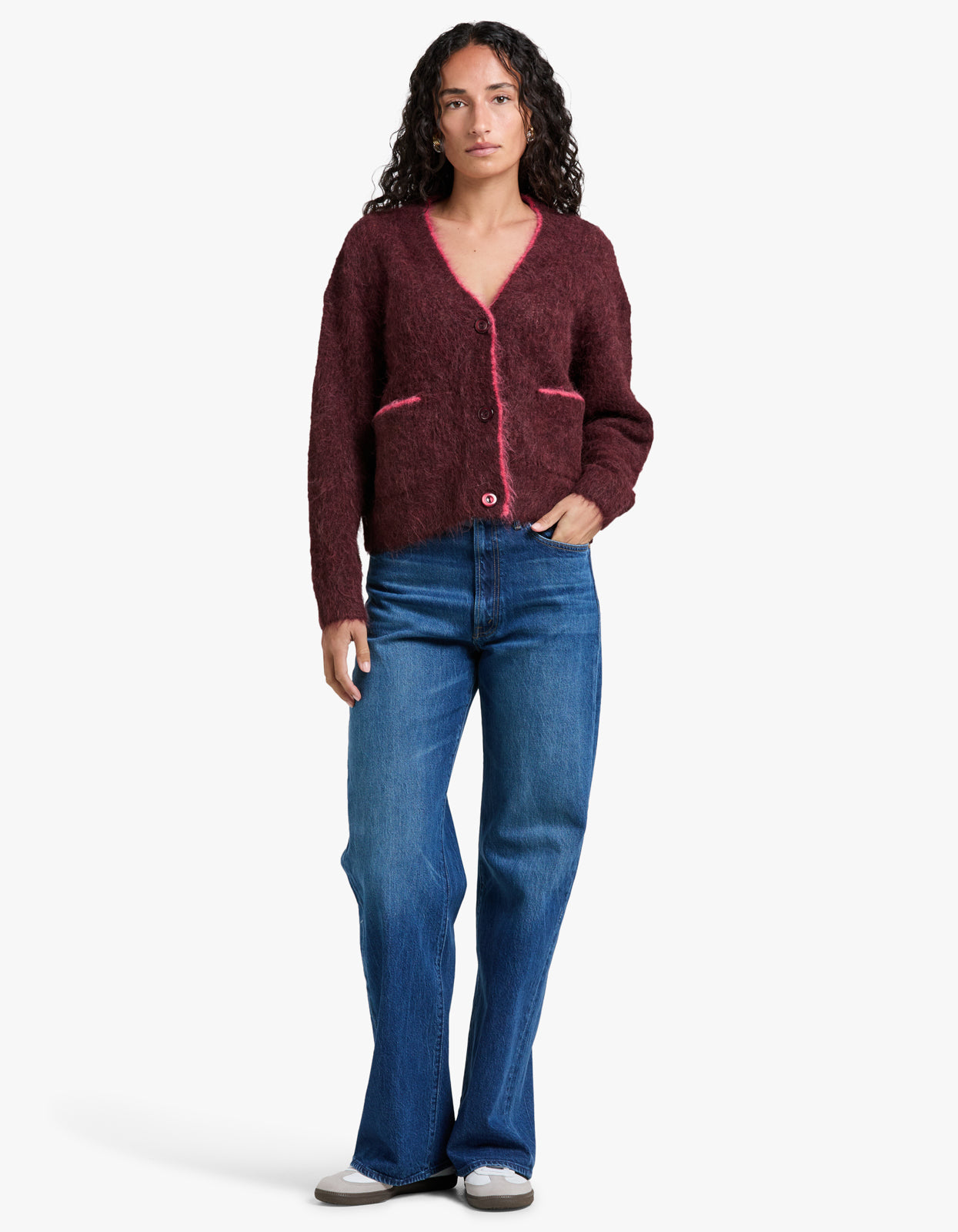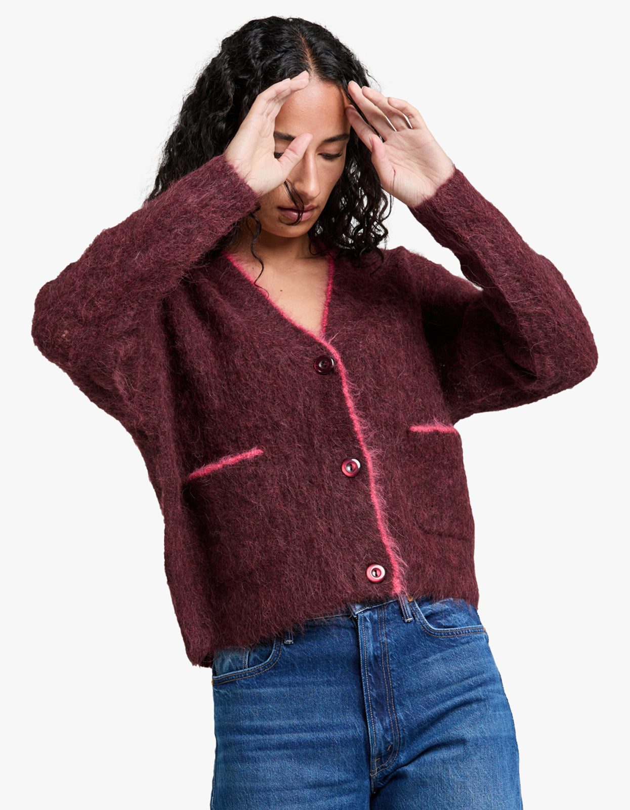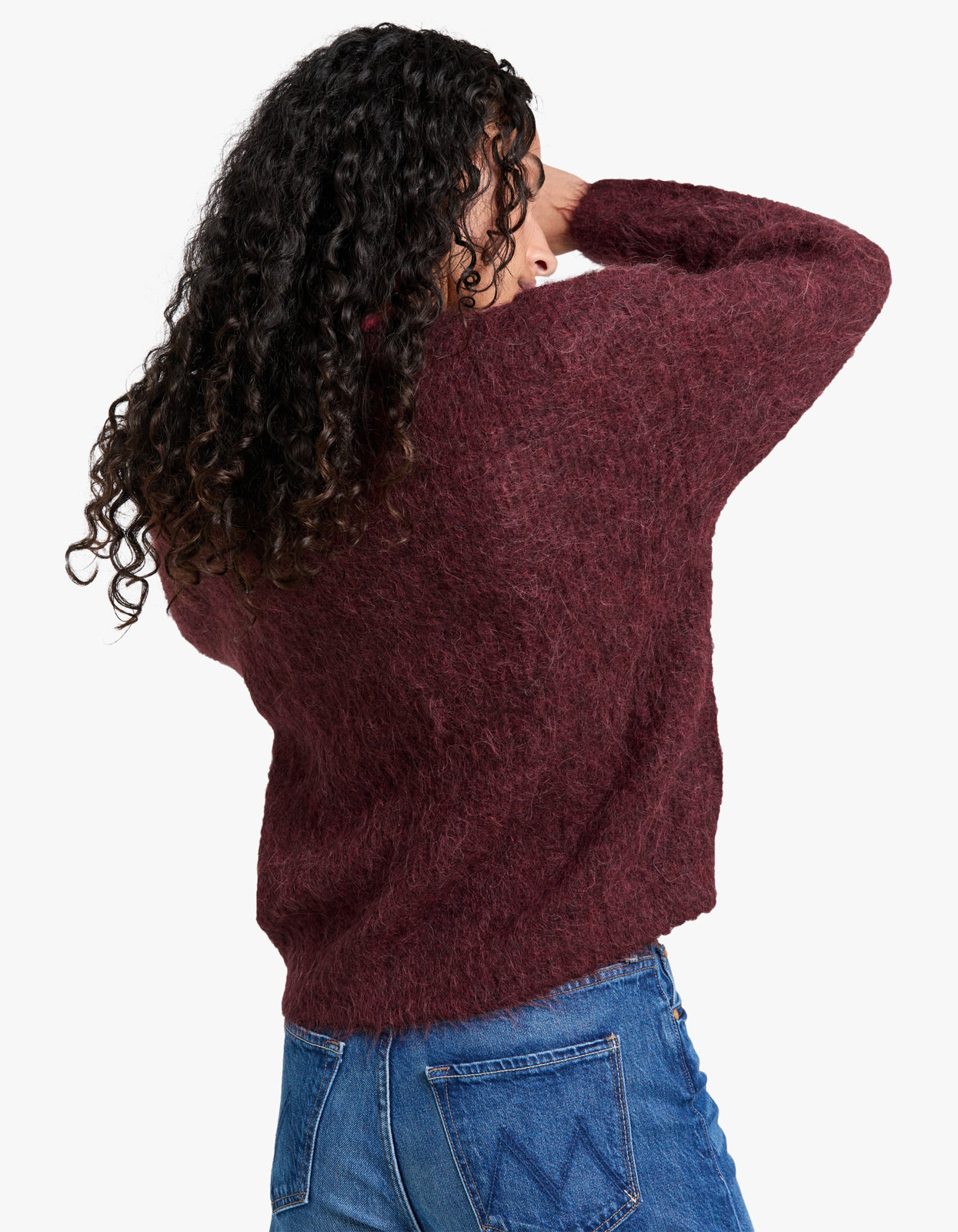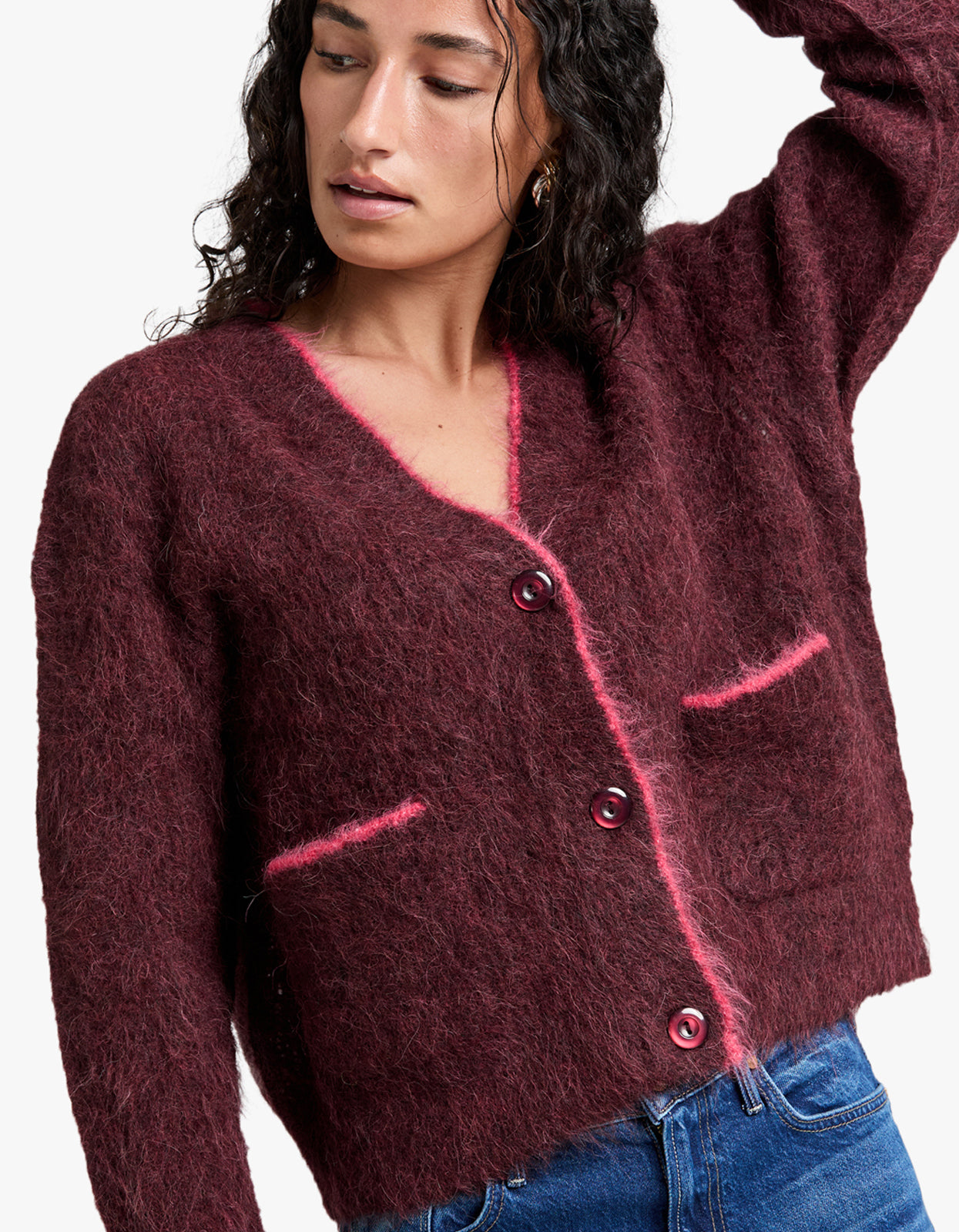 Its airy and feminine knit is designed for both comfort and style, making it the perfect piece to layer over a t-shirt or dress. Elevate your look with this delicate and sophisticated cardigan in a luxurious burgundy black melange color.