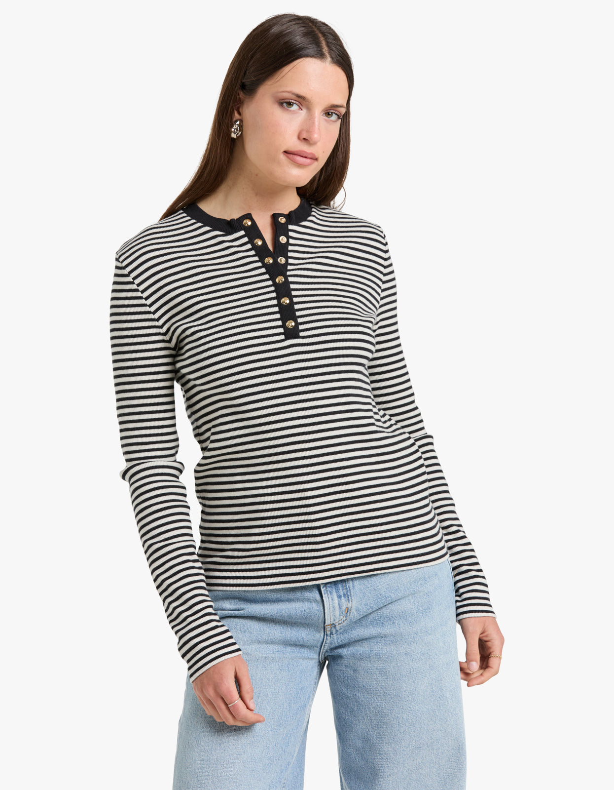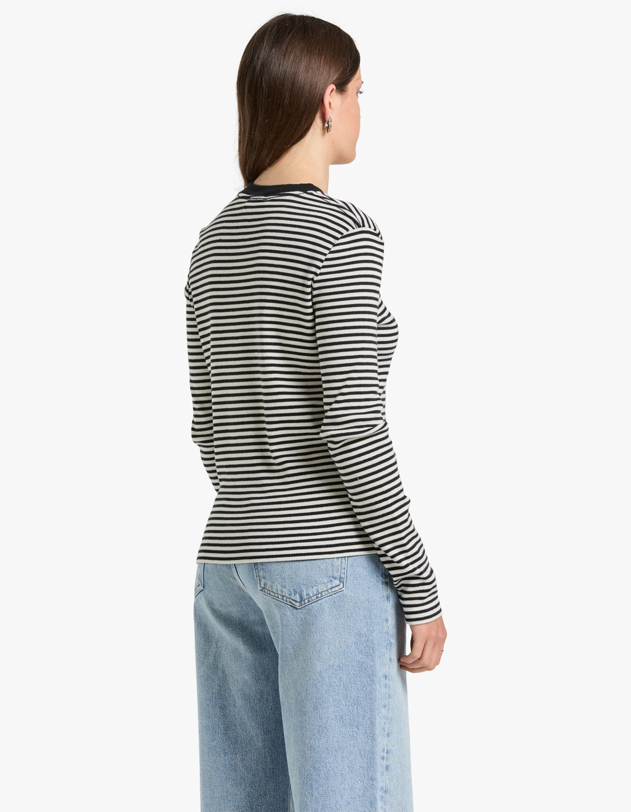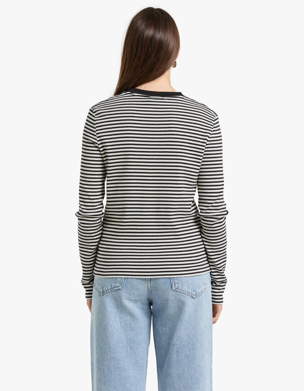 Indulge in effortless style with our Alessia Long Sleeve Tee in Cream and Black Stripe from Anine Bing.