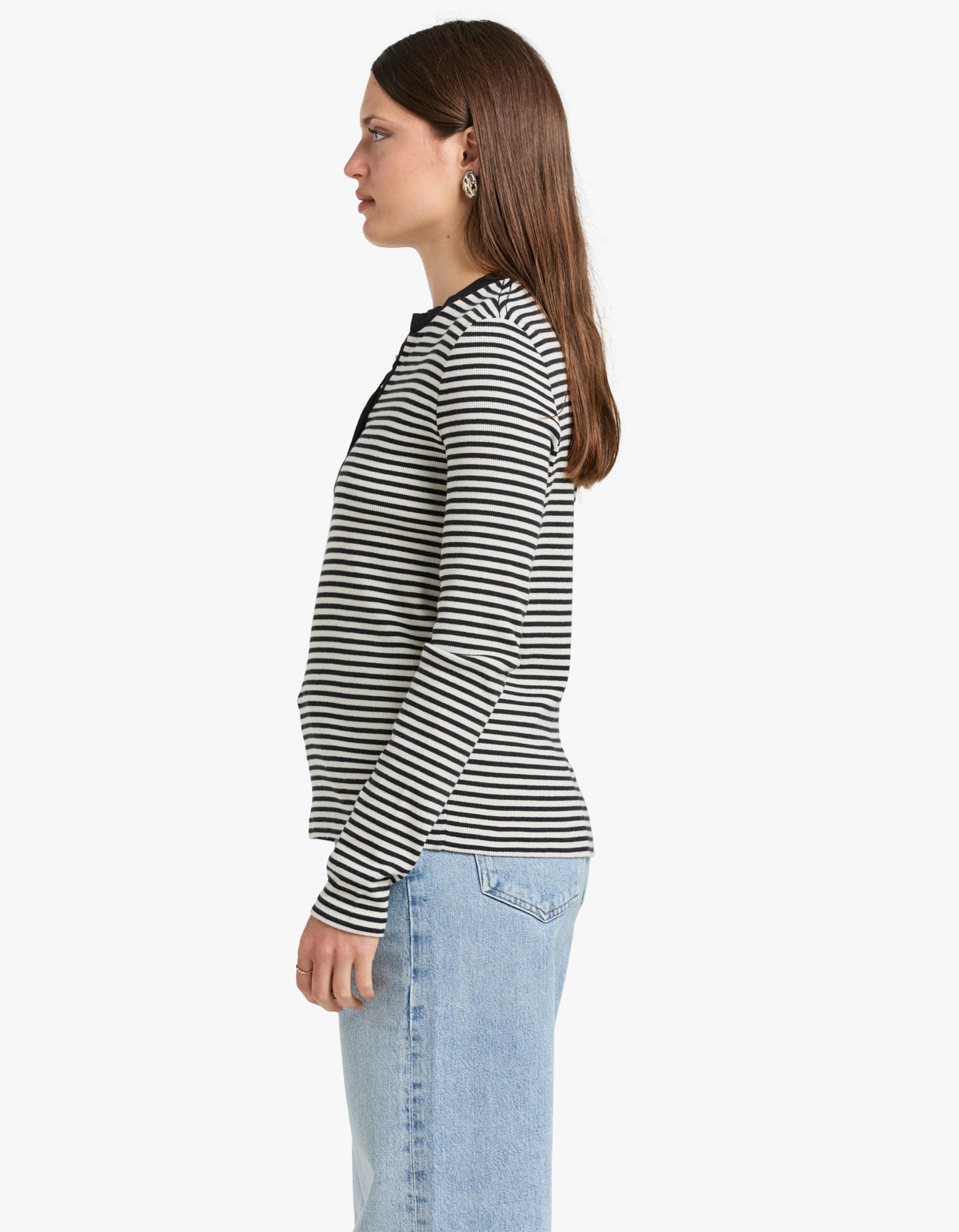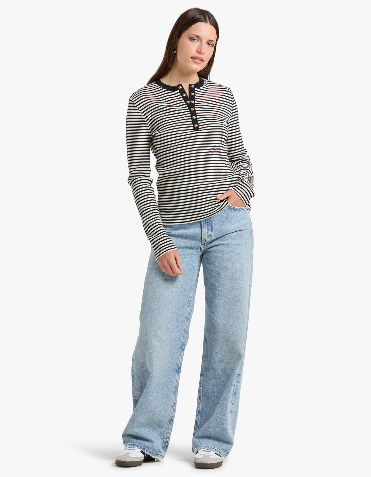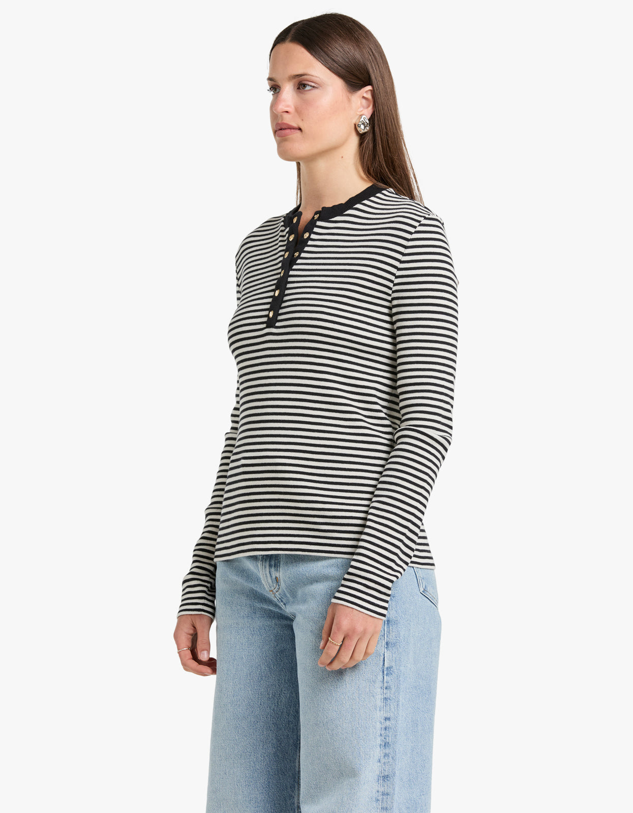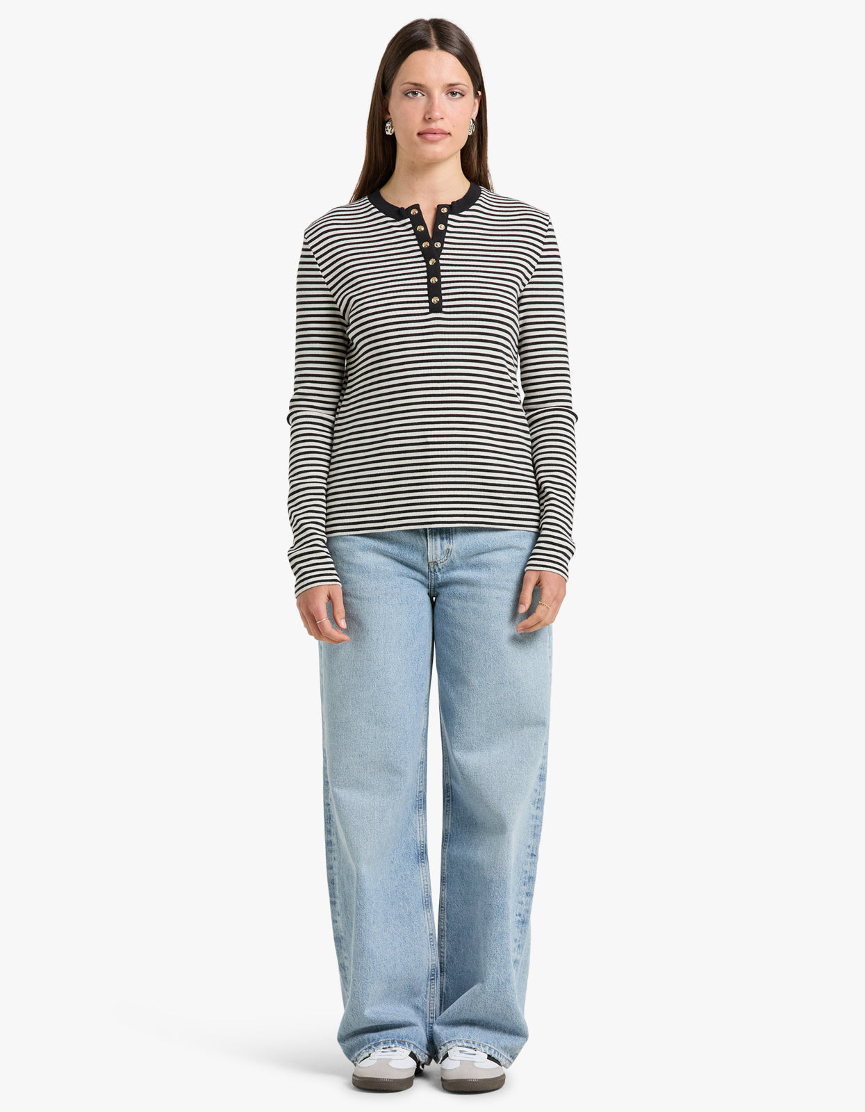 Indulge in effortless style with our Alessia Long Sleeve Tee in Cream and Black Stripe from Anine Bing.