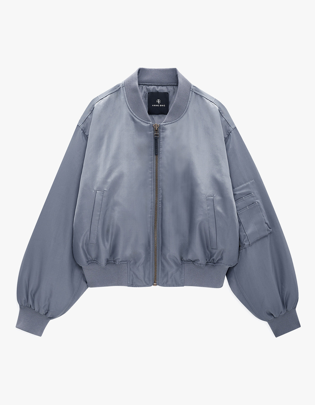 - Classic bomber silhouette with ribbed cuffs, hem, and collar