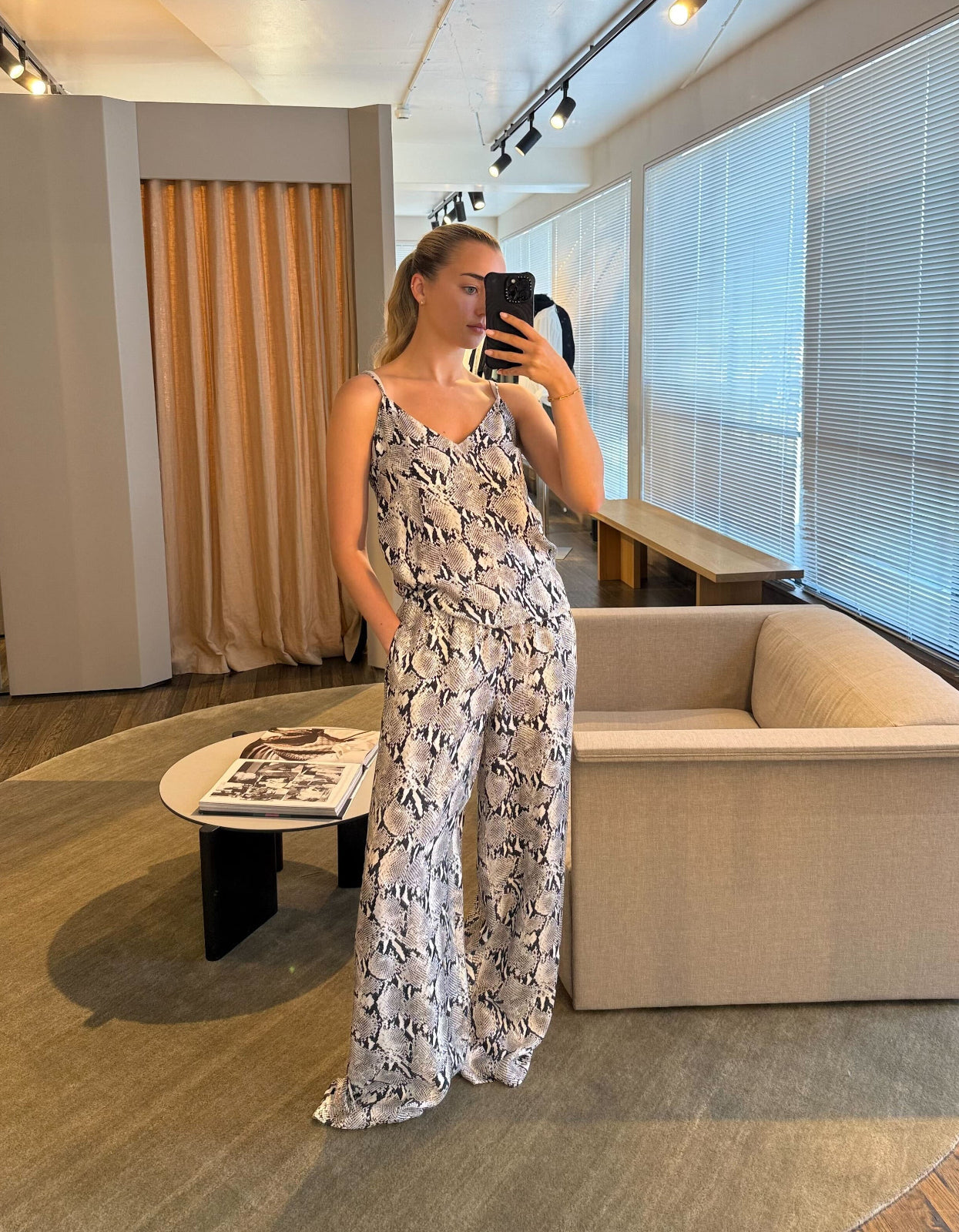 The Ellen Top by Anine Bing is a women’s top category, designed in a soft python-inspired pattern that blends muted neutral tones for a modern, refined finish. Its fluid fabric and relaxed silhouette create an effortlessly elevated look suitable for both casual styling and more polished occasions.
