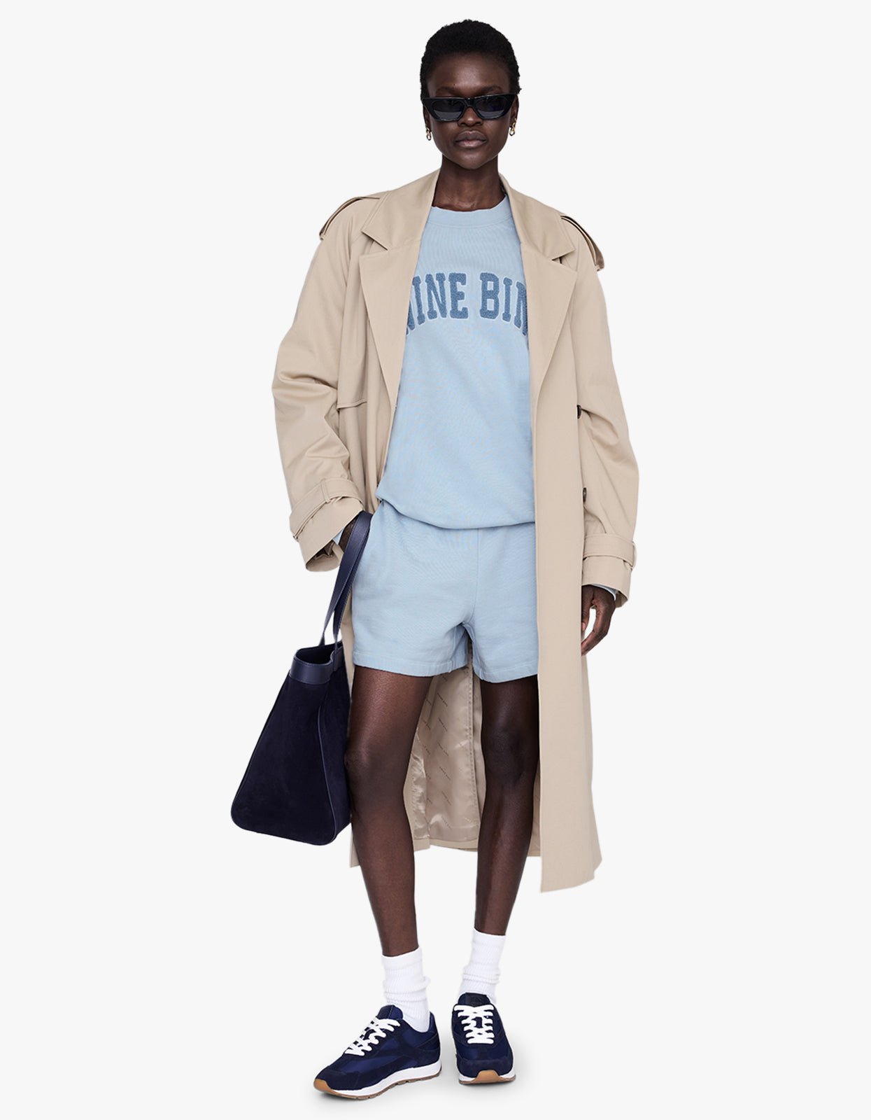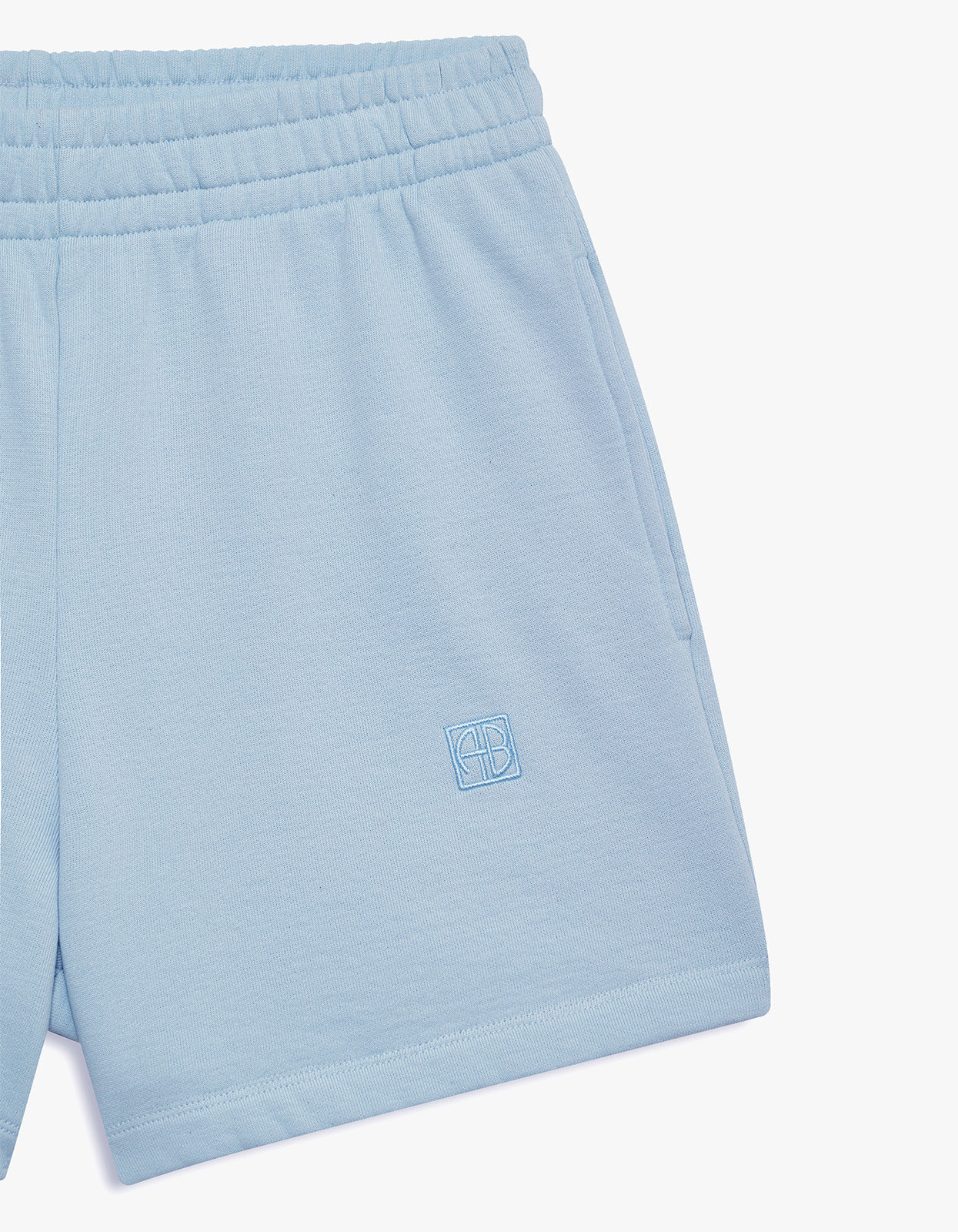 Crafted from 100% cotton fleece, these Kam shorts deliver effortless comfort with considered design details. A concealed drawstring waistband ensures a tailored fit, while slanted front pockets and dual back welt pockets provide practical functionality. The embossed, framed ANINE BING monogram on the left thigh introduces a subtle signature touch. In soft pale blue, they transition seamlessly from relaxed lounging to casual outings, balancing understated elegance with everyday wearability.