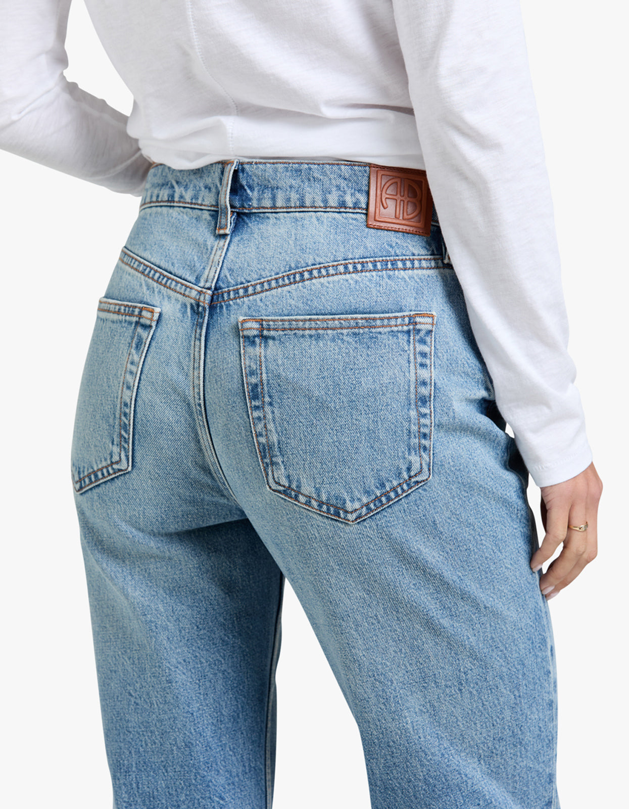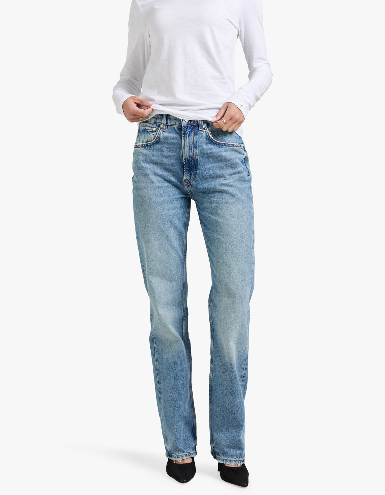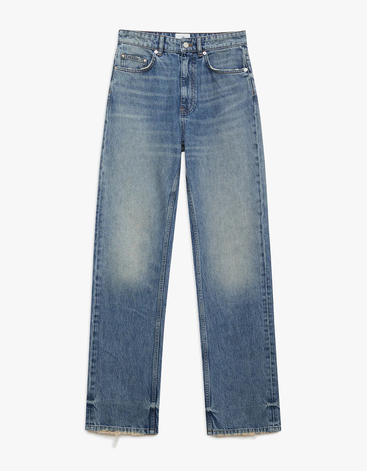 Made from midweight 100% regenerative cotton denim, these high-rise jeans feature a button-fly closure and a straight-leg cut, delivering a refined, timeless silhouette. The medium blue wash and clean-edge hem with subtle distressing add understated character, perfect for pairing with both casual and tailored looks.