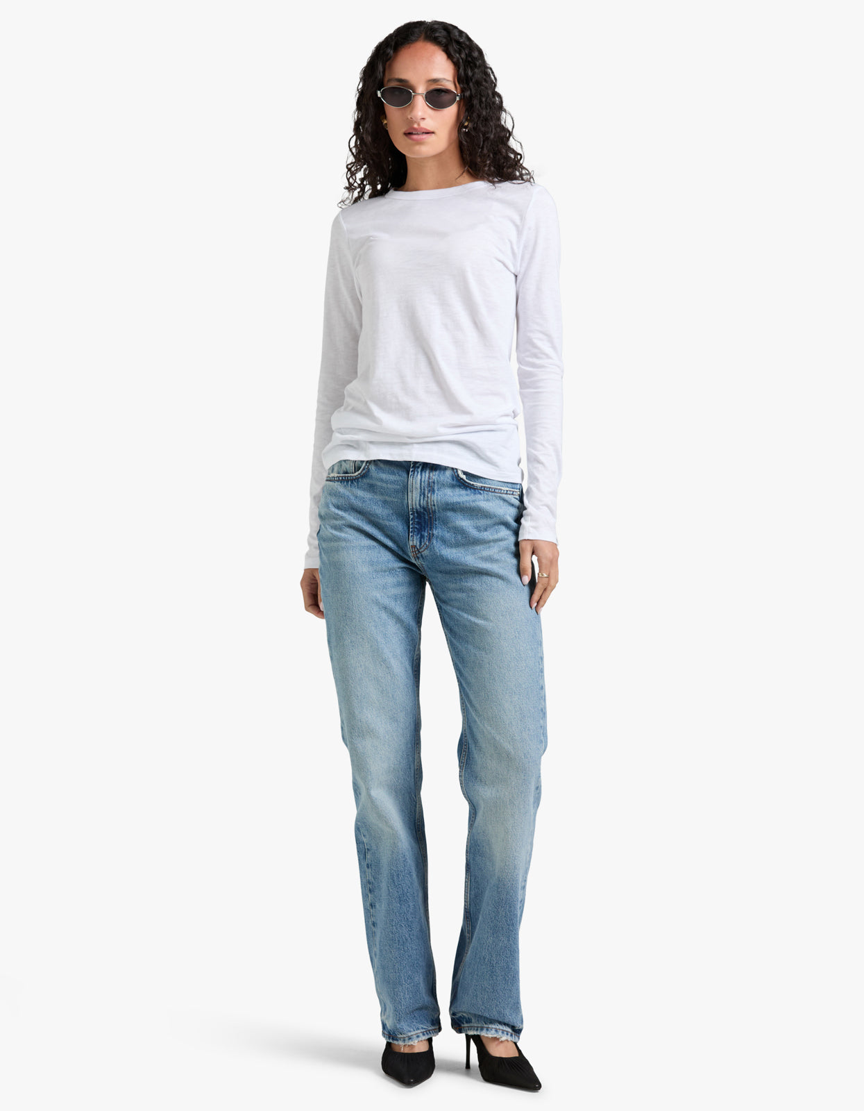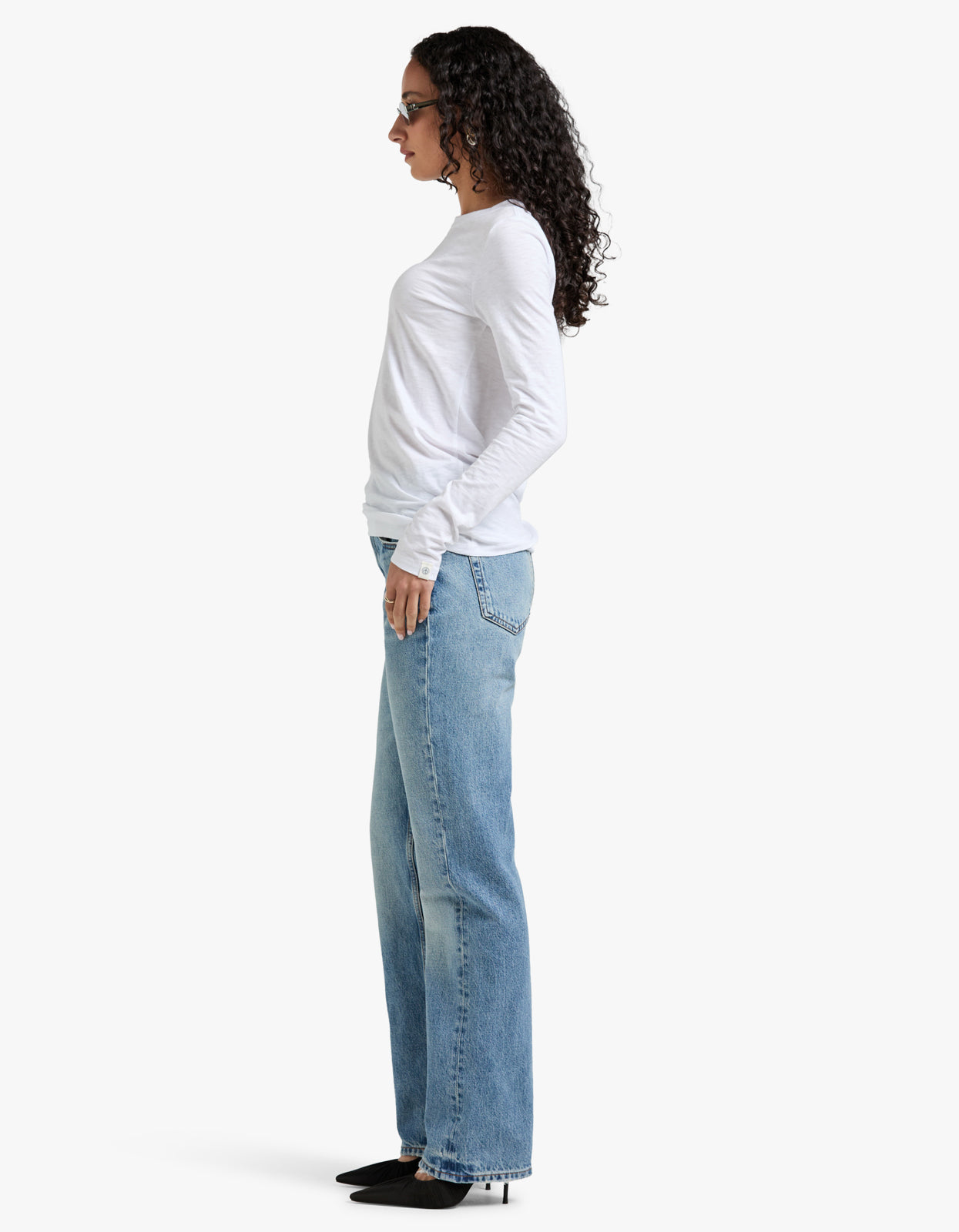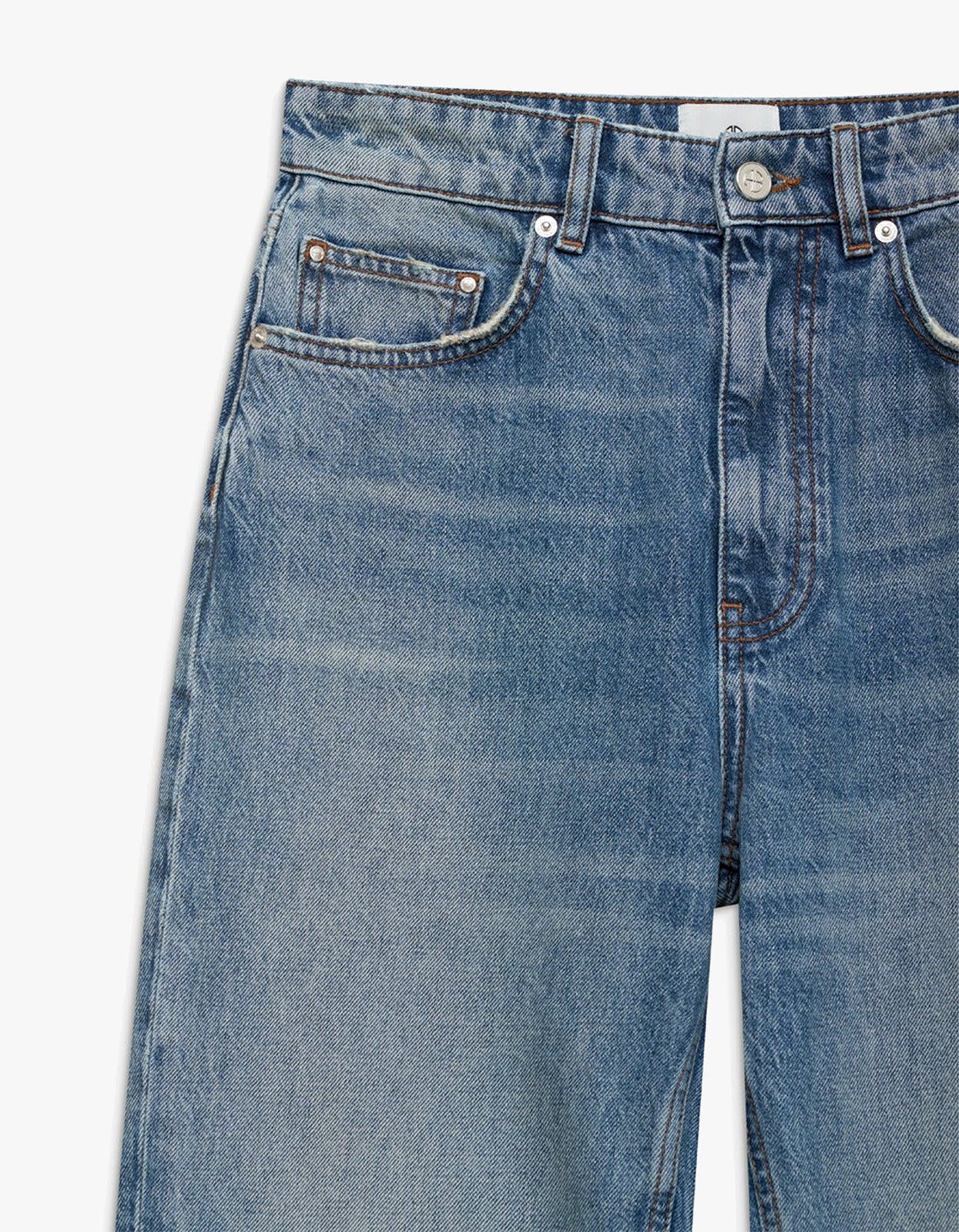 Made from midweight 100% regenerative cotton denim, these high-rise jeans feature a button-fly closure and a straight-leg cut, delivering a refined, timeless silhouette. The medium blue wash and clean-edge hem with subtle distressing add understated character, perfect for pairing with both casual and tailored looks.