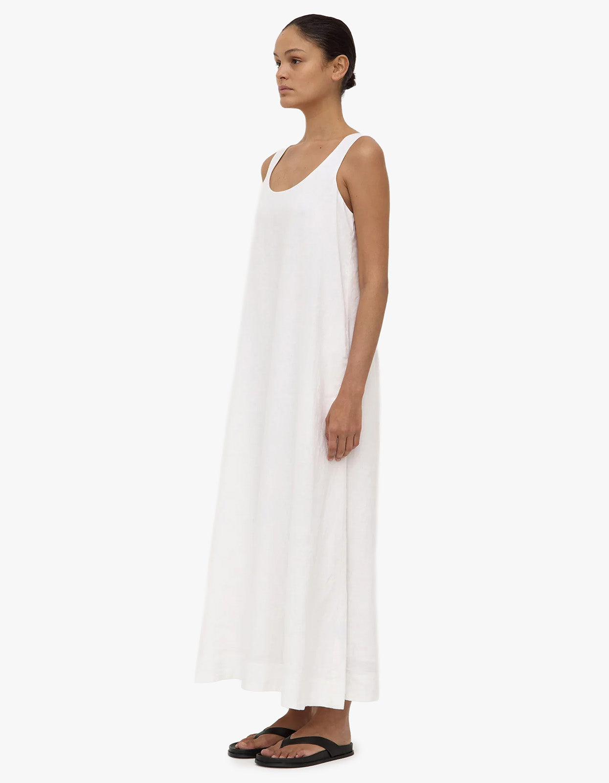 Crafted from breathable 100% linen, this A-line design drapes beautifully while the scoop neckline offers a refined touch. Functional side pockets add understated sophistication. Perfect for warm weather occasions, from casual outings to relaxed gatherings.