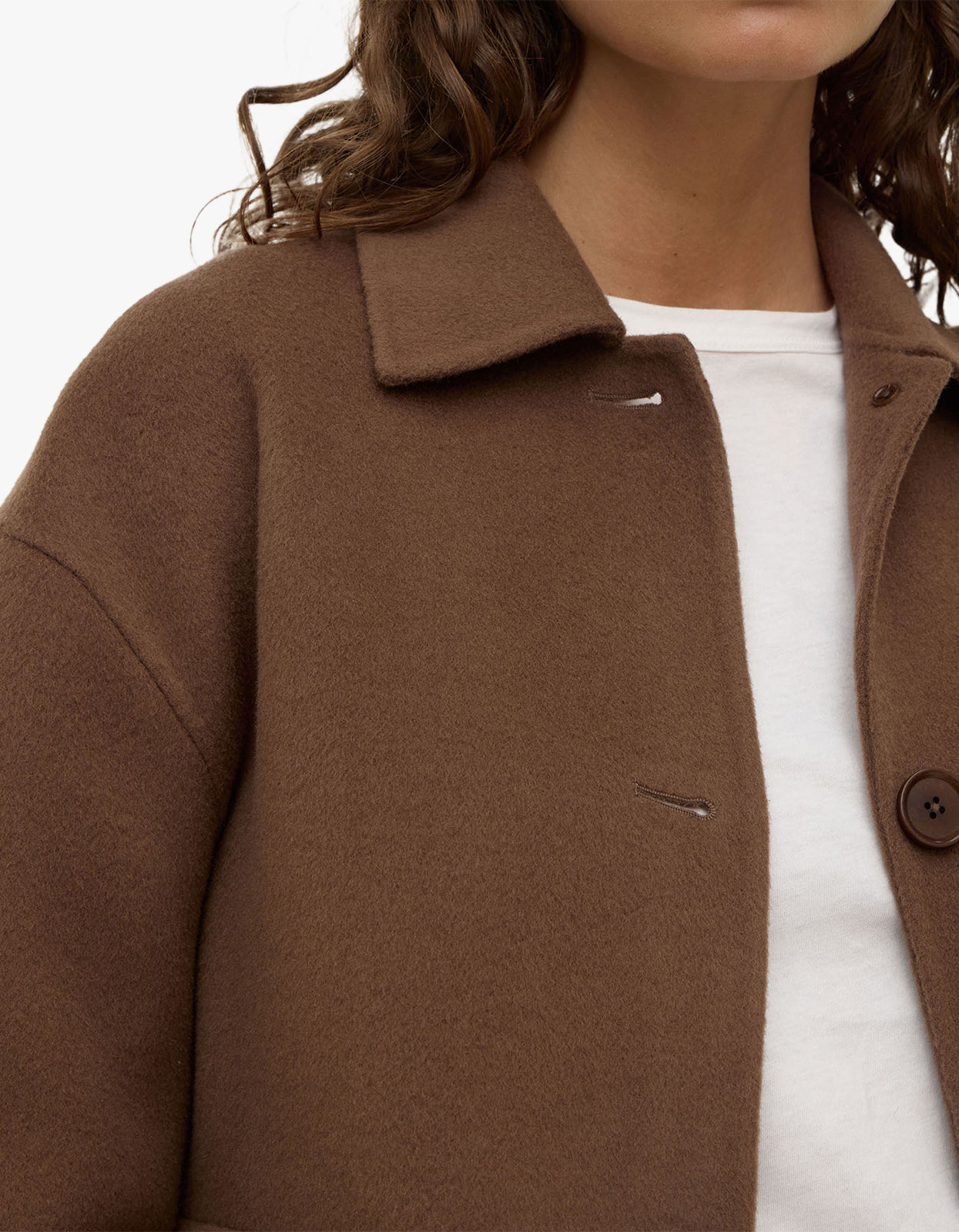 Elevate your outerwear collection with the Assembly Label Mya Wool Jacket in Milk Choc—a 100% wool essential with a two-piece collar and front button closure for timeless, sophisticated style.