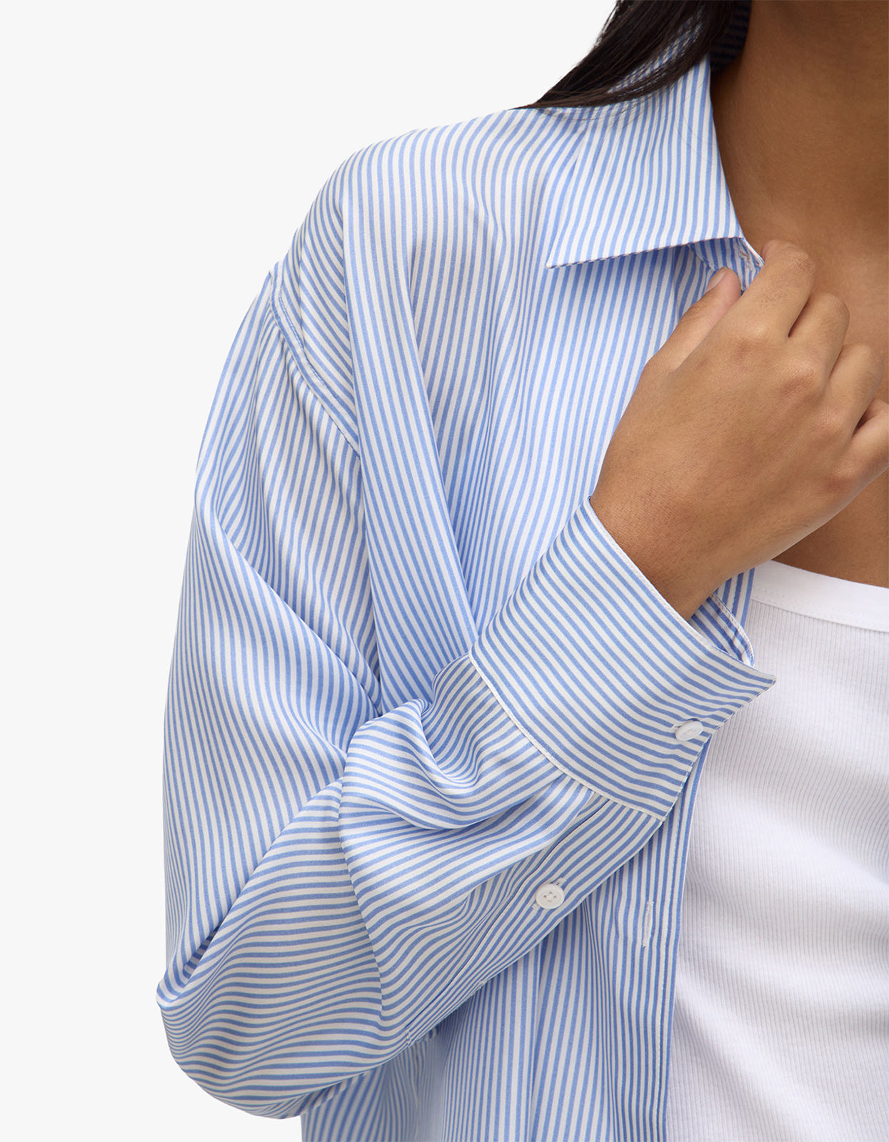 Crafted with luxurious blue and white stripes, this shirt exudes elegance and exclusivity. The perfect combination of art and fashion, it offers a refined and polished look for any occasion. Elevate your wardrobe with this must-have piece.