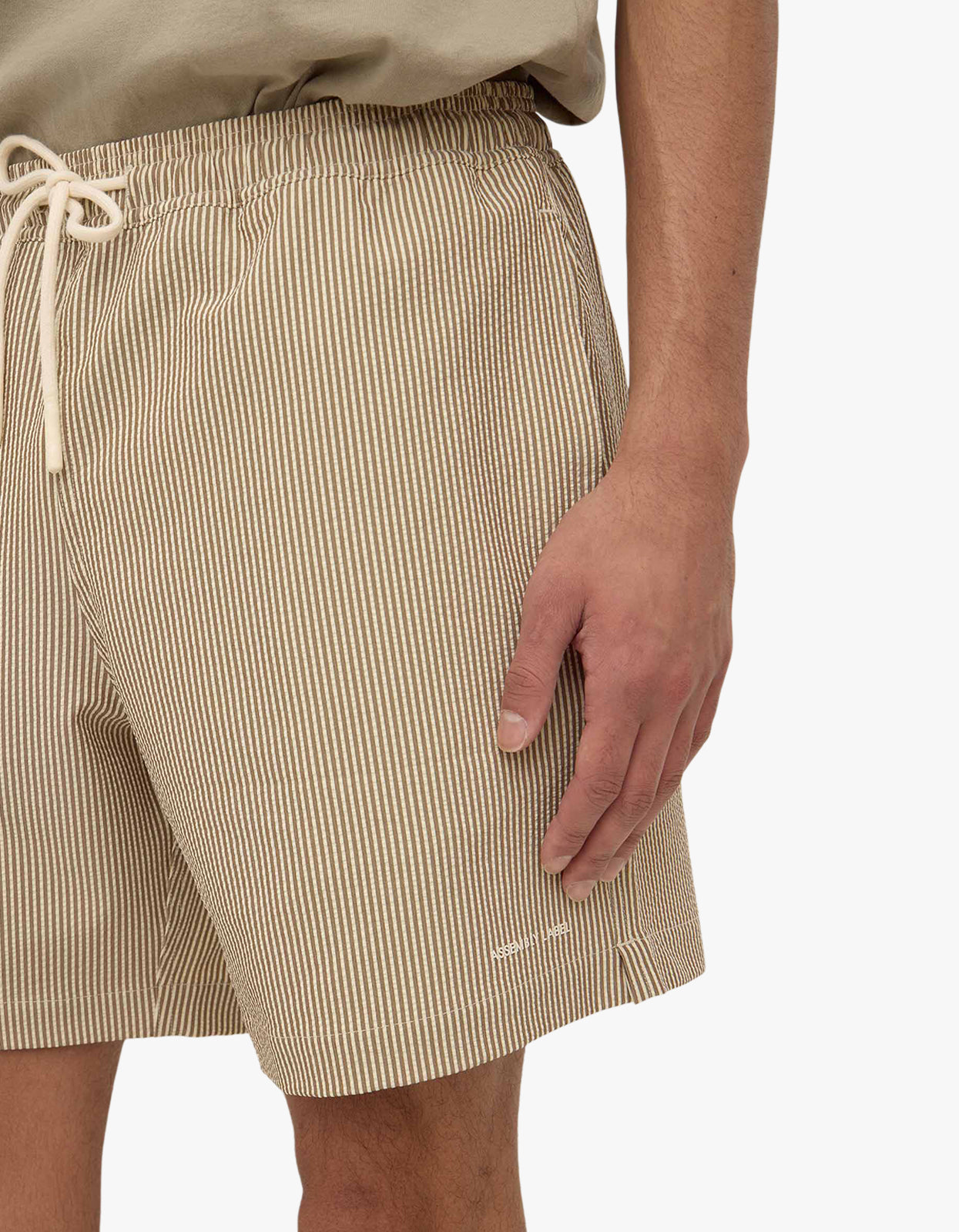 Crafted with an elasticated waist for a secure fit and finished with a refined cotton drawcord, these shorts deliver both style and functionality. The biscuit and limestone colourway offers a versatile neutral palette that transitions effortlessly from poolside to casual wear. Designed for the discerning man who values quality construction and timeless aesthetics.