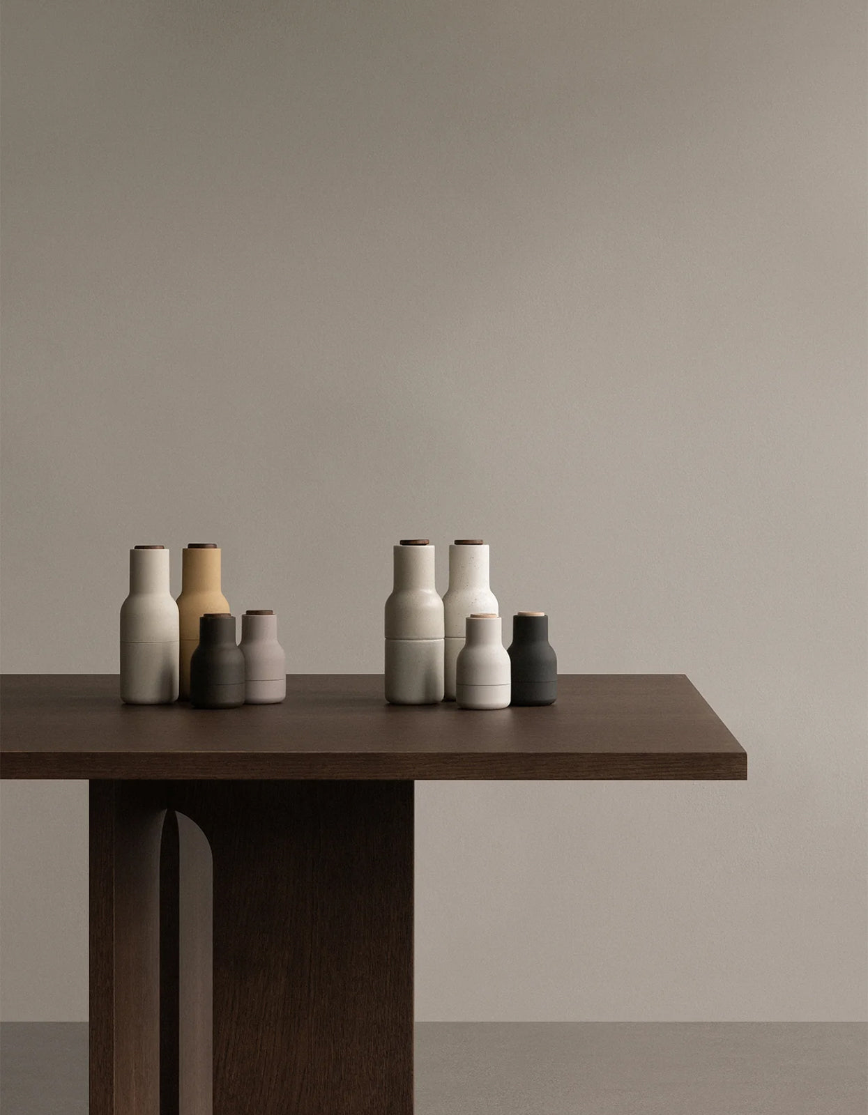 The Small Bottle Grinder by Audo features two compact salt and pepper mills with durable ceramic mechanisms.