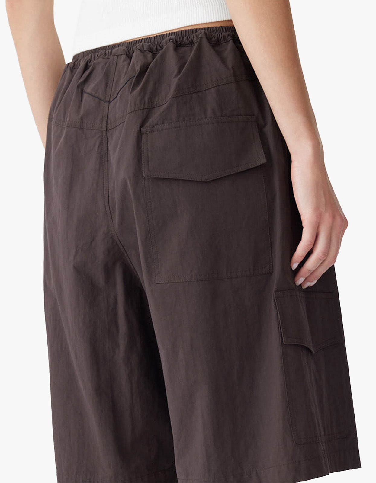 The Bassike Crushed Cotton Cargo Short is a voluminous pull-on short crafted from crushed cotton for a soft, textured finish in a rich chocolate brown shade. Designed with a fine elasticated waistband and premade drawcord, it combines effortless style with functional cargo details for everyday wear.