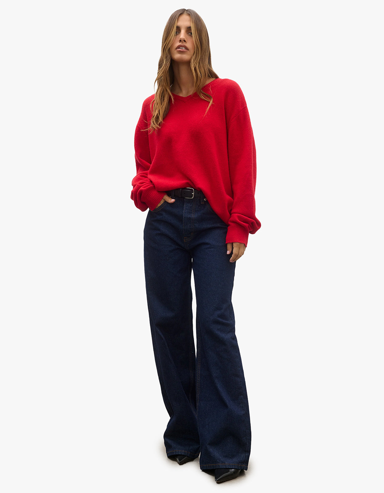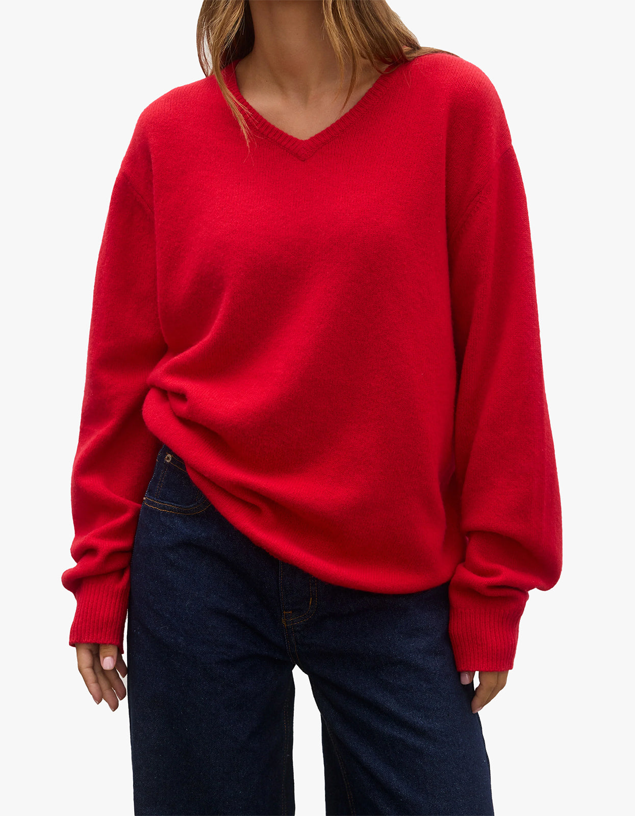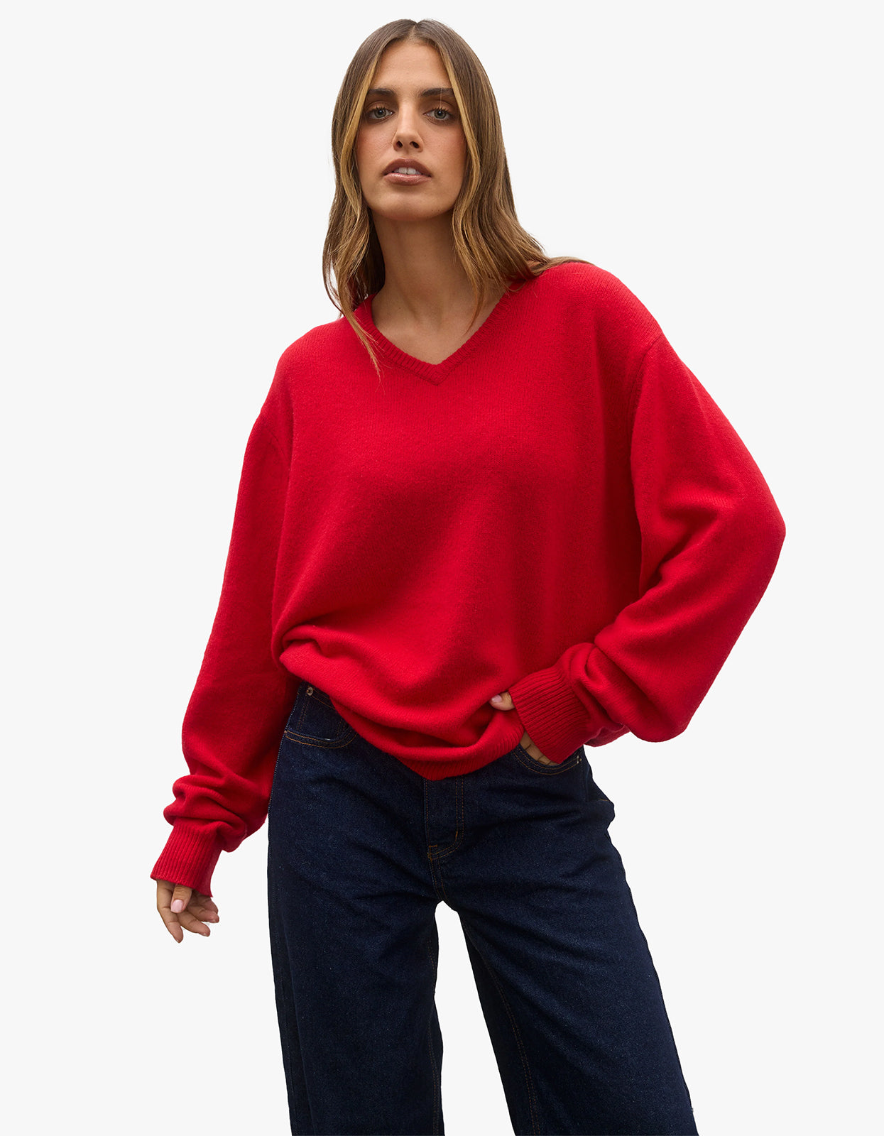 This exquisite sweater boasts a stunning cherry red colourway and features a flattering v neck and ribbed hem and cuff. Stay warm and stylish with its long sleeves, while making a bold statement with its sophisticated design. Elevate your wardrobe with this must-have piece.