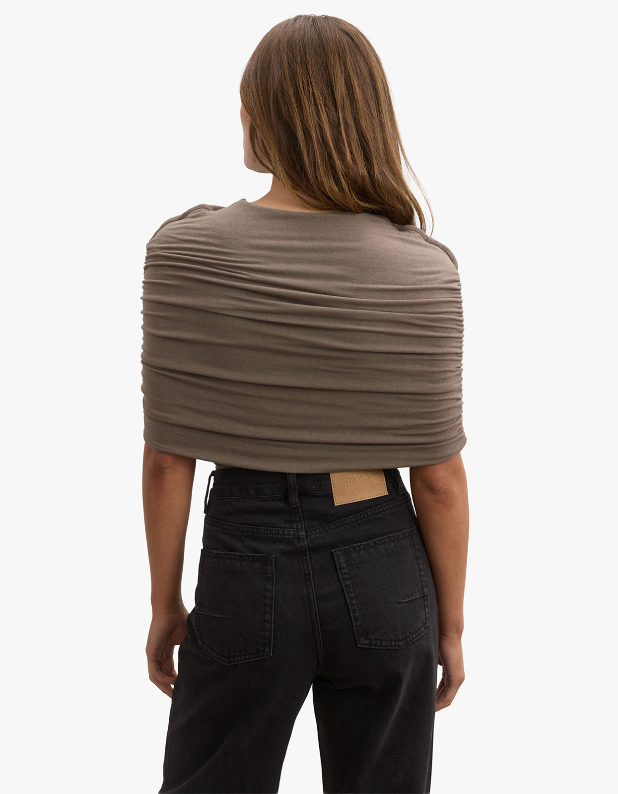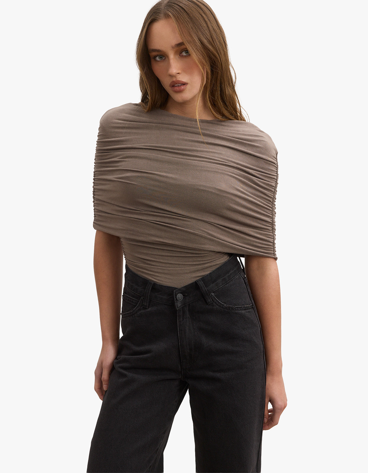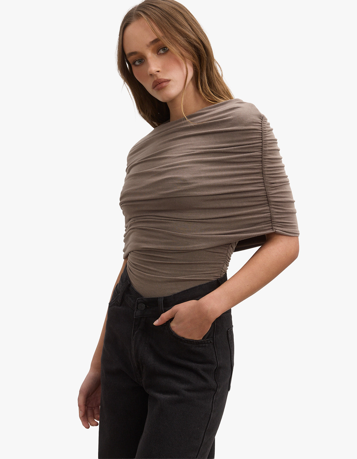 Cut from soft stretch fabric with a high neckline and all-over ruching, it contours the body with a flattering, form-fitting silhouette that moves effortlessly from day to night.
