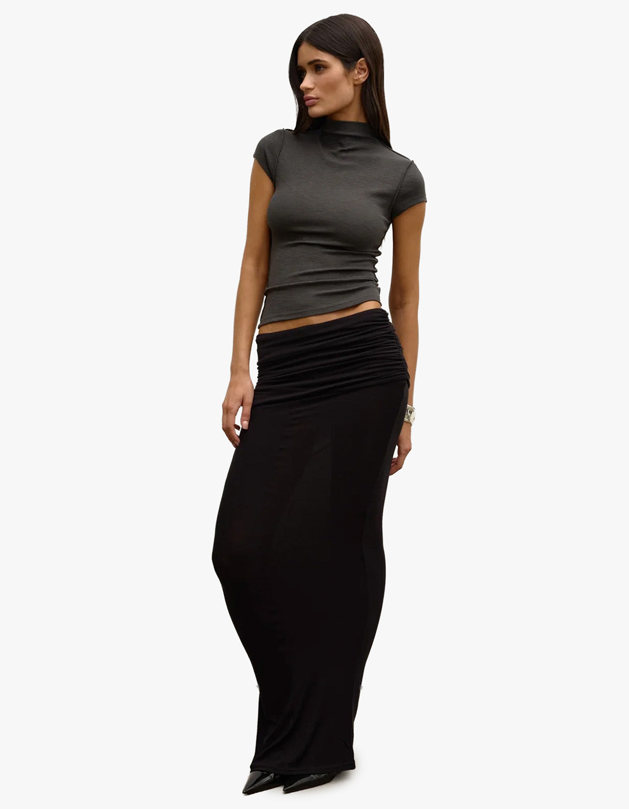 Designed with a high neckline and subtle cap sleeves, this fitted style is crafted from a soft stretch rib fabric. Featuring exposed seam detailing for a modern finish, it’s an elevated essential for effortless everyday wear.