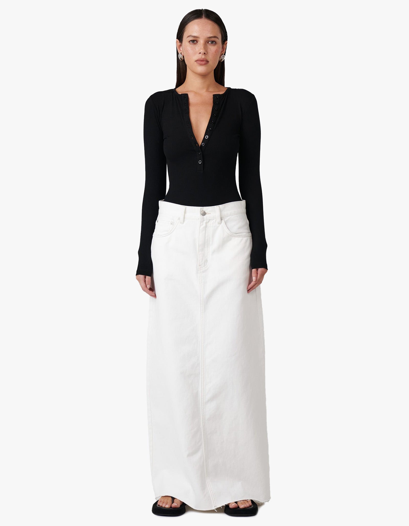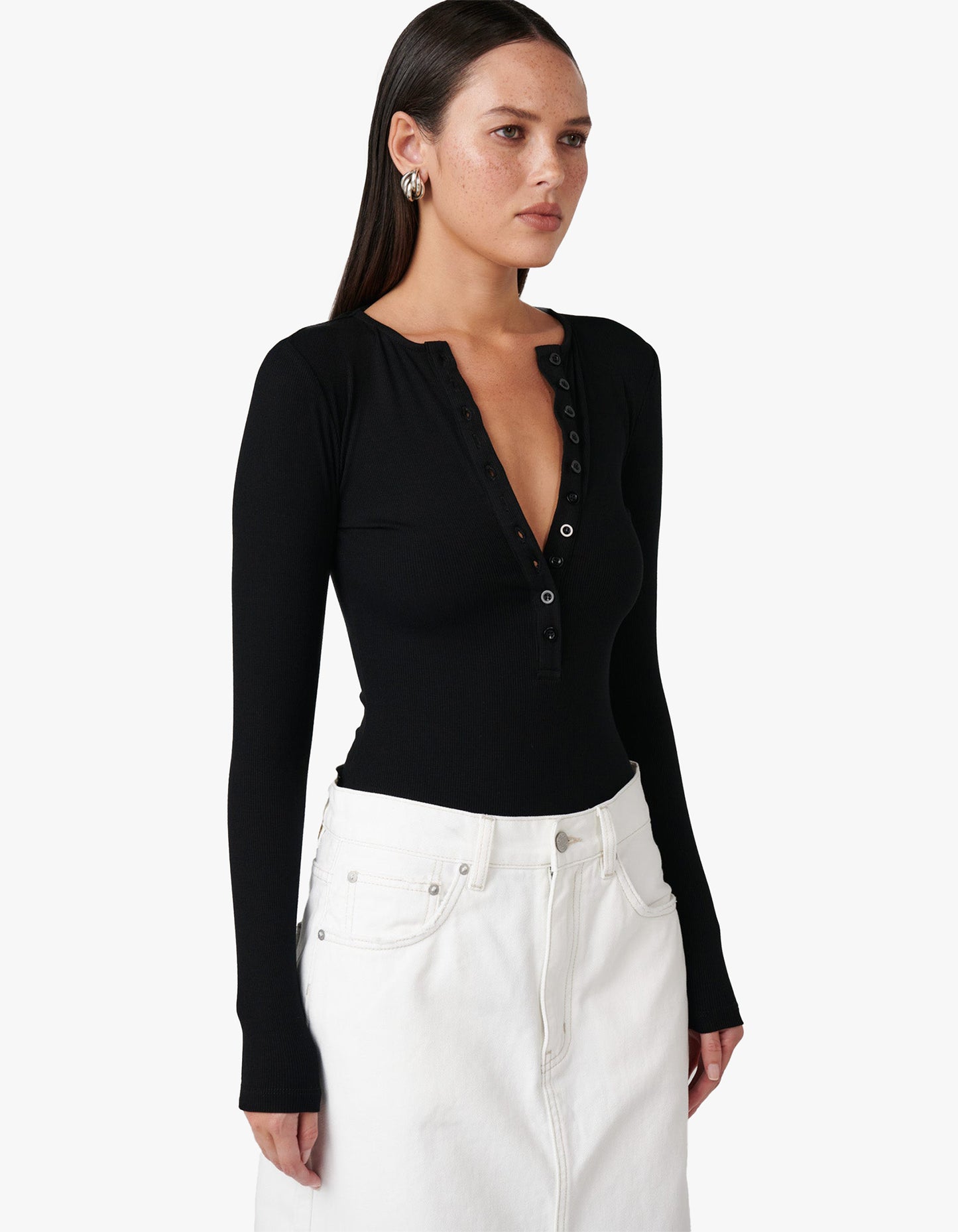 Modern and minimal - the Lara Bodysuit from BAYSE is one of their top-selling styles. Featuring a high crew neckline, button down feature through the front of the garment and a fitted silhouette. Highly versatile, this long sleeve design made from a slightly ribbed fabrication is set to become an instant go-to season after season.