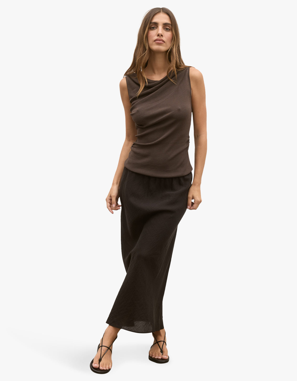 The Monet Top in Slate features a soft, stretch-knit fabric that elegantly drapes across the neckline. Its flattering fit enhances your silhouette while offering comfort and versatility, making it an essential piece for refined, effortless everyday style.
