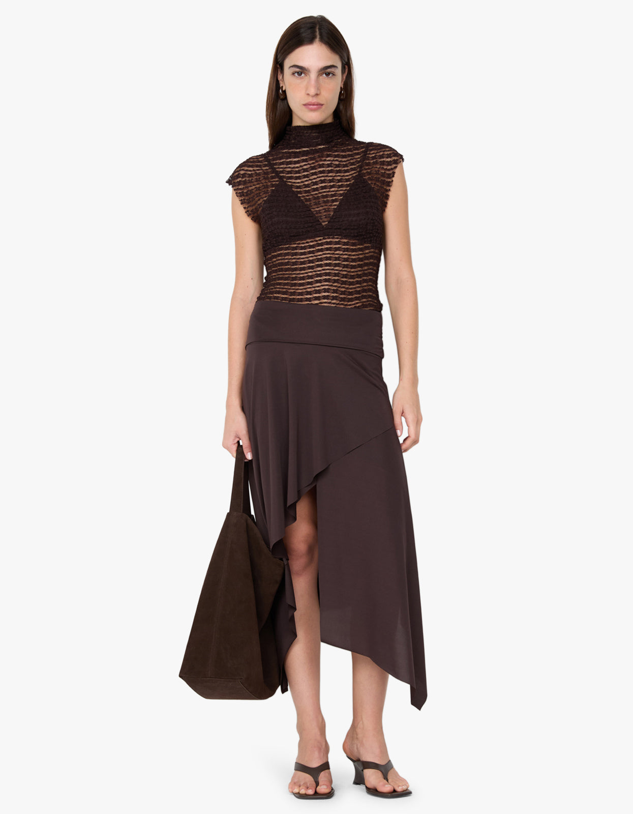 This chic top, crafted from a textured stretch lace, features a sophisticated funnel neckline and a sheer design, perfect for a night out or elevated evening styling.