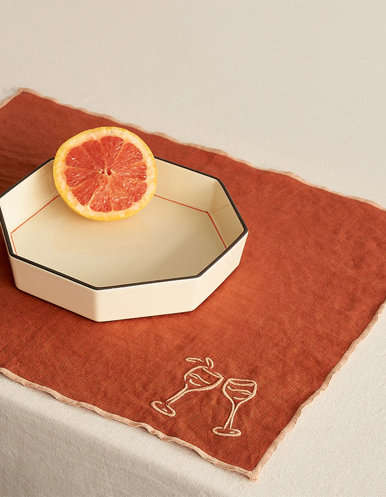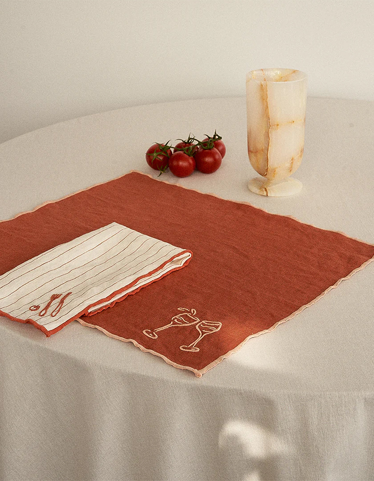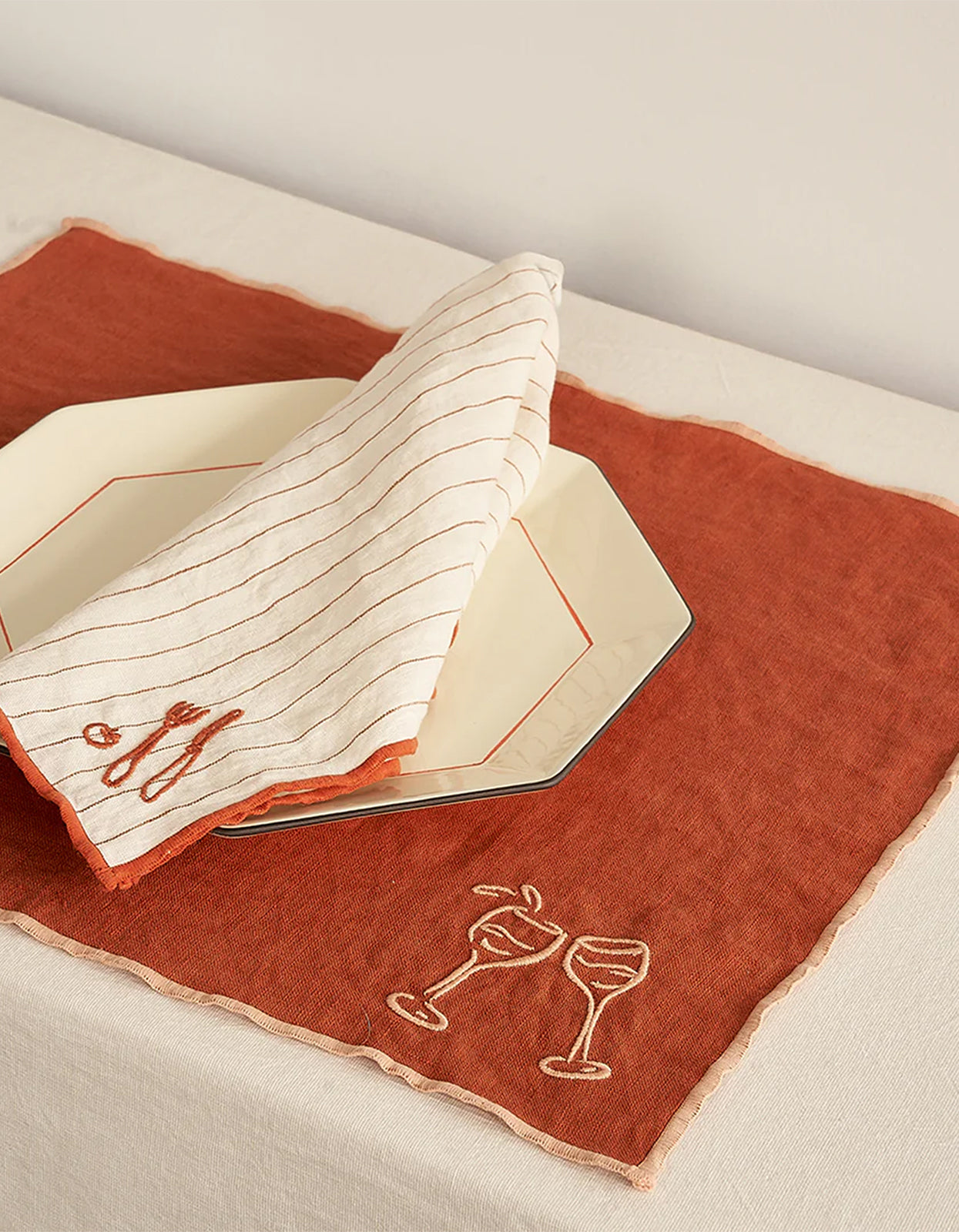 Crafted from 100% French linen, these placemats showcase vibrant colours and intricate embroidery inspired by joyful gatherings. Their refined design adds a touch of warmth and elegance, making every meal feel special and inviting.