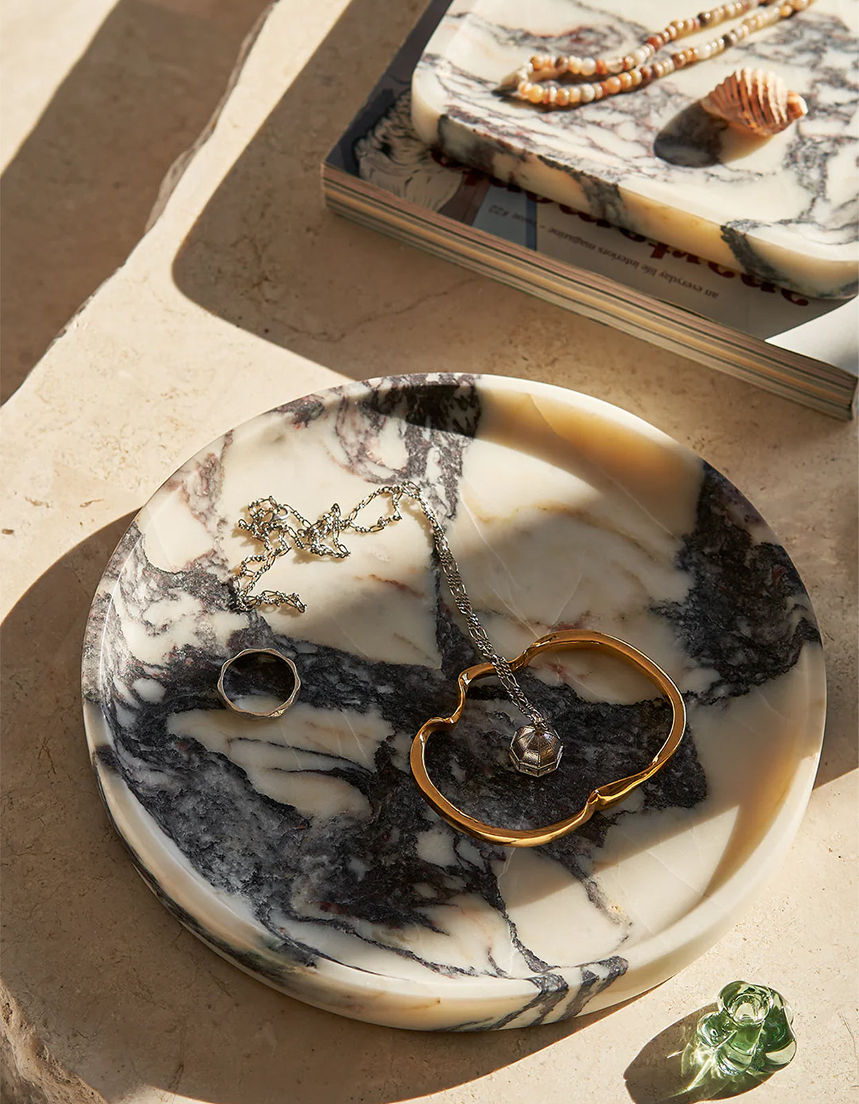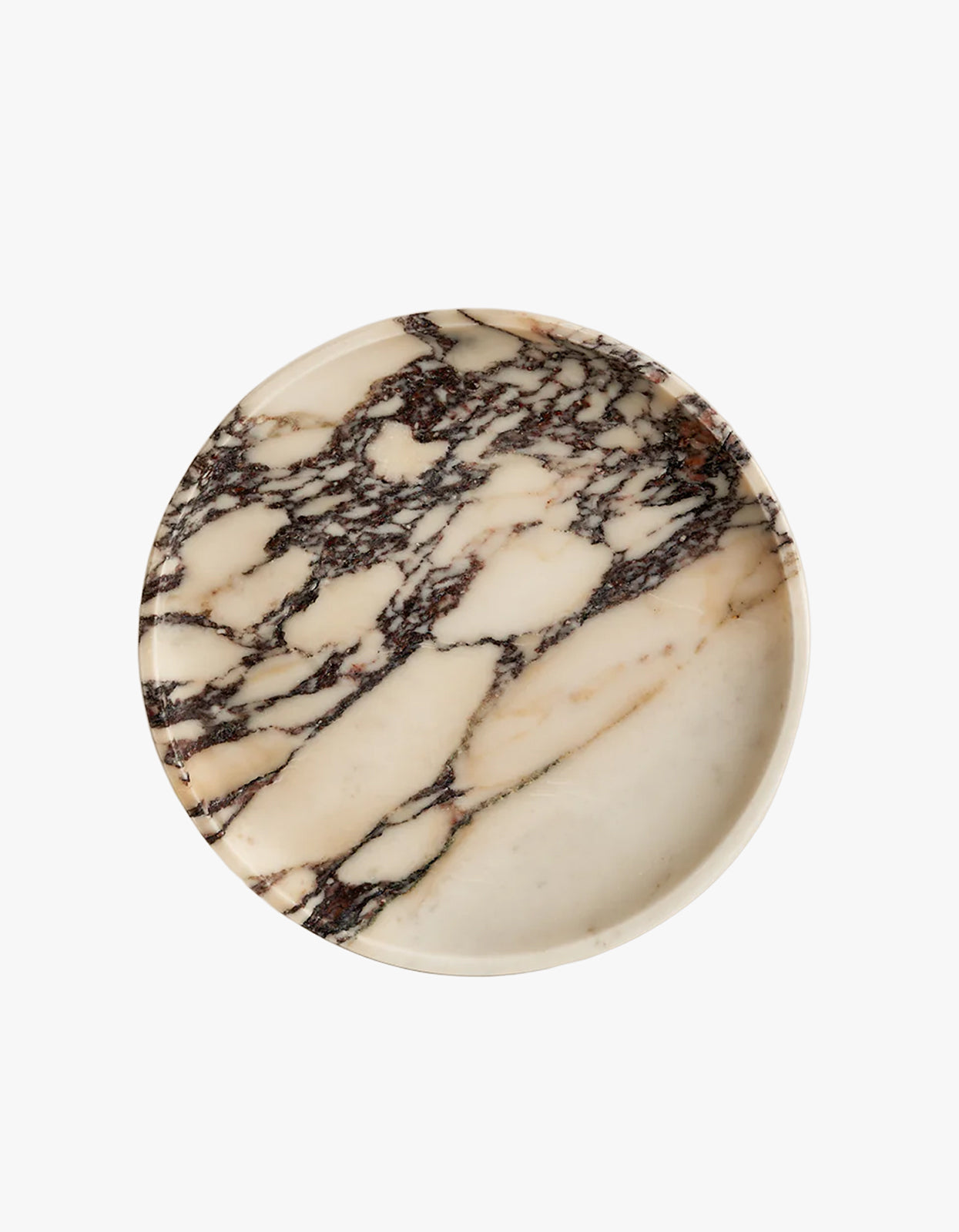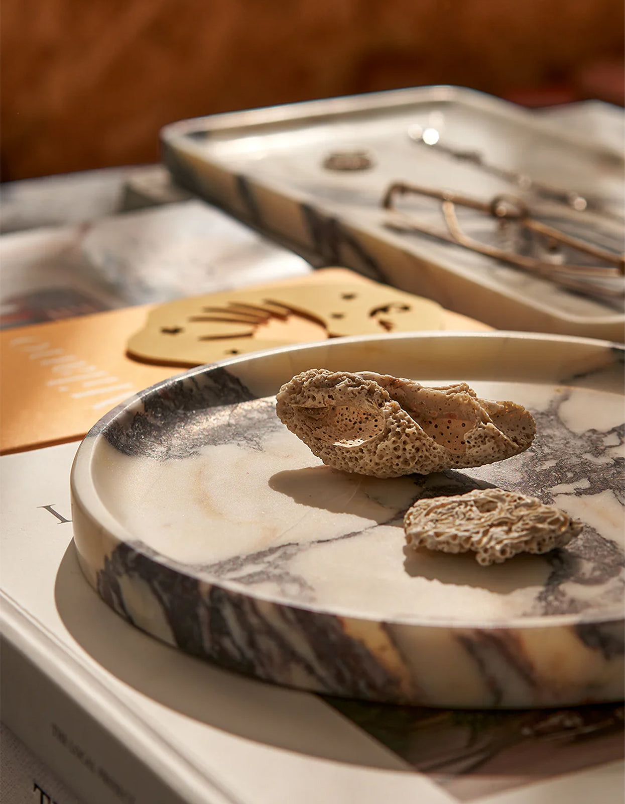 The Linea Round Marble Tray in Calacatta Viola from Black Blaze showcases exquisite violet veining on premium marble, blending minimalist design with organic elegance.