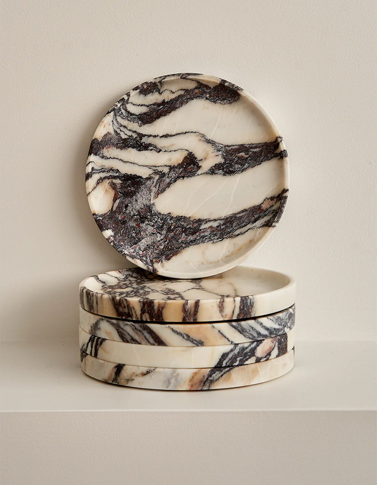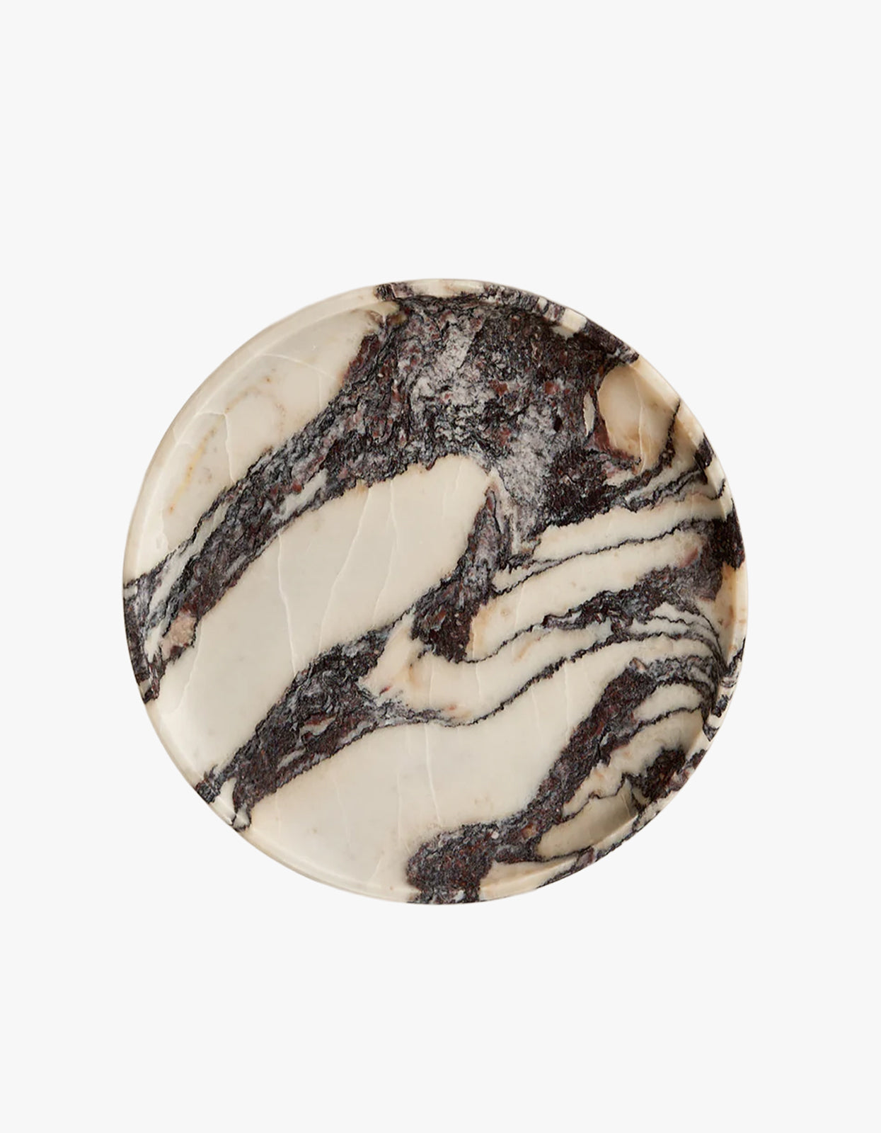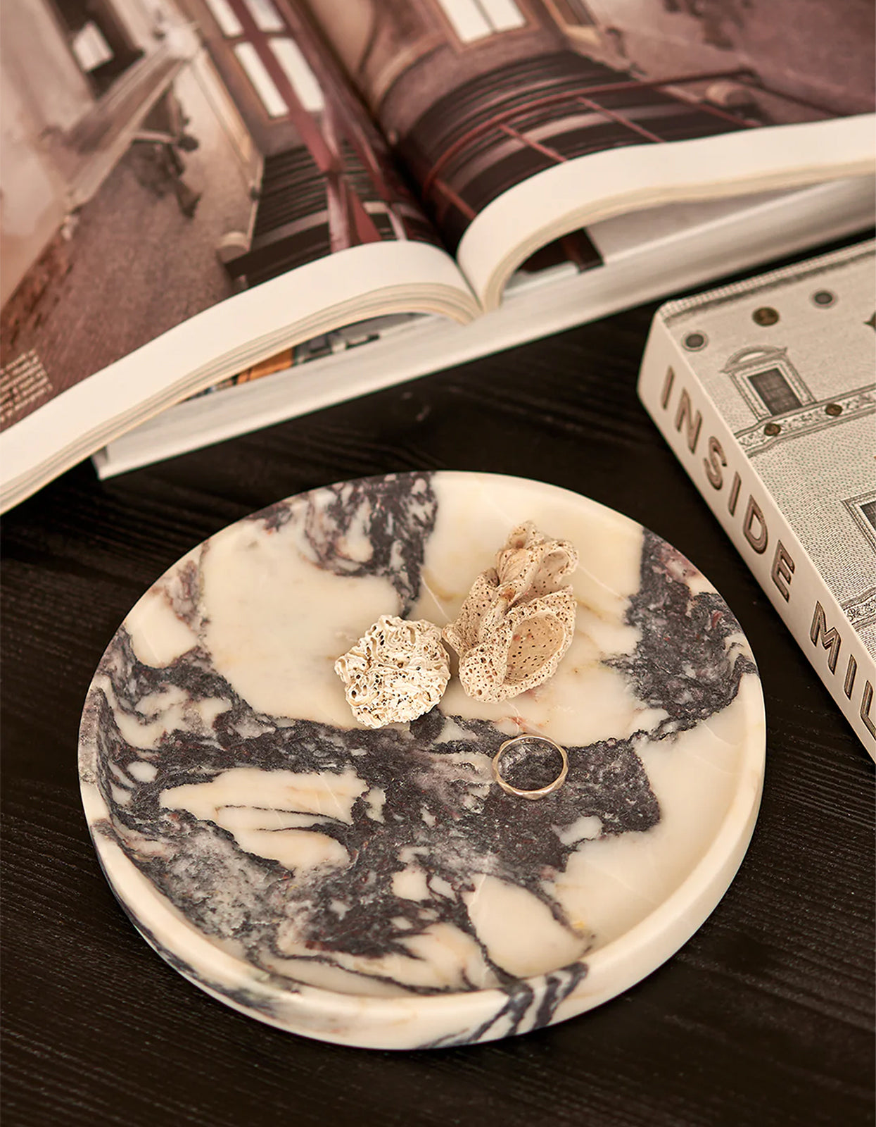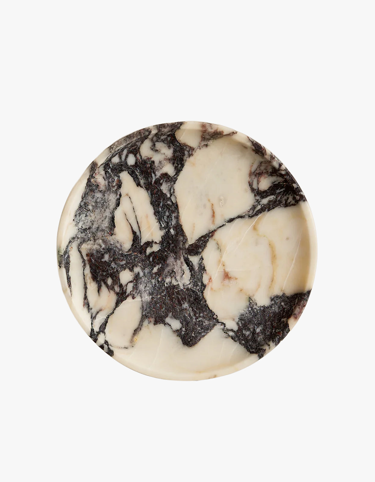 The Linea Round Marble Tray in Calacatta Viola from Black Blaze showcases exquisite violet veining on premium marble, blending minimalist design with organic elegance.