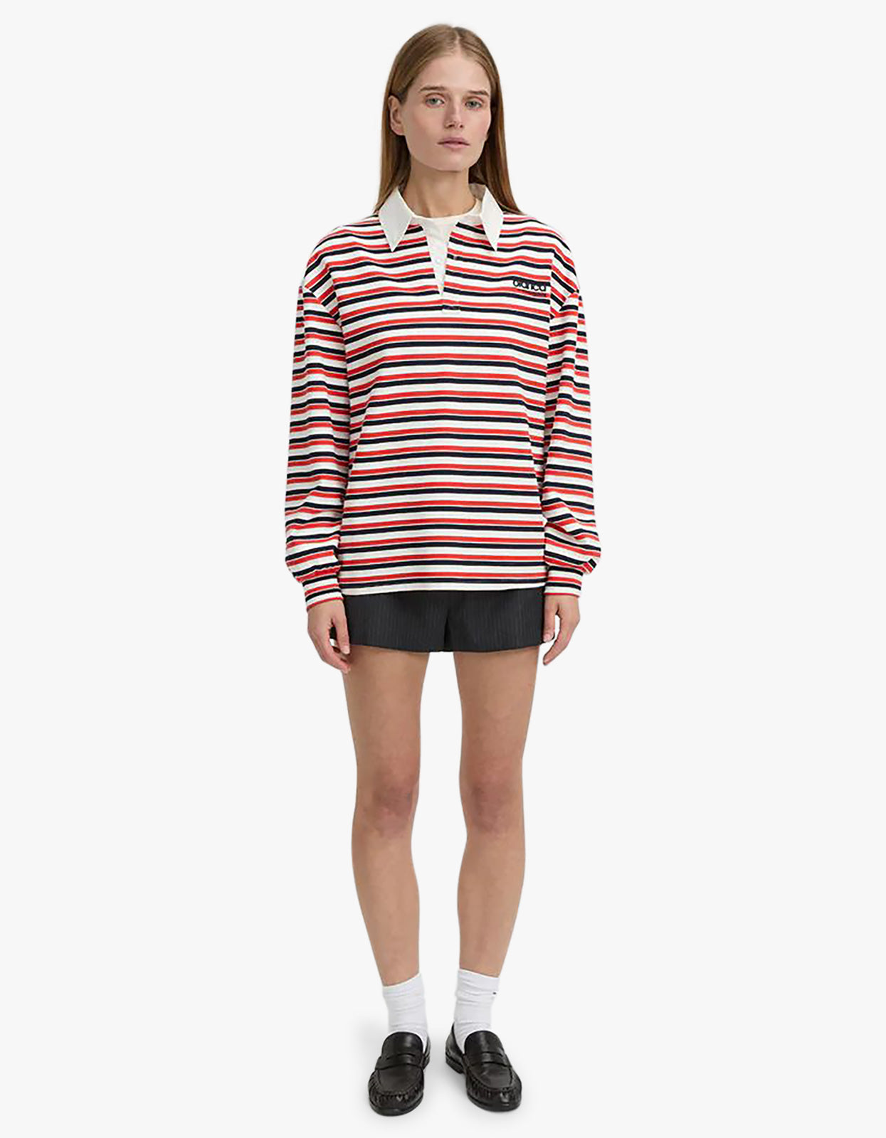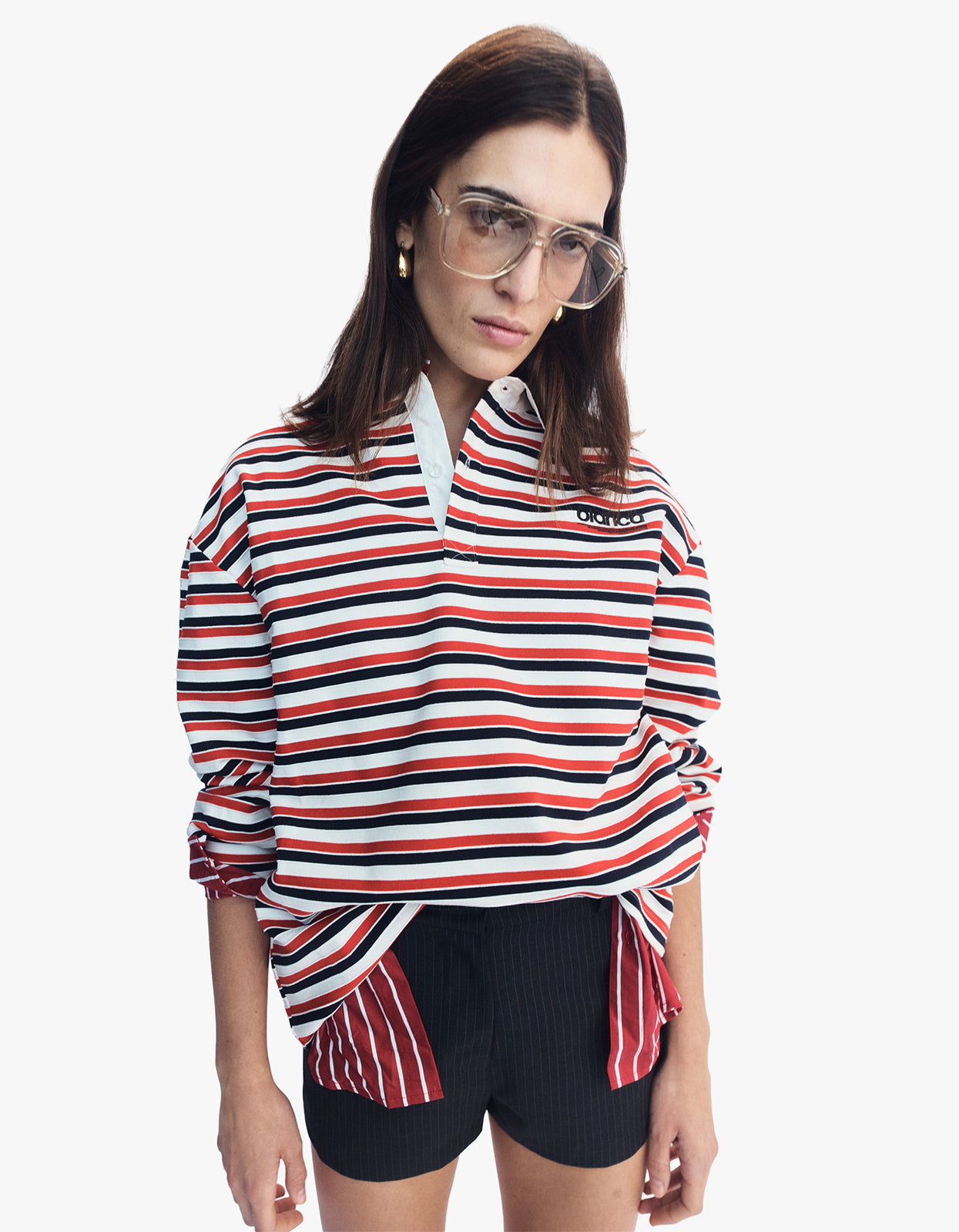 - Contrast white polo collar with concealed placket