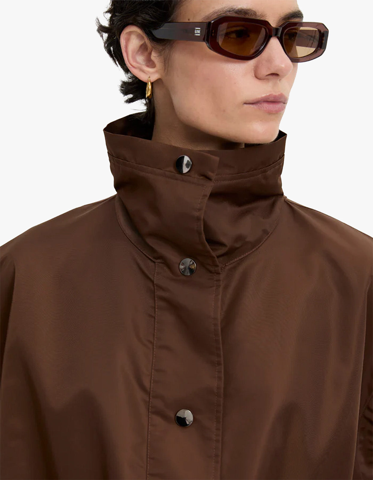 Crafted from smooth nylon with a subtle sheen, this oversized vest features a high stand collar, concealed snap-button front, and deep slanted pockets for a clean, modern silhouette. It's designed to layer beautifully over lightweight seasonal pieces or knitwear, adding dimension without bulk.