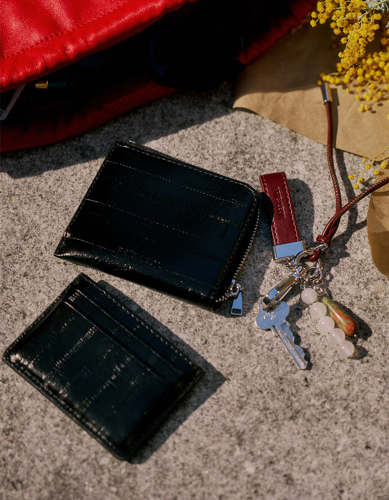 Crafted from 100% recycled leather with a soft, eel-embossed textured finish, this minimal design keeps your essentials organized with ease. Featuring five card slots and clean stitched detailing, it's compact enough to slip effortlessly into any bag or pocket—designed for streamlined, on-the-go use.