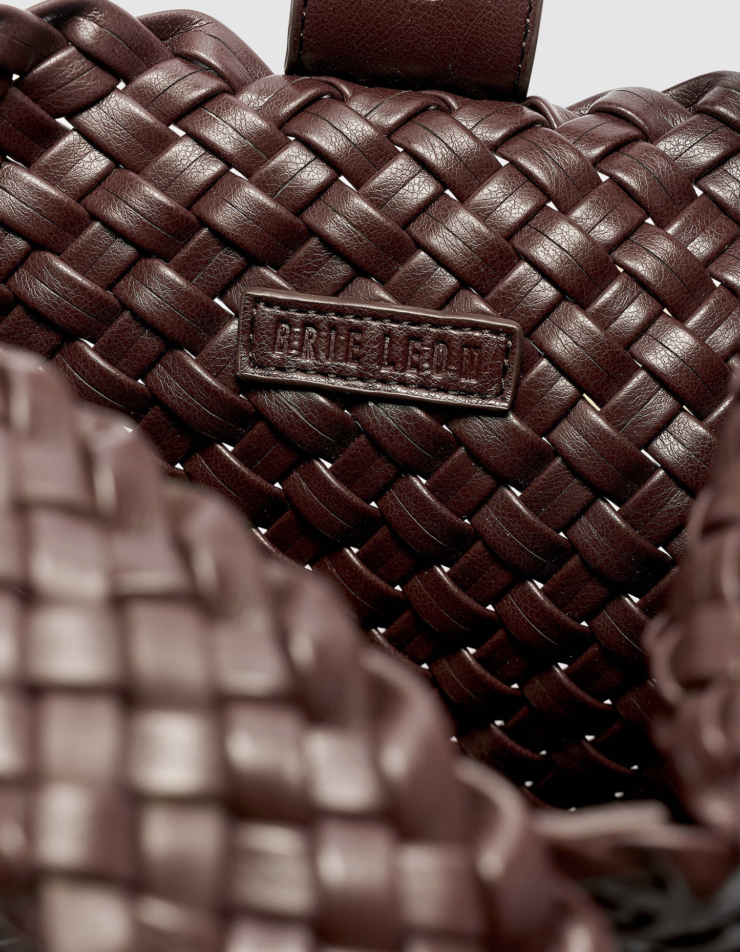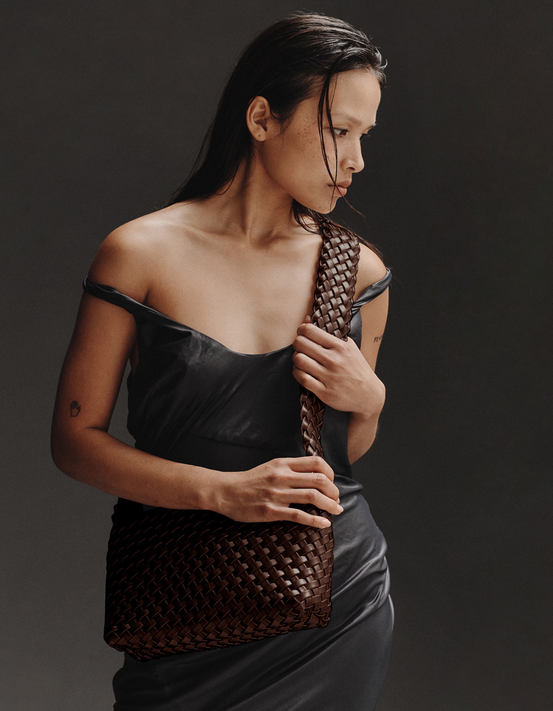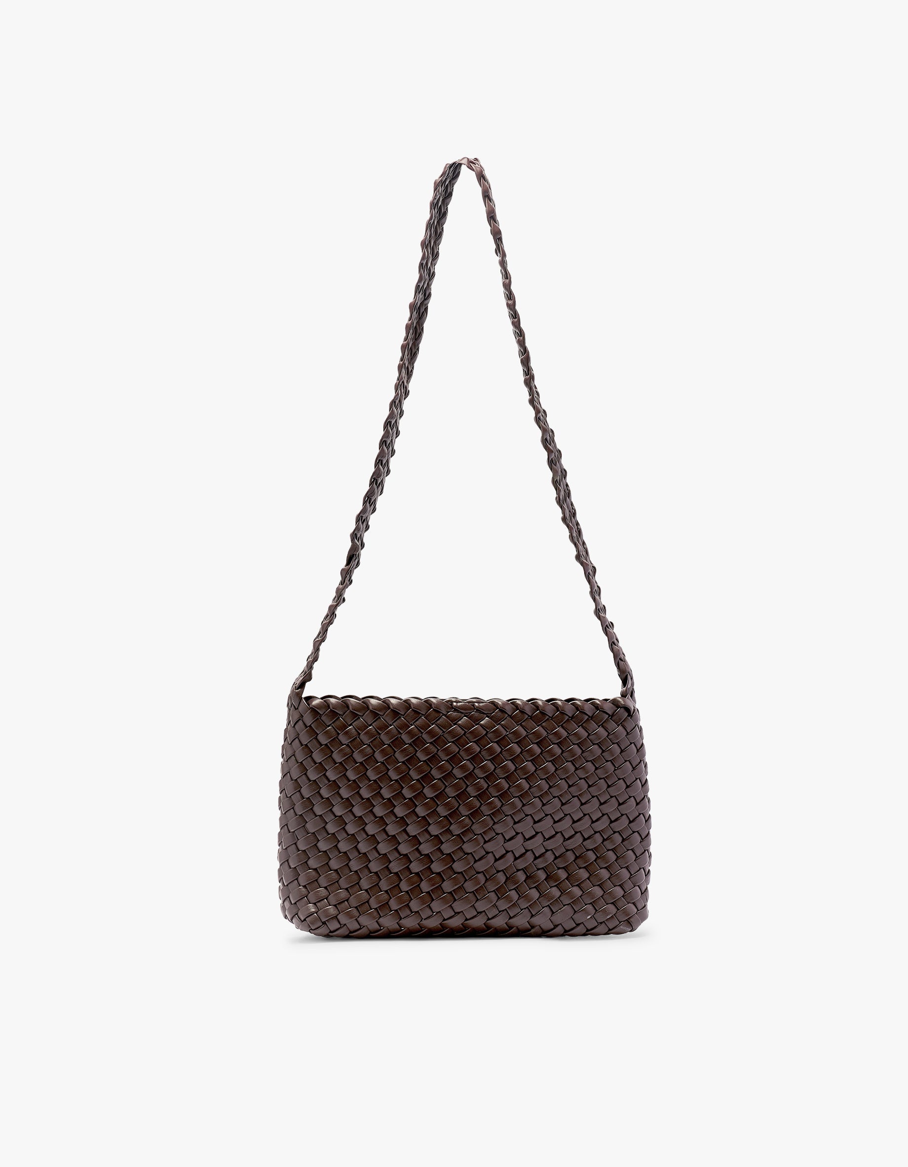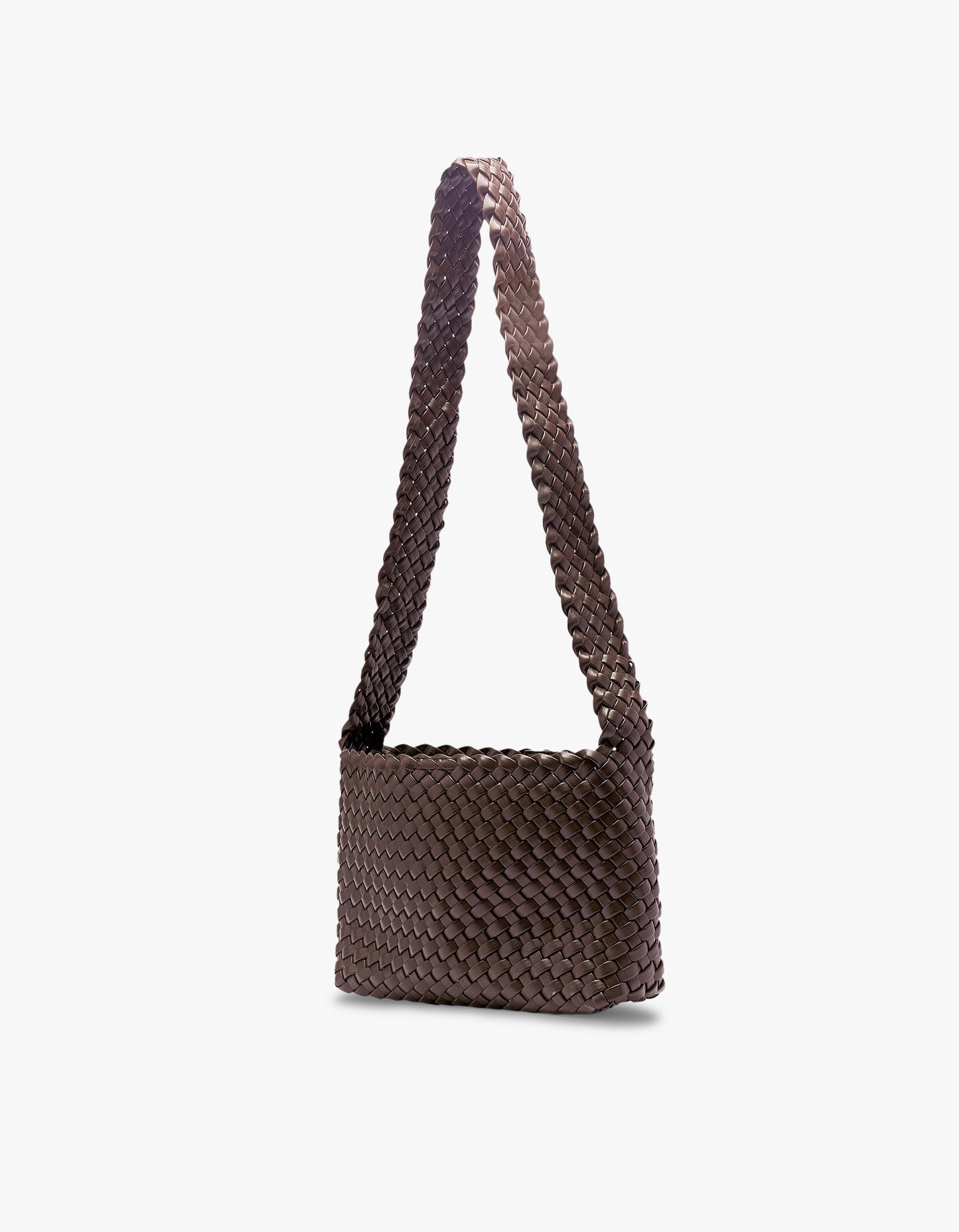Brie Leon's Luca Woven Crossbody Bag in rich chocolate exudes artisanal craftsmanship with its meticulously woven texture.
