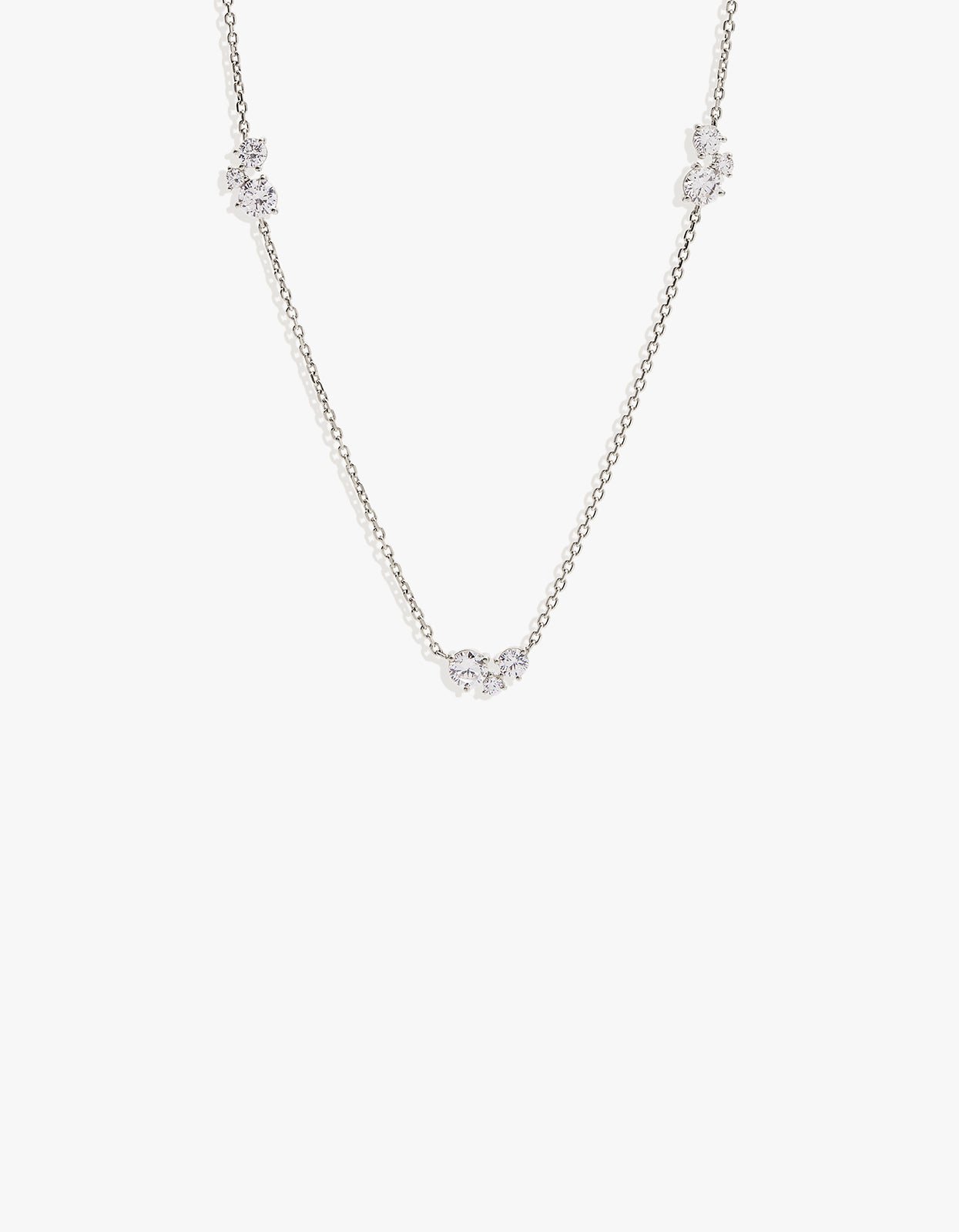 Featuring three round-cut cubic zirconias arranged asymmetrically, this delicate necklace rests gracefully at the neckline. Its subtle sparkle and shortened length make it perfect for layering or as a standalone piece, ideal for brides seeking understated sophistication on their special day.