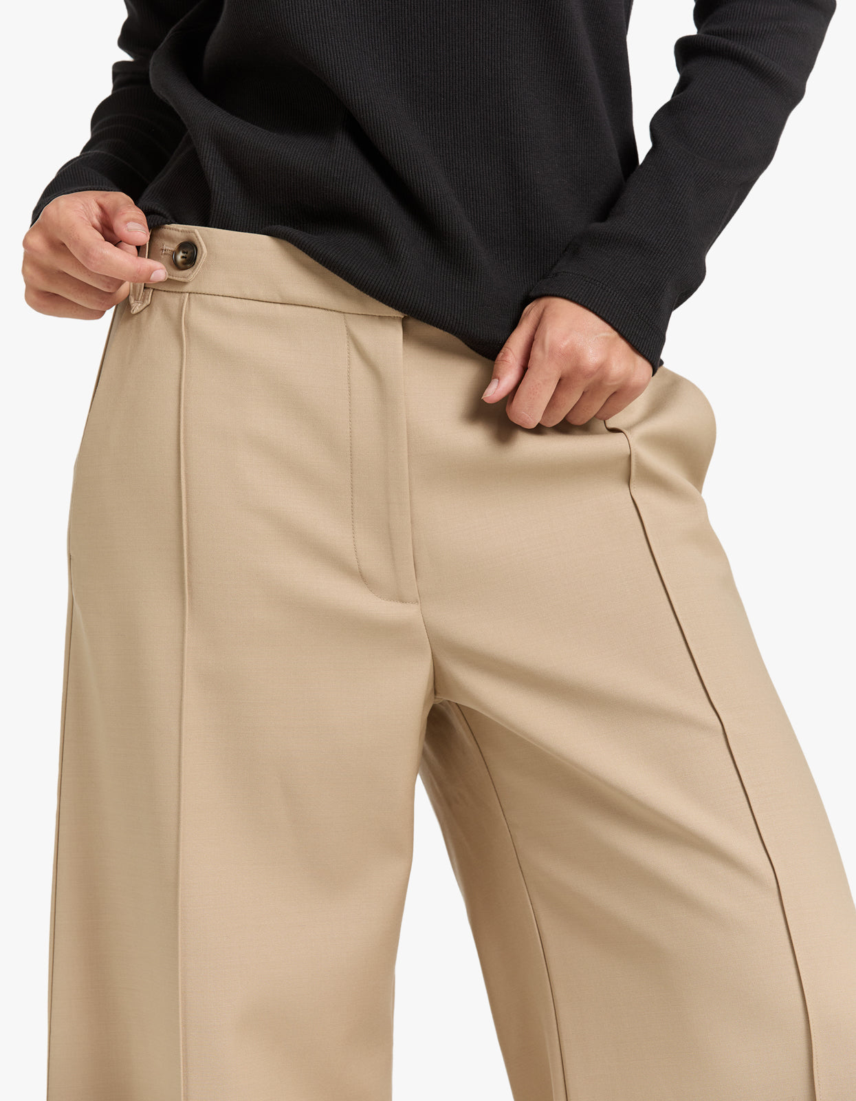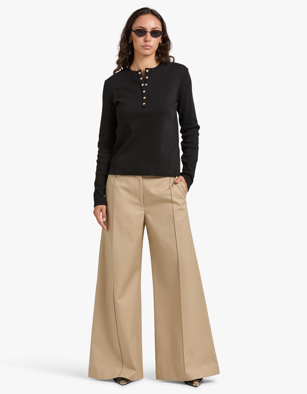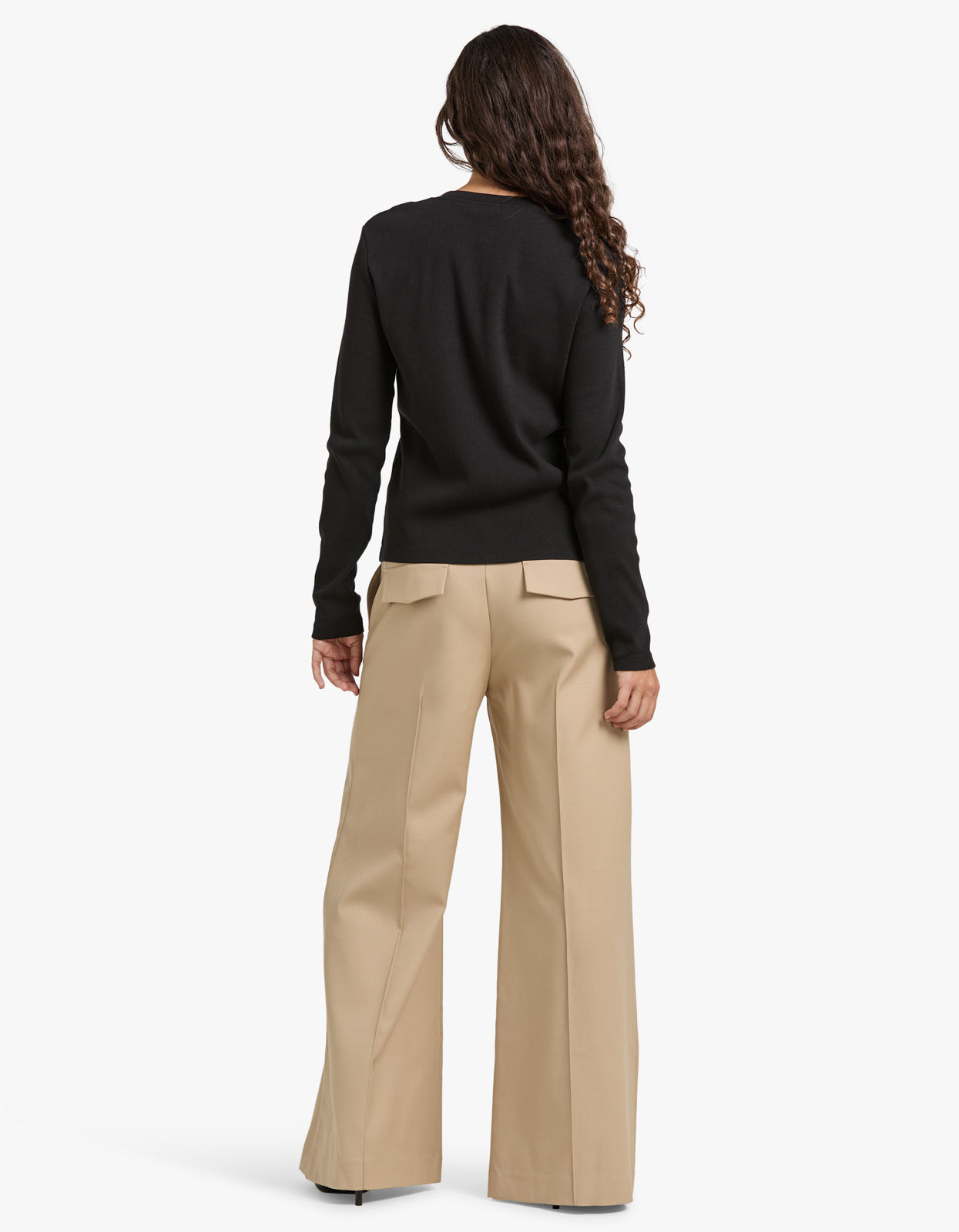 Tailored to sit comfortably at the waist and featuring a unique back-to-front tab detail, this versatile pant seamlessly combines function and style with its wide-leg cut. Elevate your wardrobe with this modern, elegant piece.