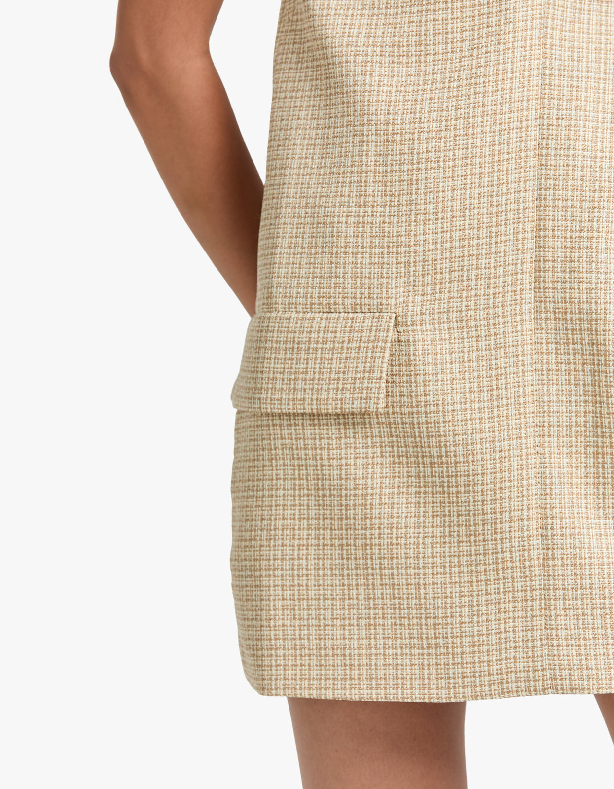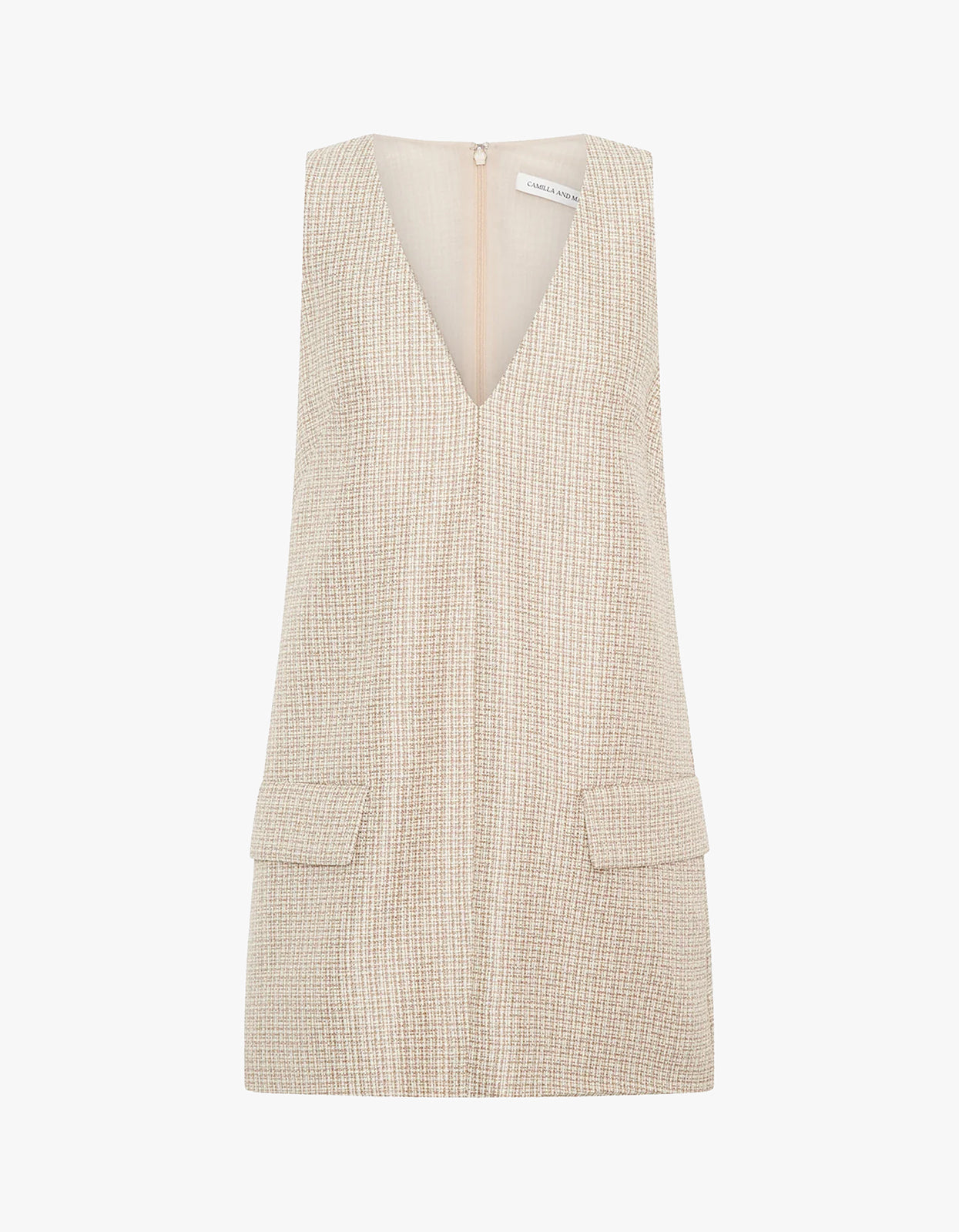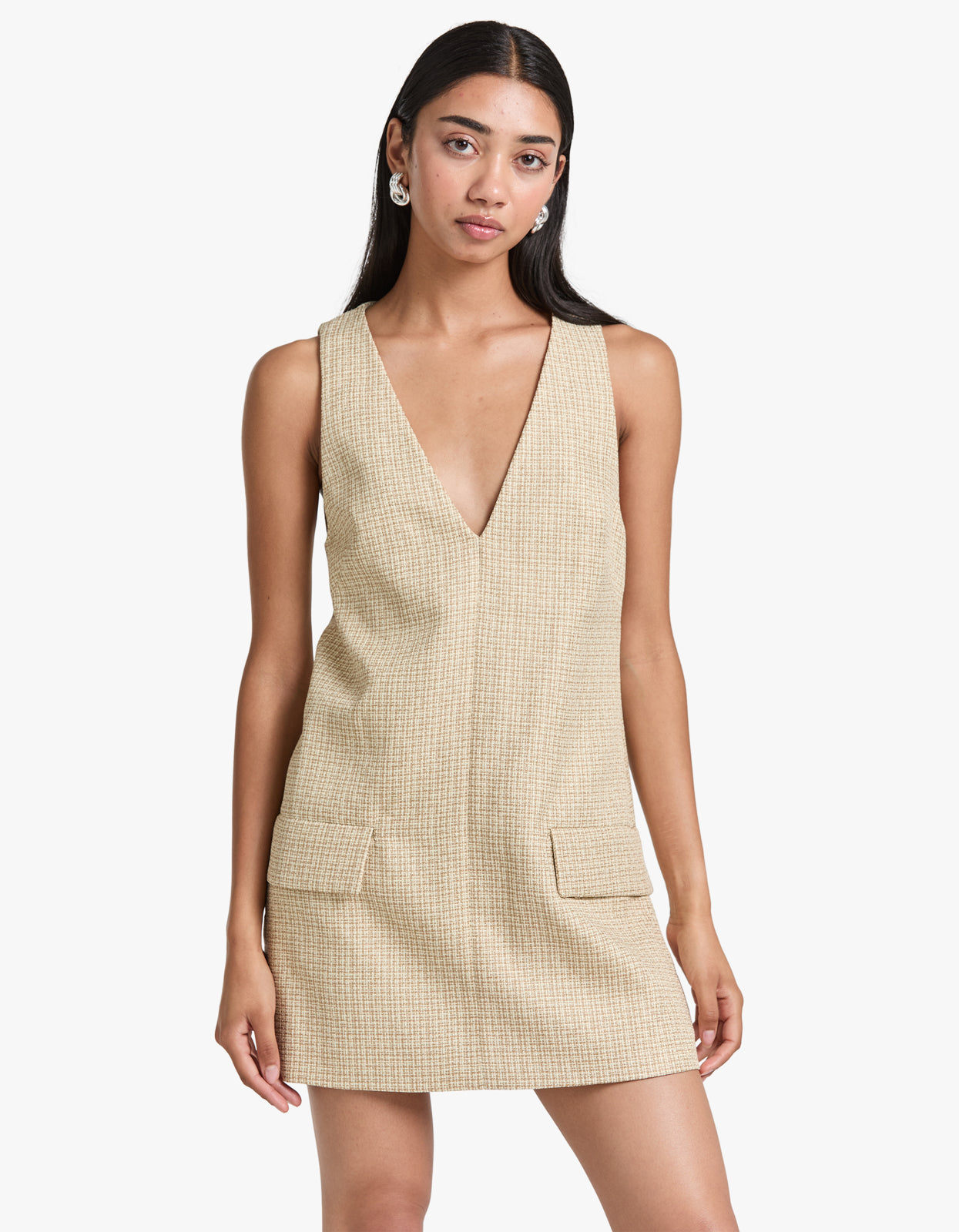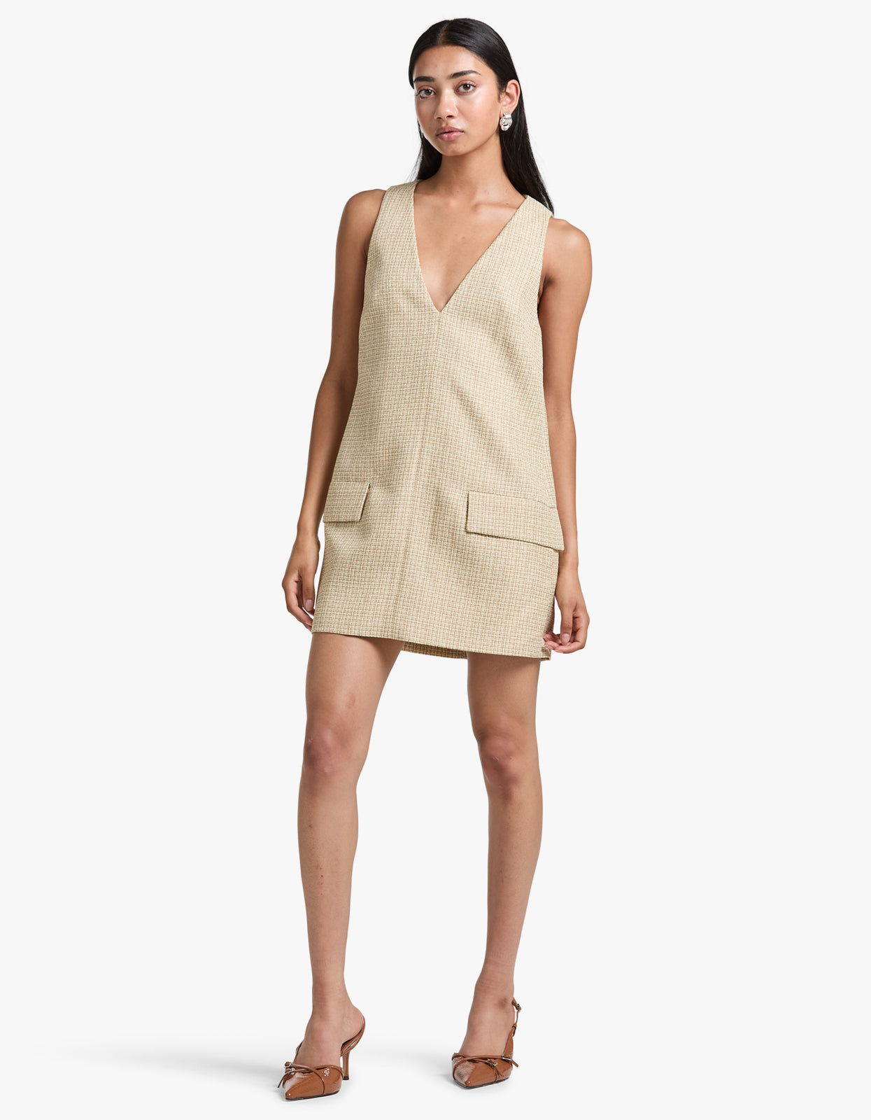 This tailored v-neck mini dress features bust darts for a flattering fitted bodice and front flap pockets for a touch of functionality. With its playful yet sophisticated design, the Ripley Dress is perfect for any occasion.
