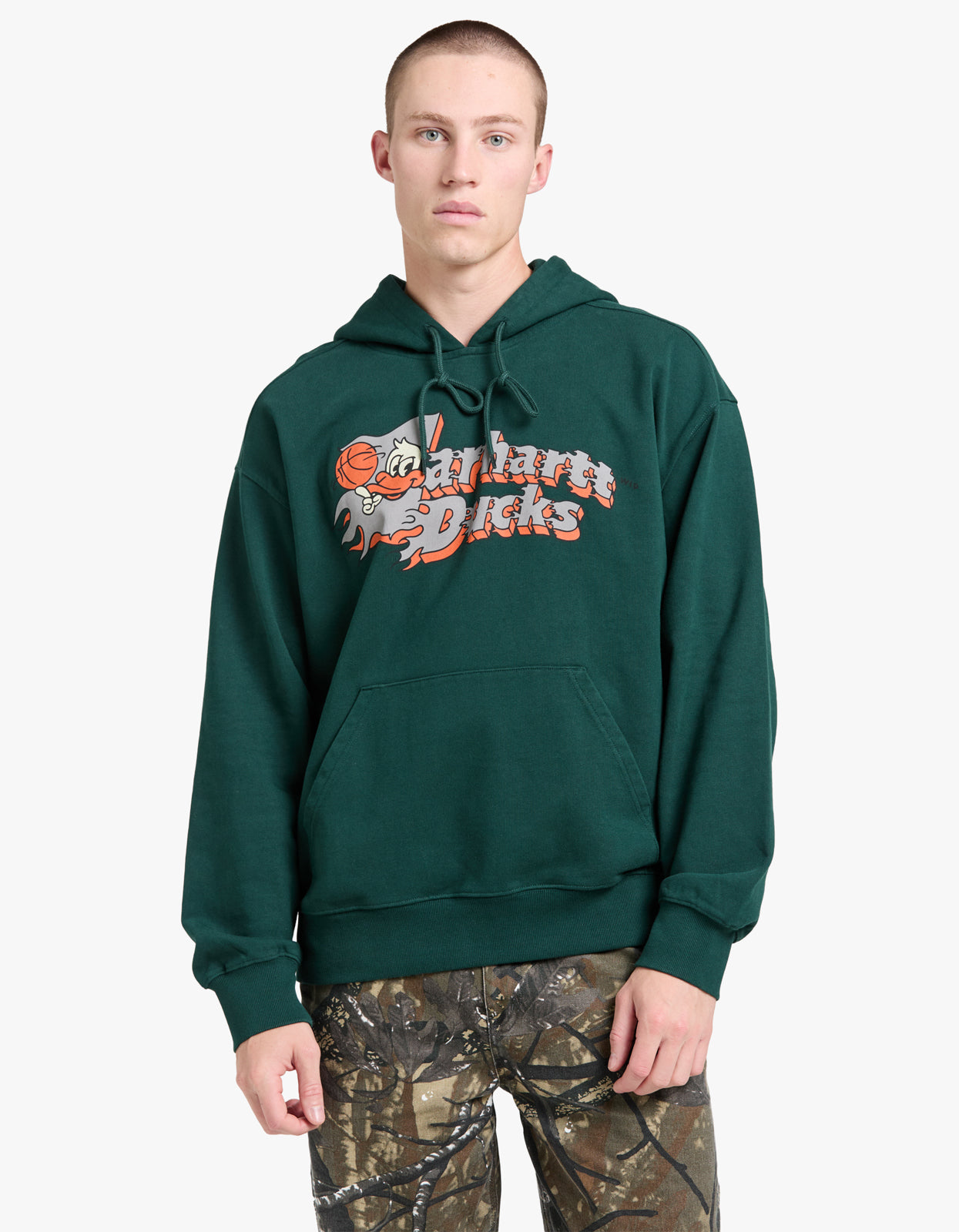Indulge in luxury with our Hooded Flaming Ducks Sweatshirt by Carhartt.