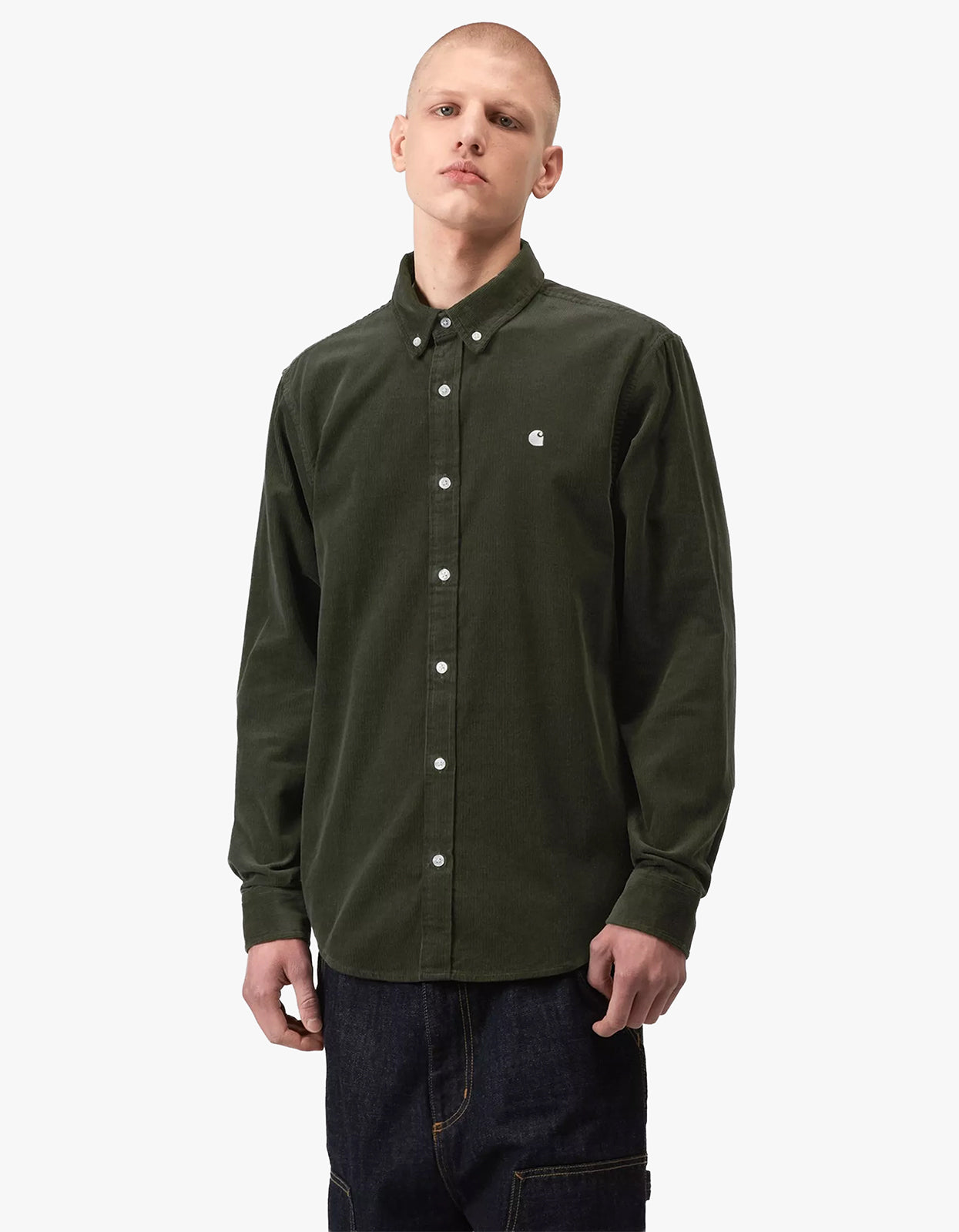 This classic button-down is crafted from midweight 16-wale cotton corduroy - the fine ridges create a refined, premium texture that's both tactile and visually striking. The rich Opuntia green colorway with wax finish adds depth and character, while the garment-washed treatment ensures a soft, lived-in feel from the first wear. Finished with the signature embroidered Carhartt WIP C Logo on the left chest, this shirt features a button-down collar and curved hem for versatile styling whether tucked or untucked.