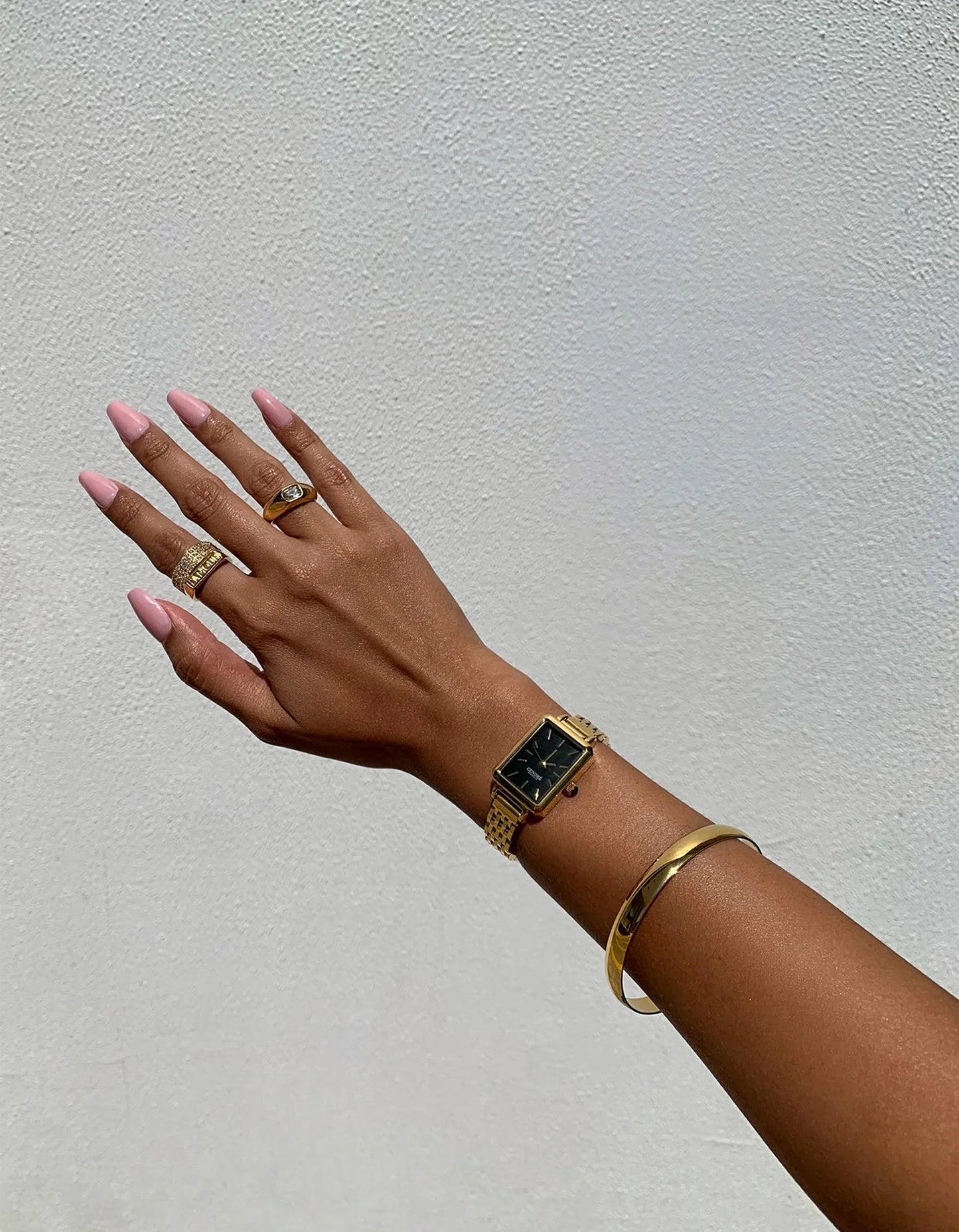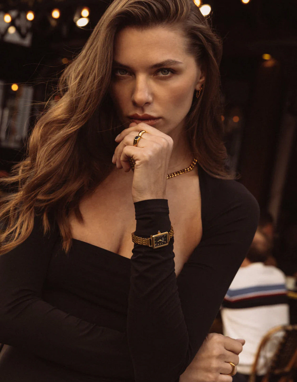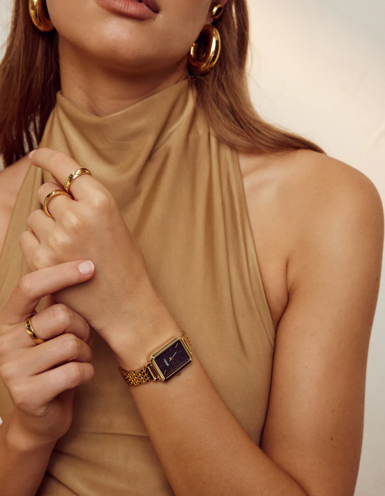 It’s crafted from 18k gold plated stainless steel and has an engineer band with a polished finish. The Mason Watch is available in three different colours but we recommend the white watch face when you want to add lightness to your look.