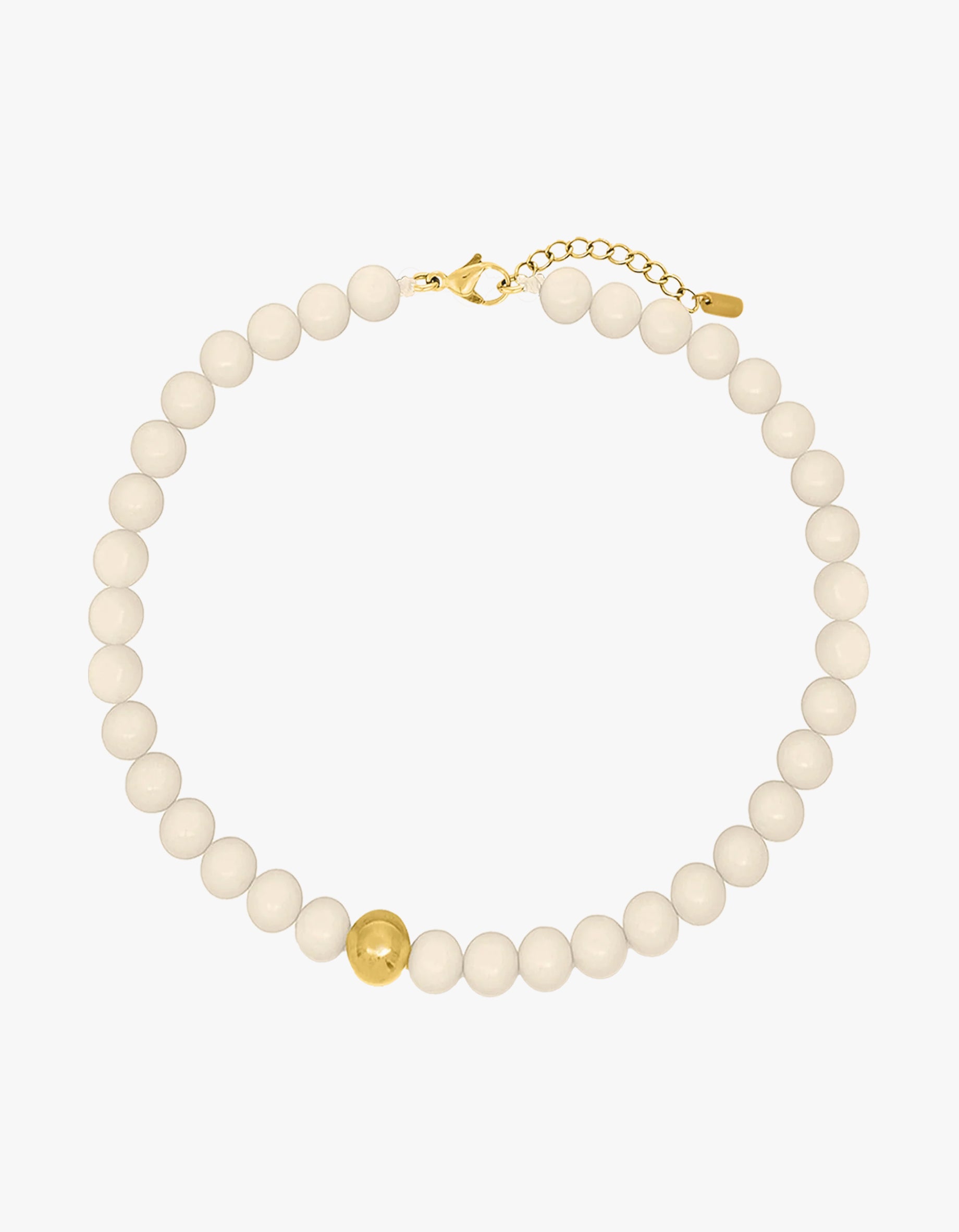 The Cendré Prudence Necklace in Ivory balances structure and softness with smooth vanilla-toned resin beads centred by a single 18K gold-plated sphere. This choker-length piece brings warmth and subtle elegance to any look.