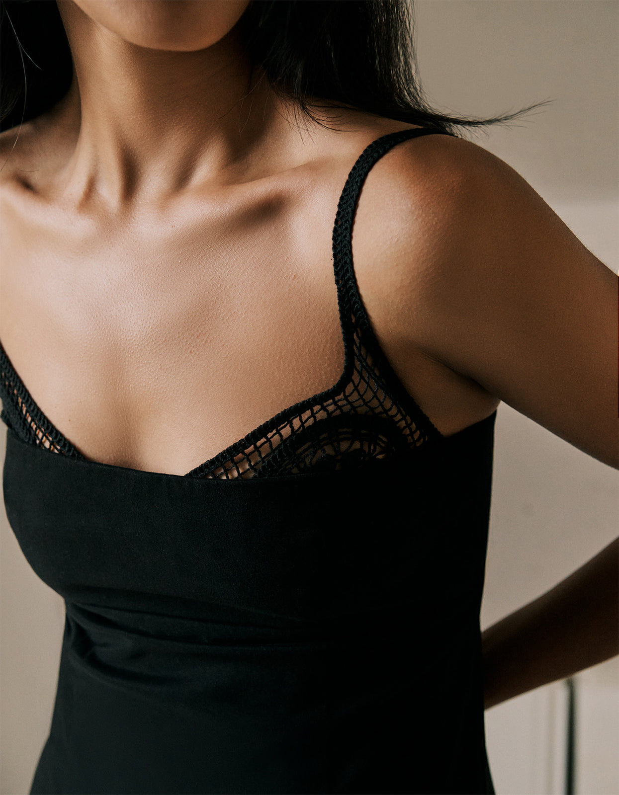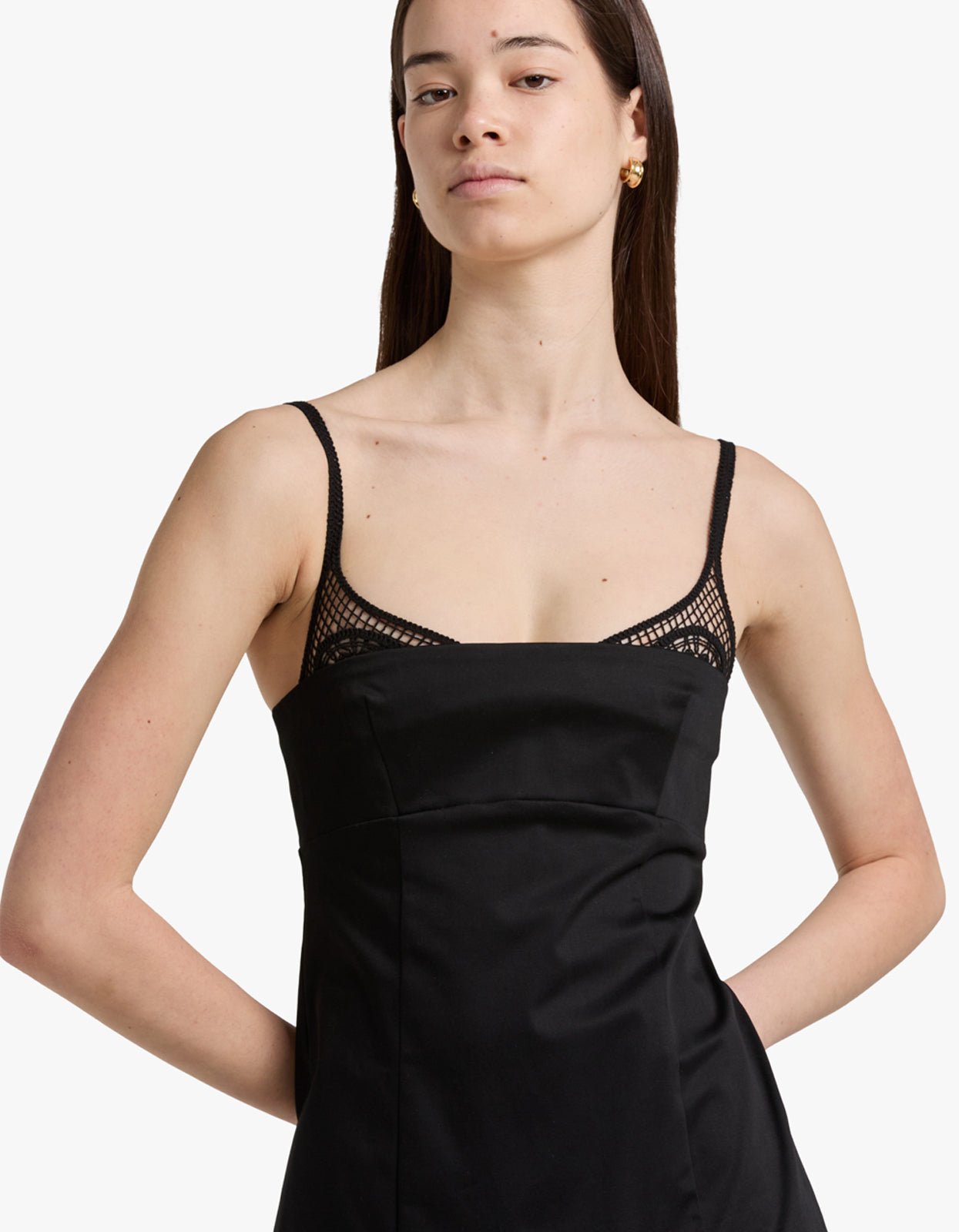 Main: 97% cotton, 3% elastane. Lining: 100% viscose. Embroidery: 100% cotton
