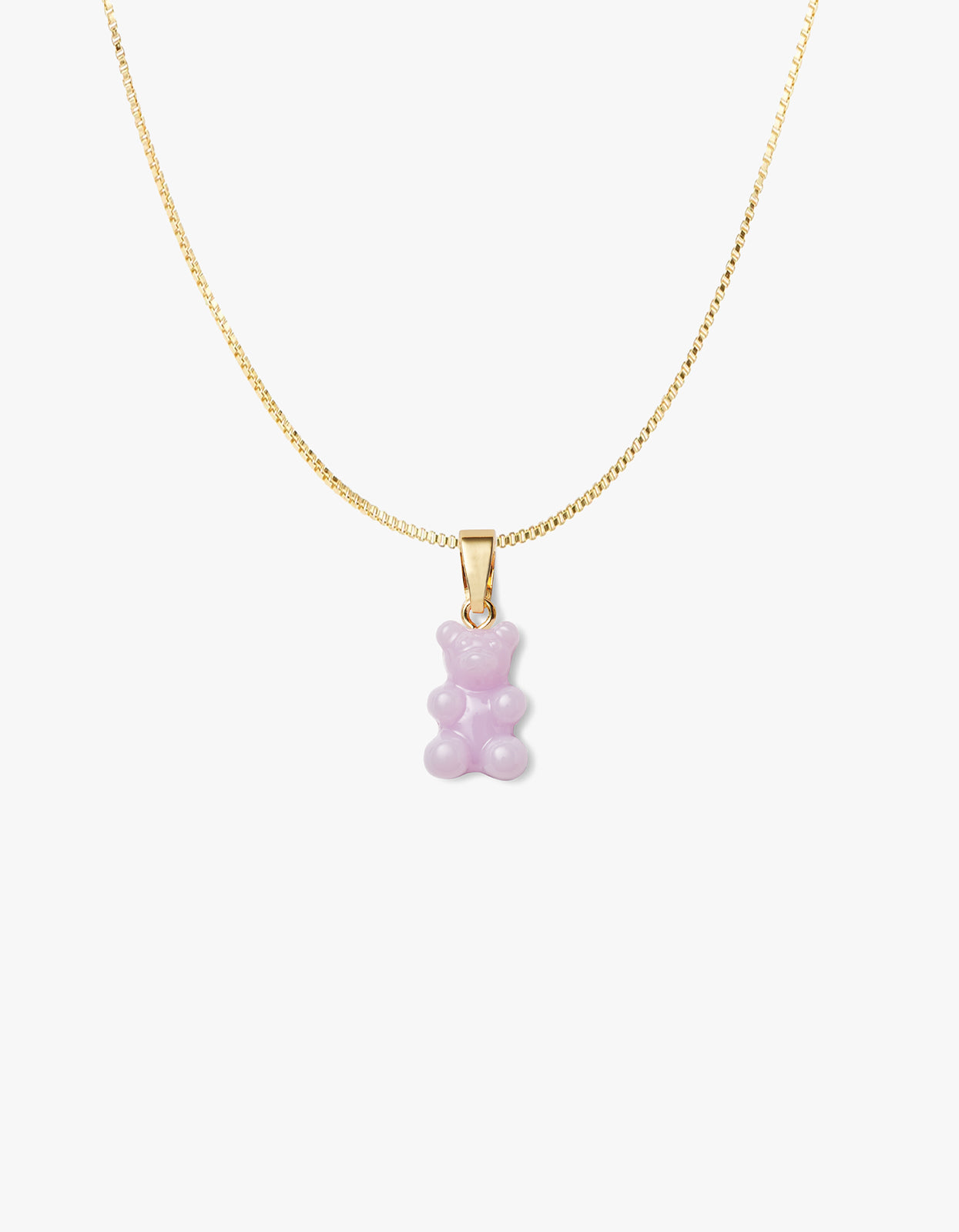 Recapture the magic of the 90s with the Nostalgia Bear Gold Chain Necklace in Lavender from Crystal Haze .