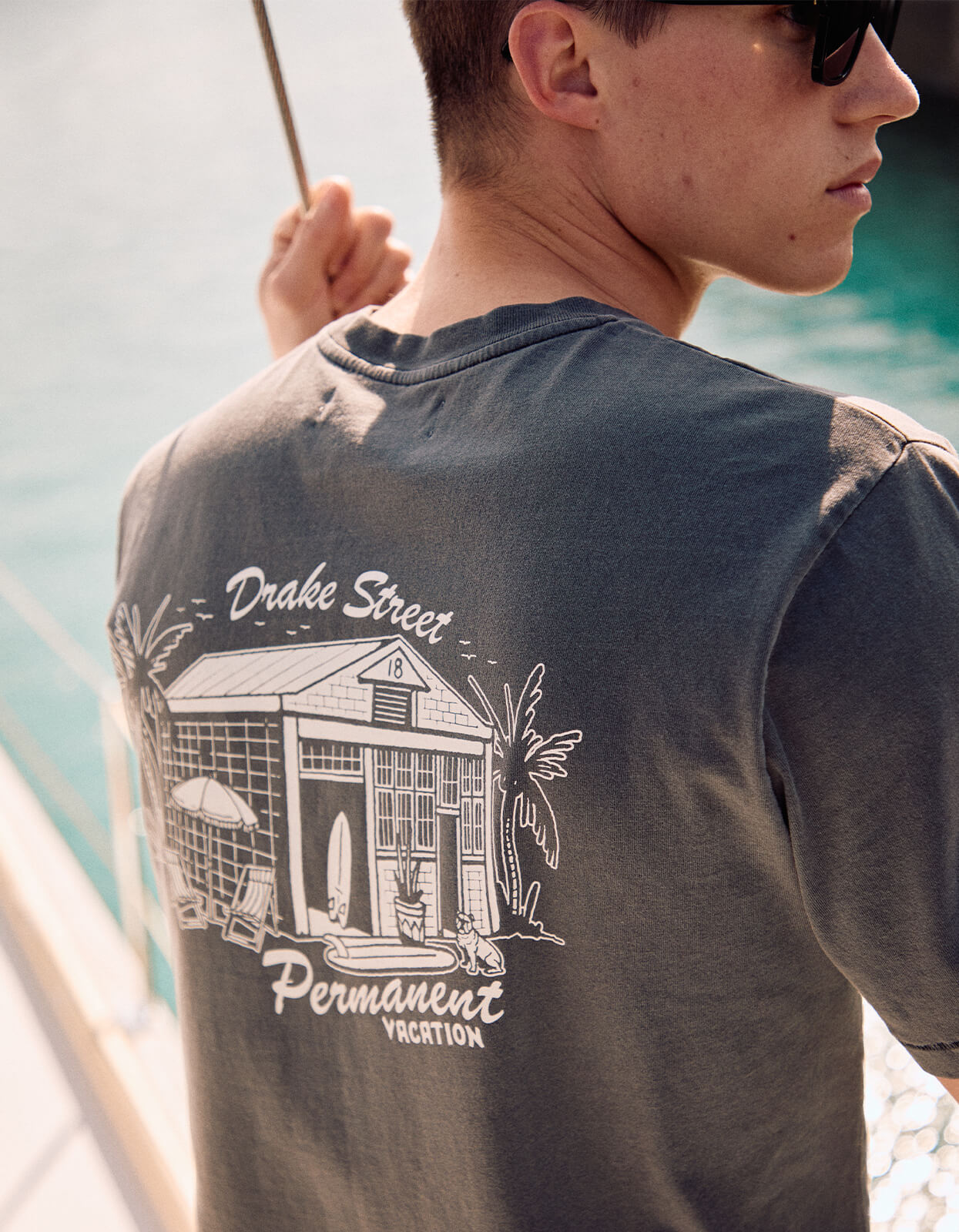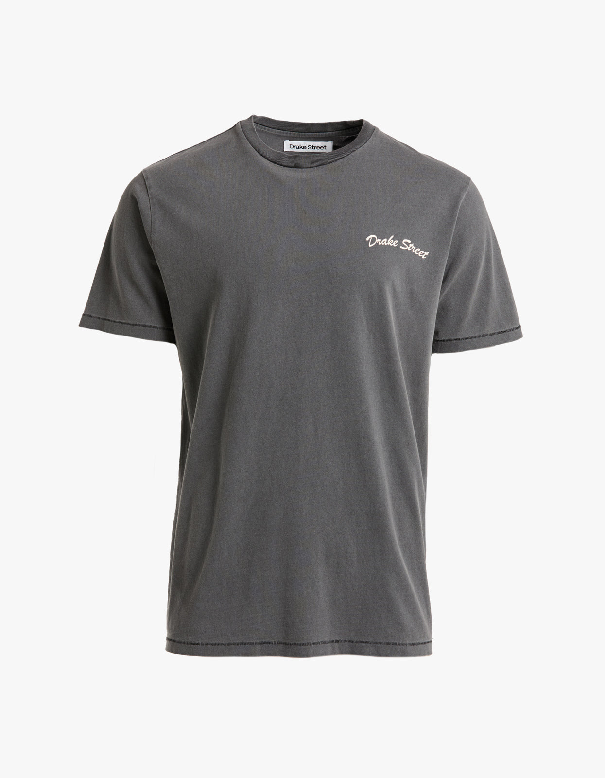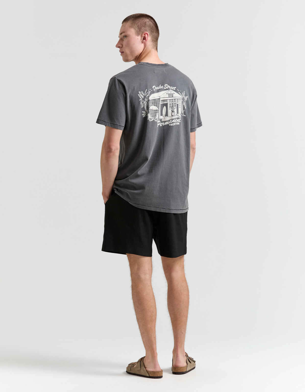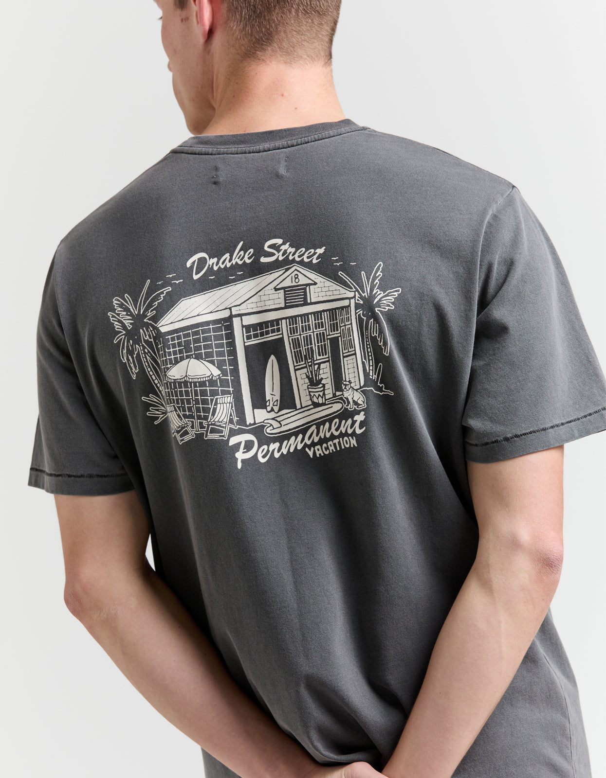 Escape to endless summers with our Permanent Vacation Tee in Aged Black from Drake Street.