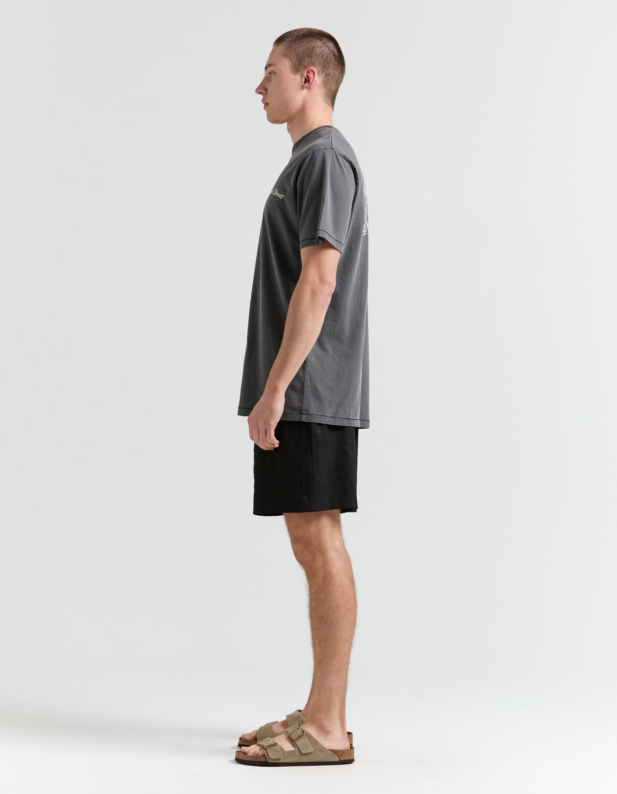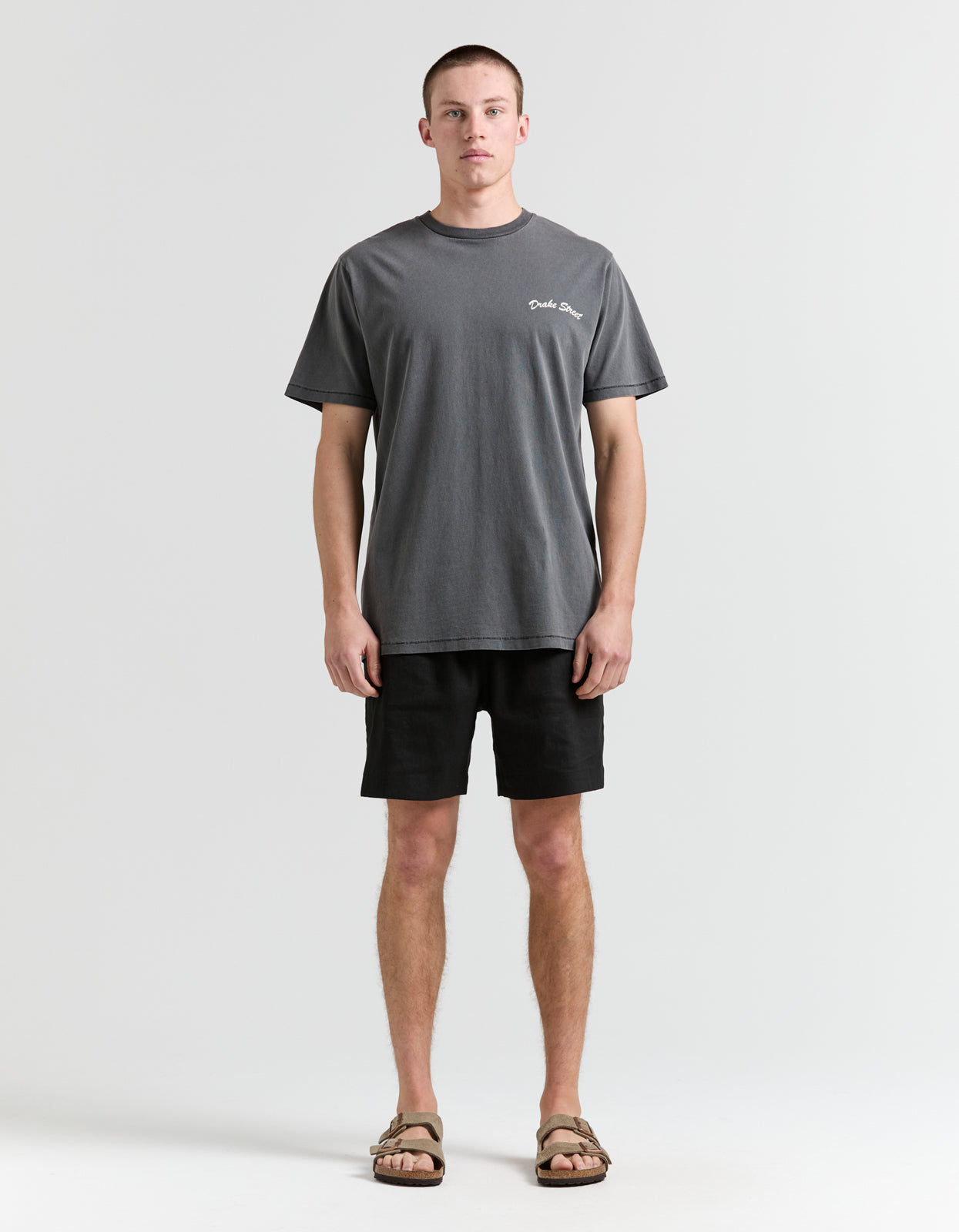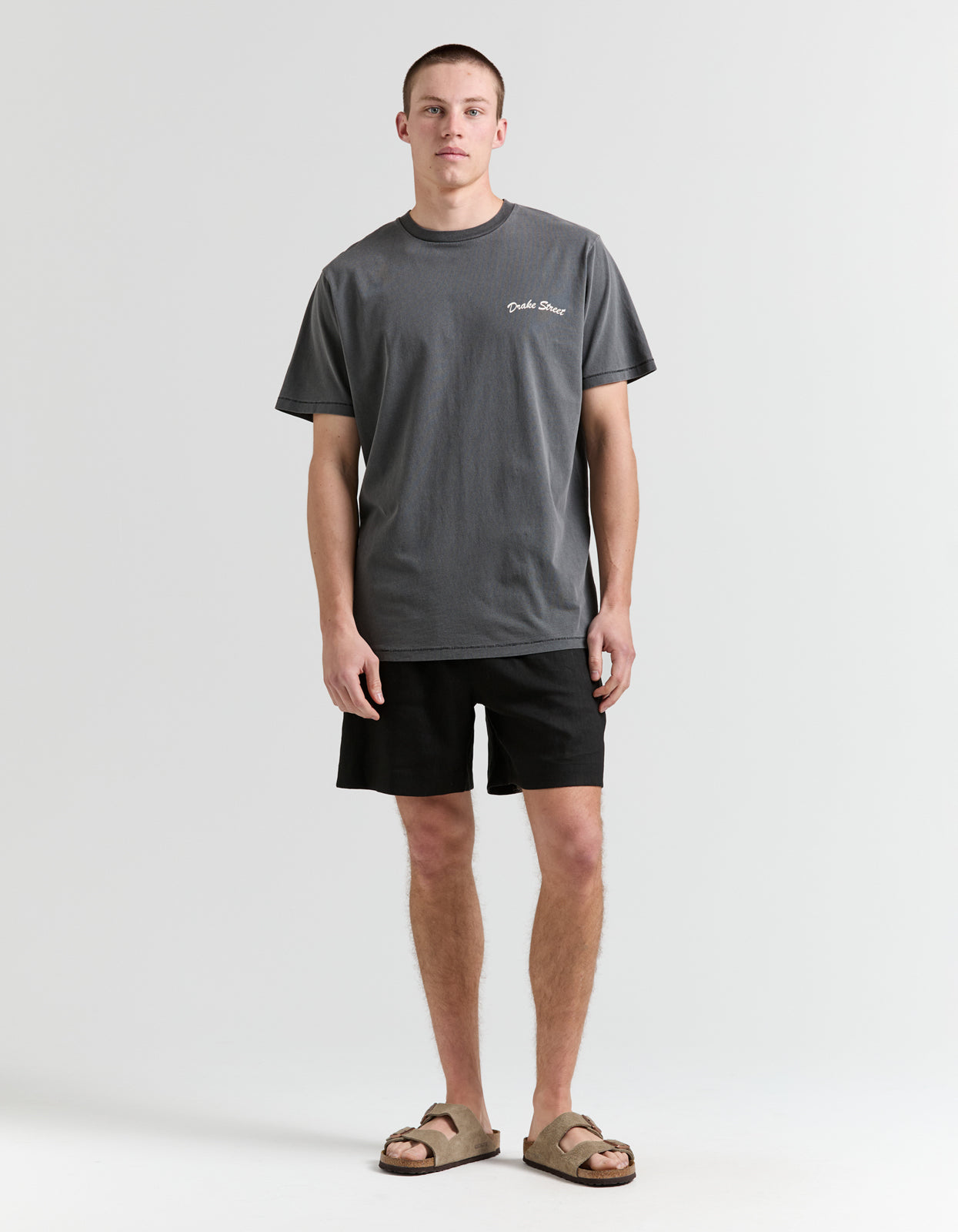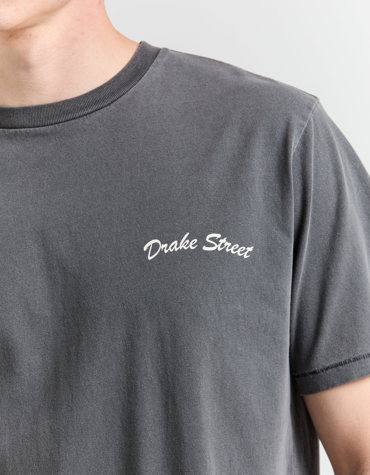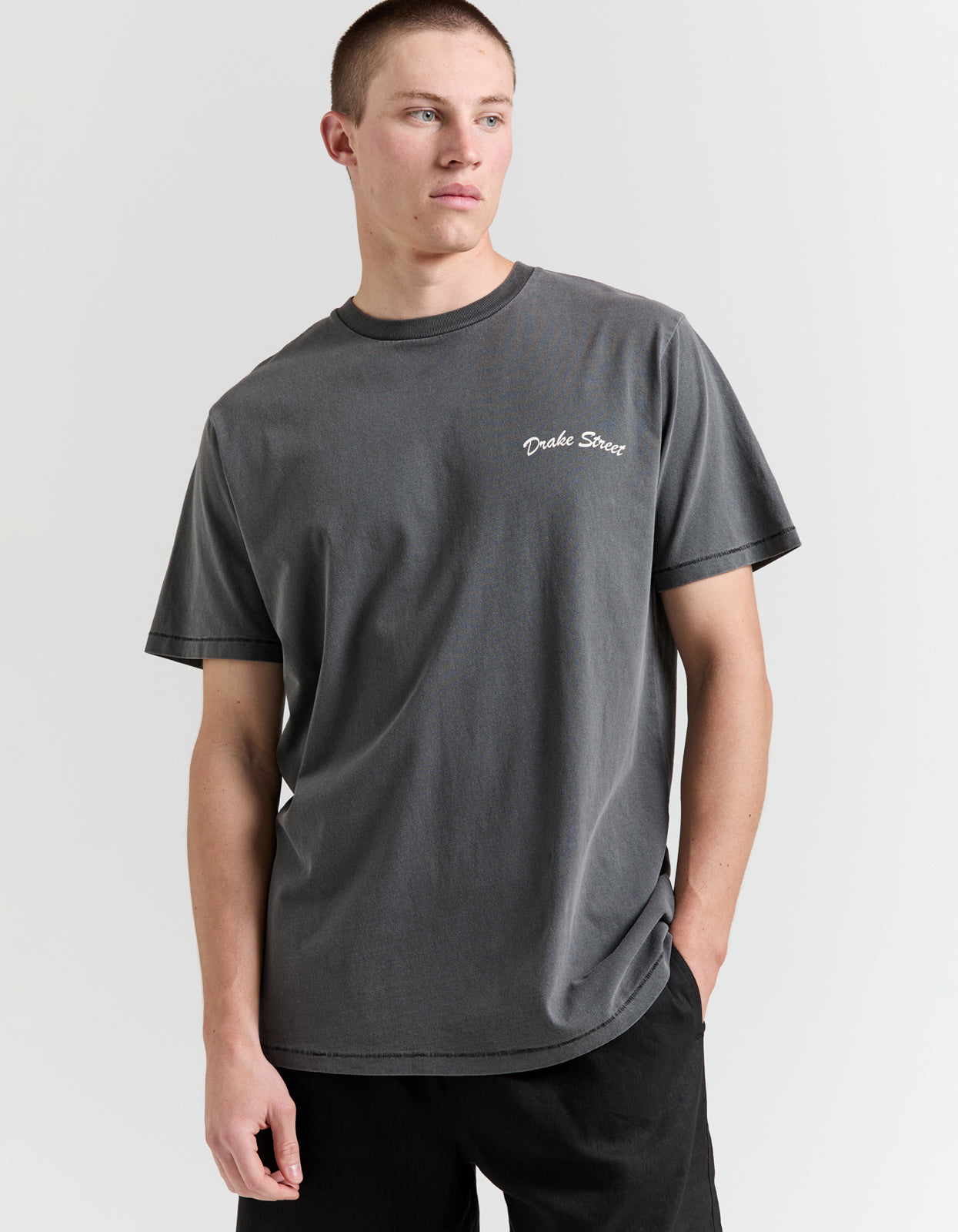 Escape to endless summers with our Permanent Vacation Tee in Aged Black from Drake Street.