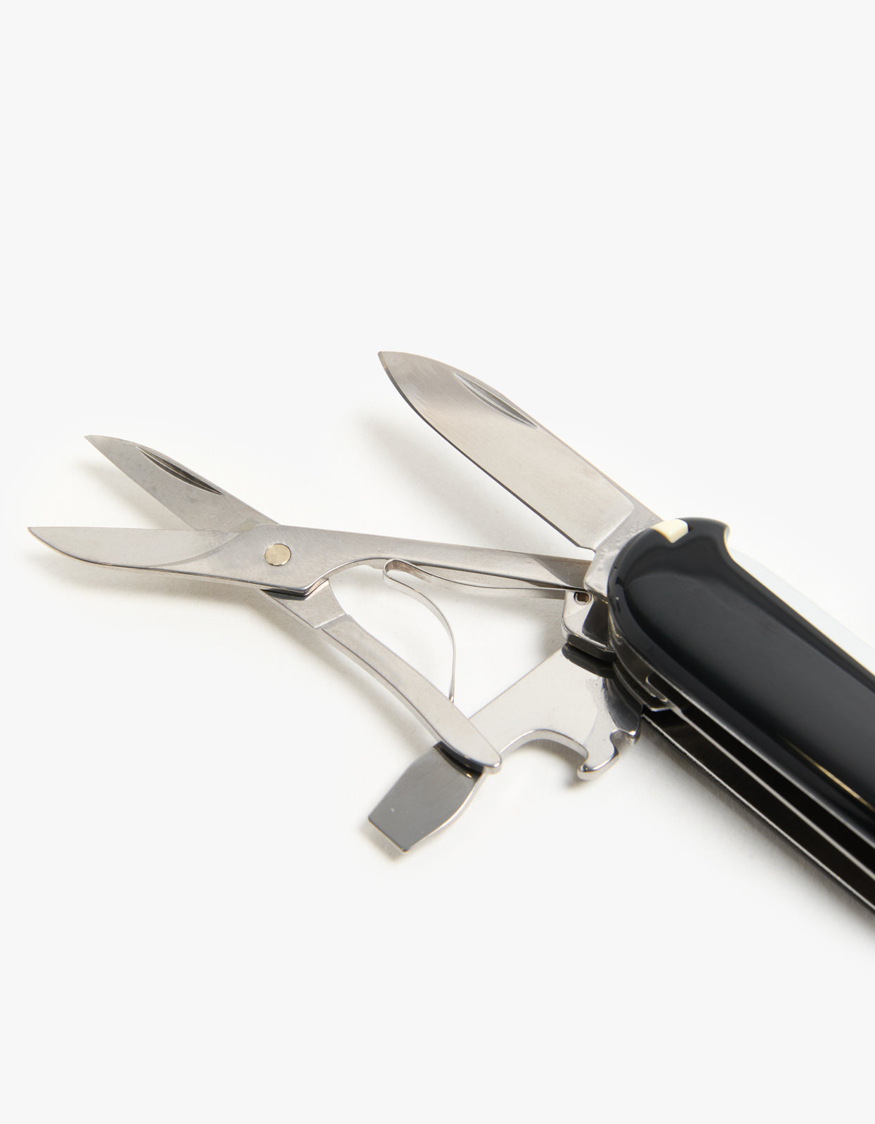 - Includes: Blade, large, Blade, small, Corkscrew, Can opener, Screwdriver 3 mm, Bottle opener, Screwdriver 6 mm, Wire stripper, Reamer, punch and sewing awl, Scissors, Wood saw, Multipurpose hook, Key ring, Tweezers, Toothpick, Can opener, Bottle opener