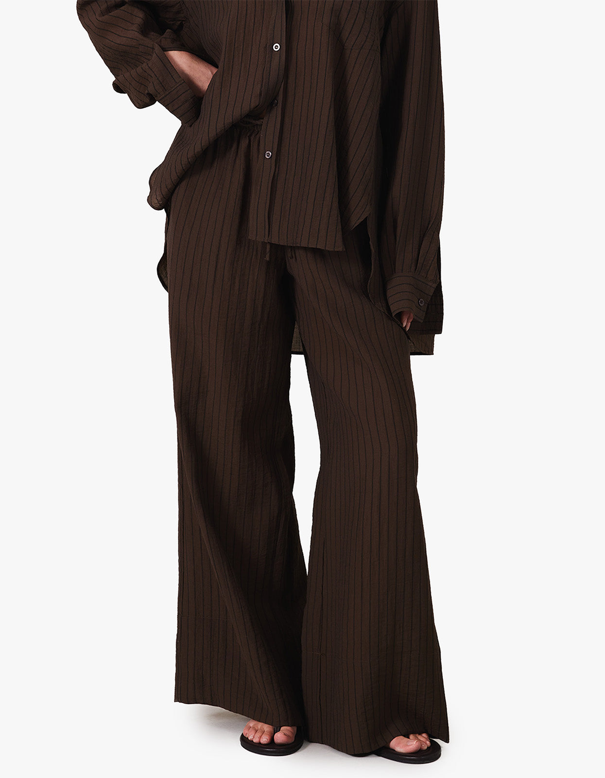 The Aries Pant features a relaxed silhouette with an elasticated waistband and adjustable drawstring for an effortless fit. Finished with side pockets and a beautiful stripe fabrication, this versatile style can be worn high or low on the waist. Pair with the Remi Shirt for a coordinated look or style solo for laid-back elegance.