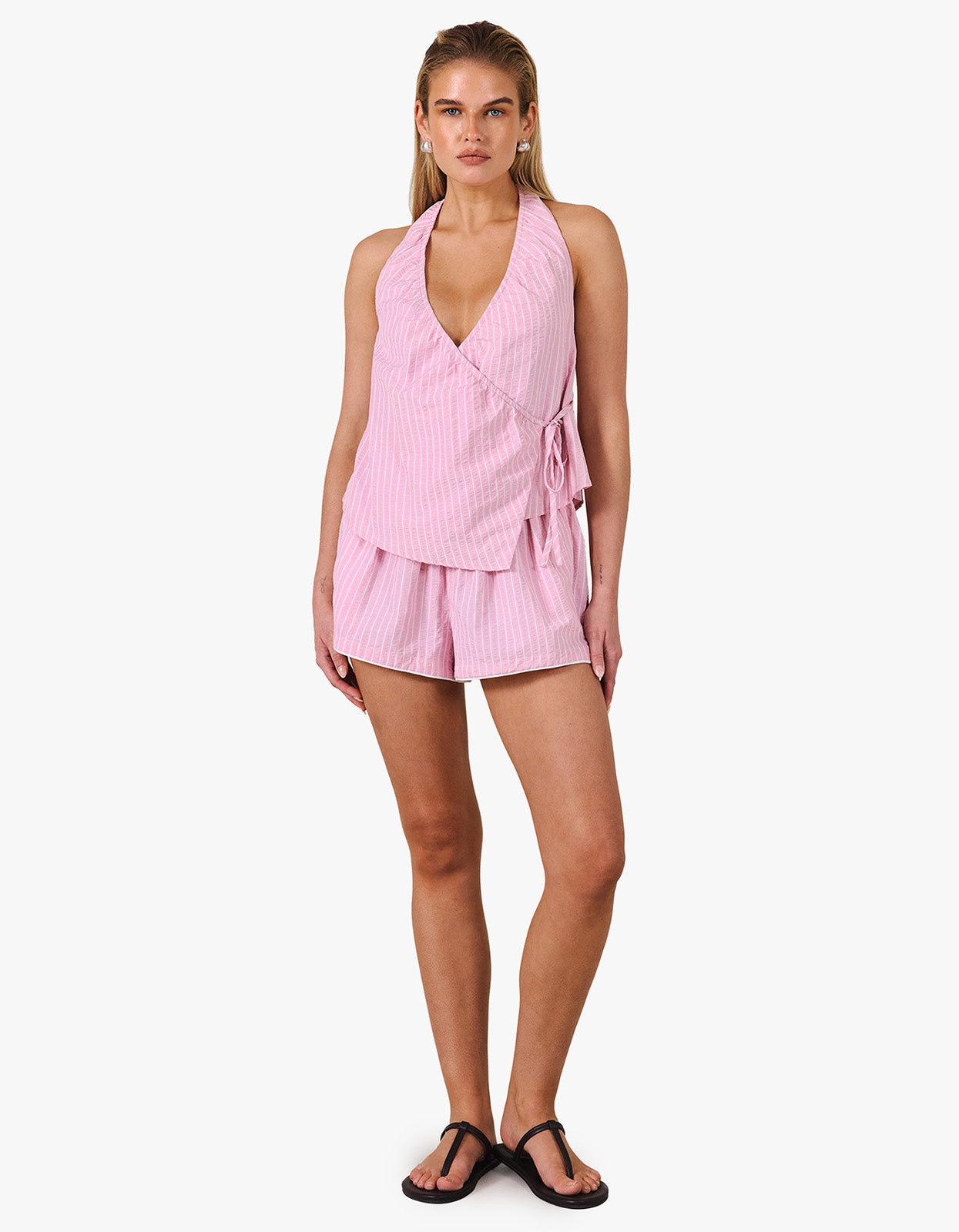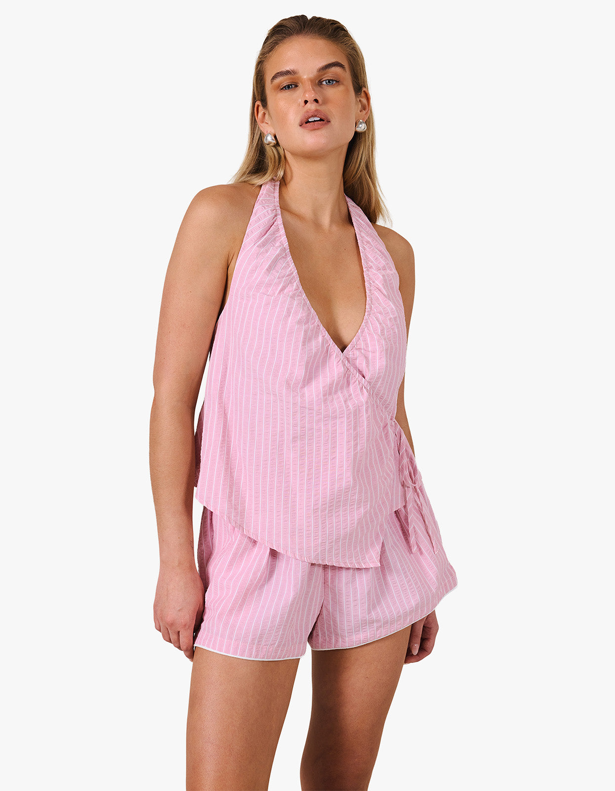 Featuring a V neckline, internal tie, and elastic through the neck and back, the Lola Top offers a softly structured shape with all-day comfort. Lightweight and feminine, the pink stripe fabrication brings a fresh softness to your summer rotation. Style back with the Sabine Short for an elevated coordinated look.