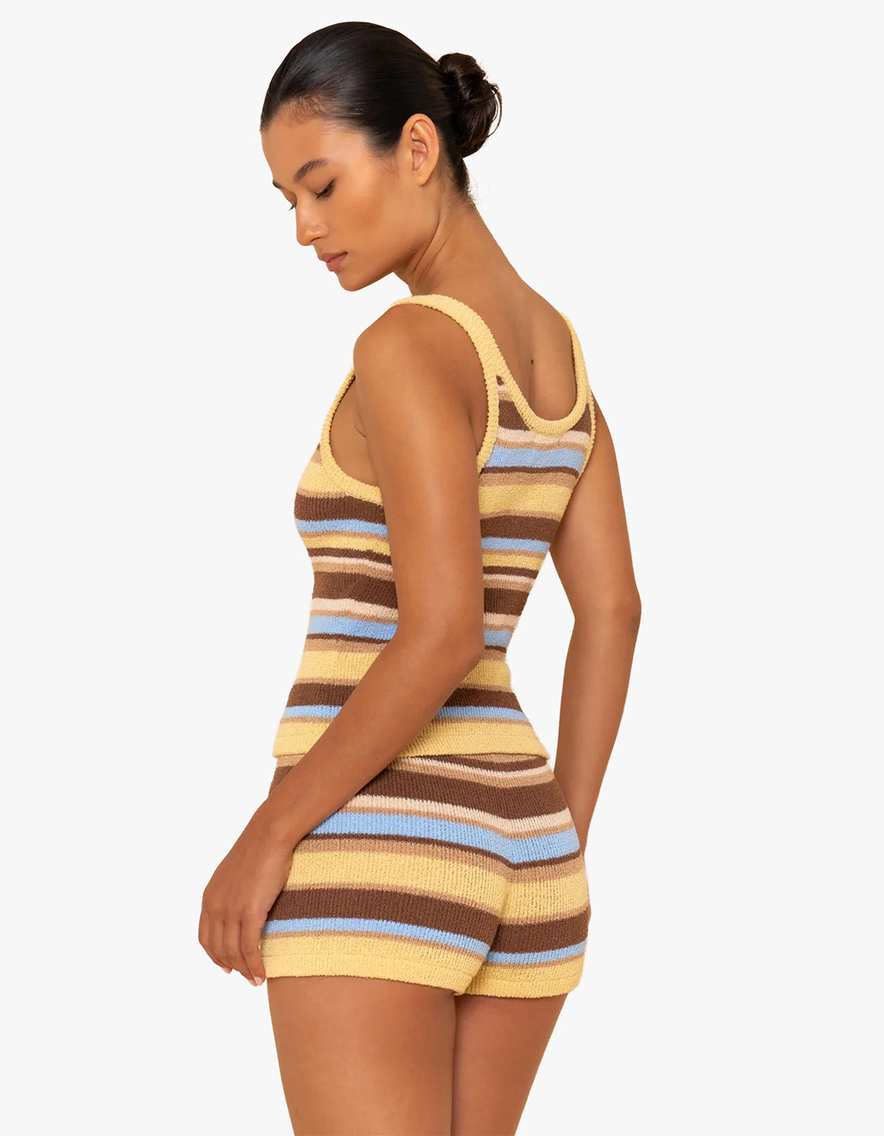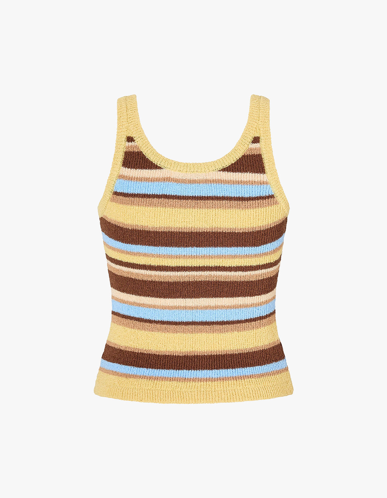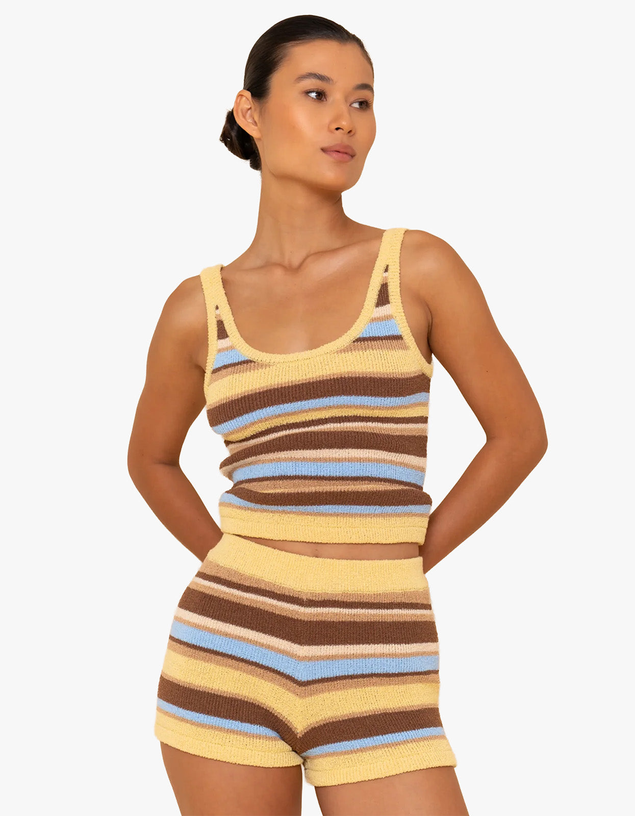 Featuring a scoop neck and bold stripe pattern, it's finished with contrast brown rib binding for a distinctive touch. Pair it with the Reine Short in Laguna for a coordinated look that's perfect for resort days or casual summer styling.