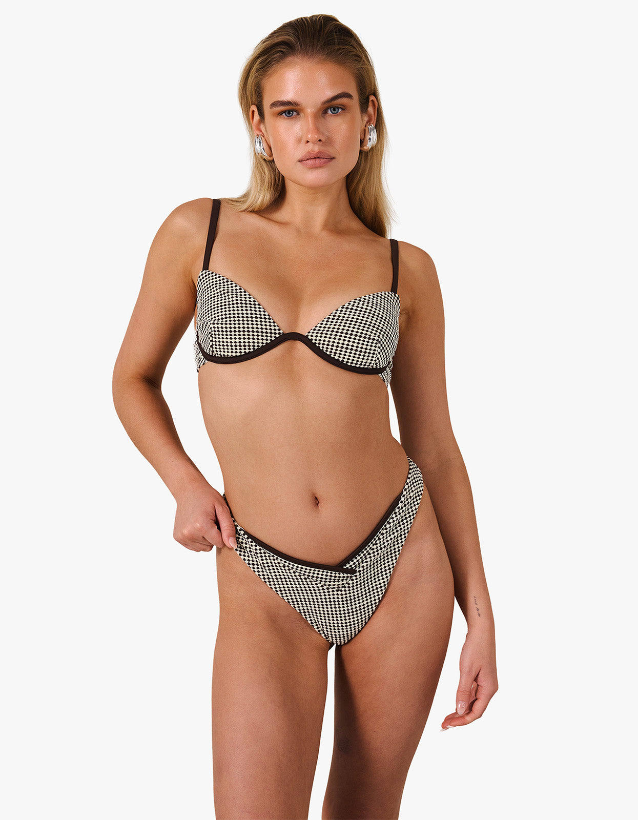 A refined small brown dot print in warm Cognac tones is balanced with contrast detailing, designed to sit comfortably on the body. Pair with the Valeta Bra Cup for a coordinated set that exudes sophistication.