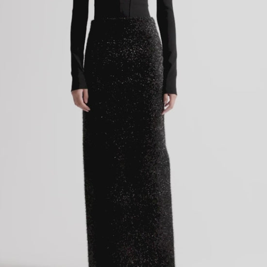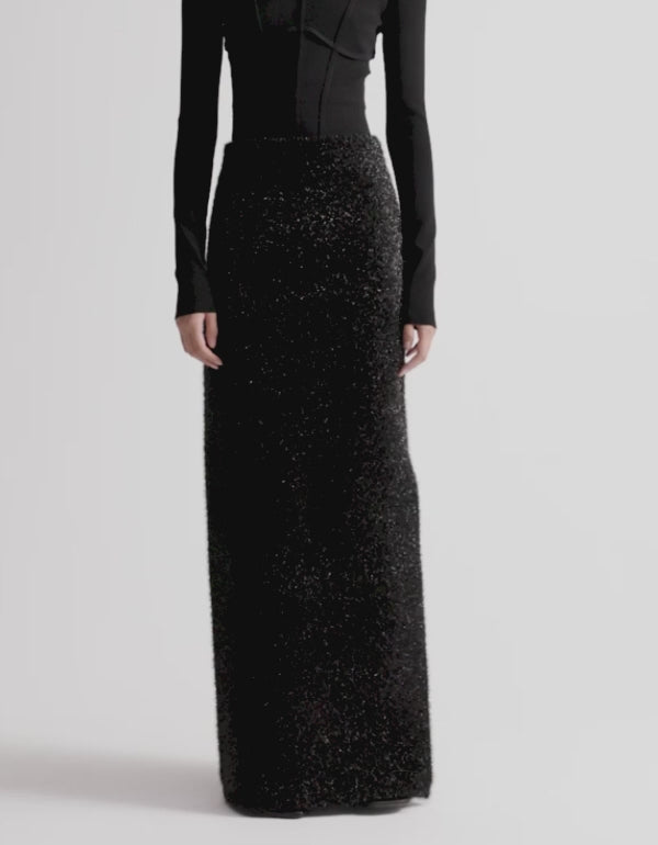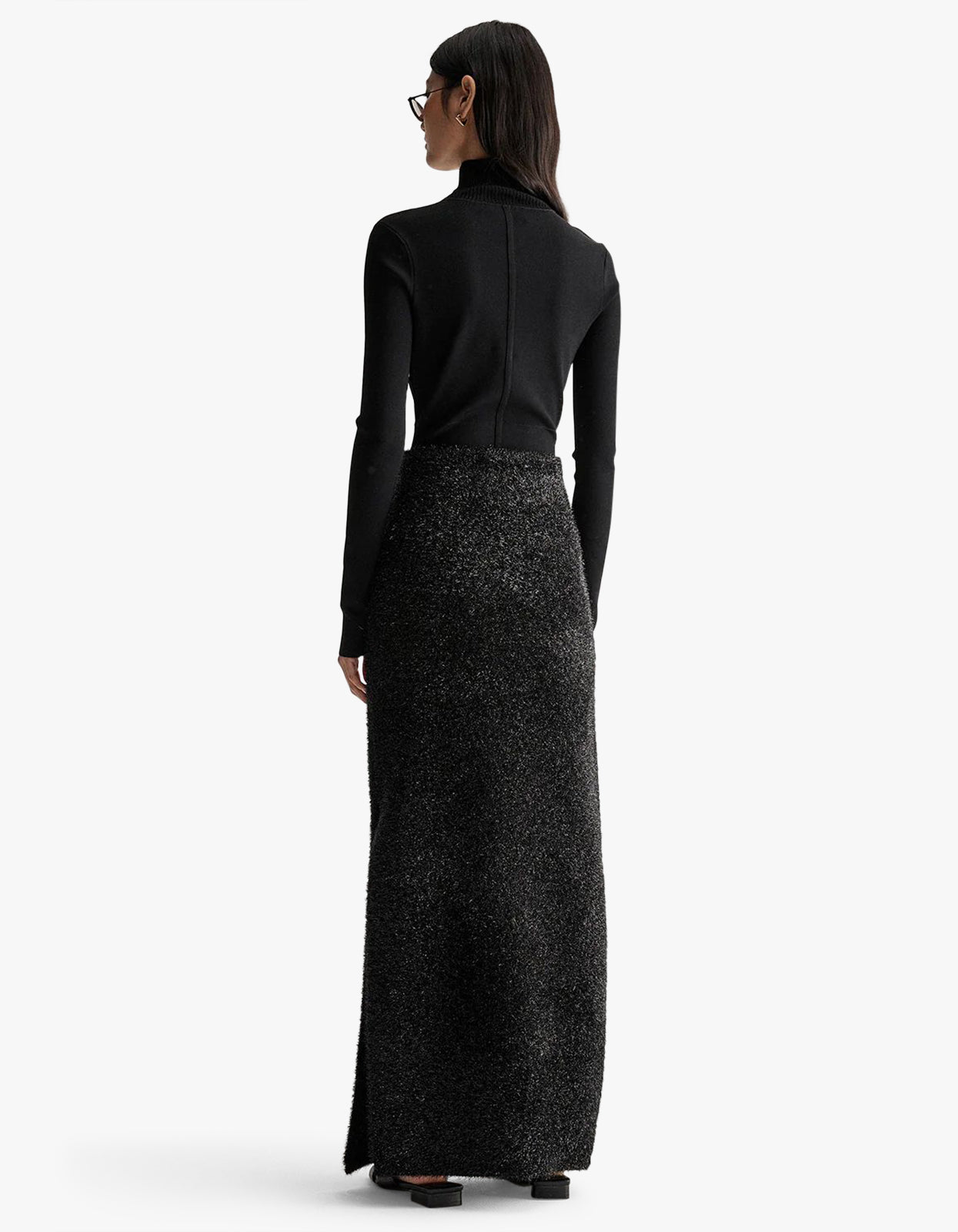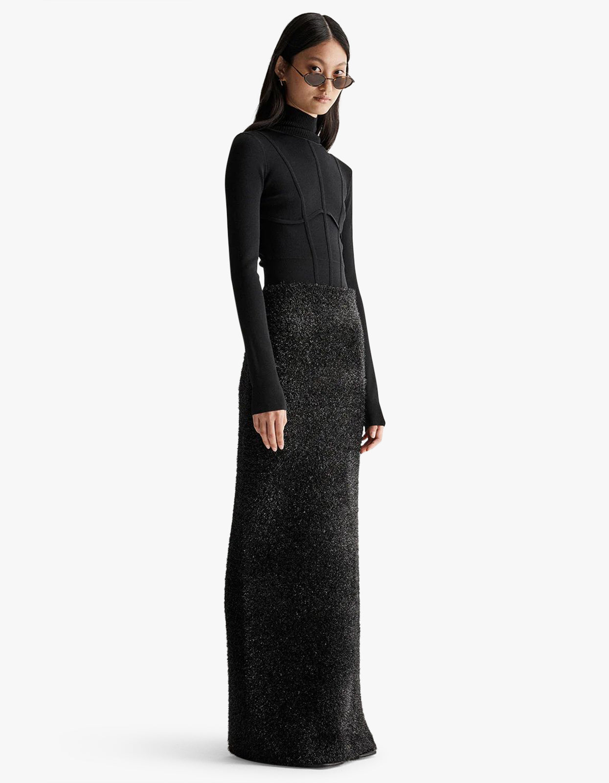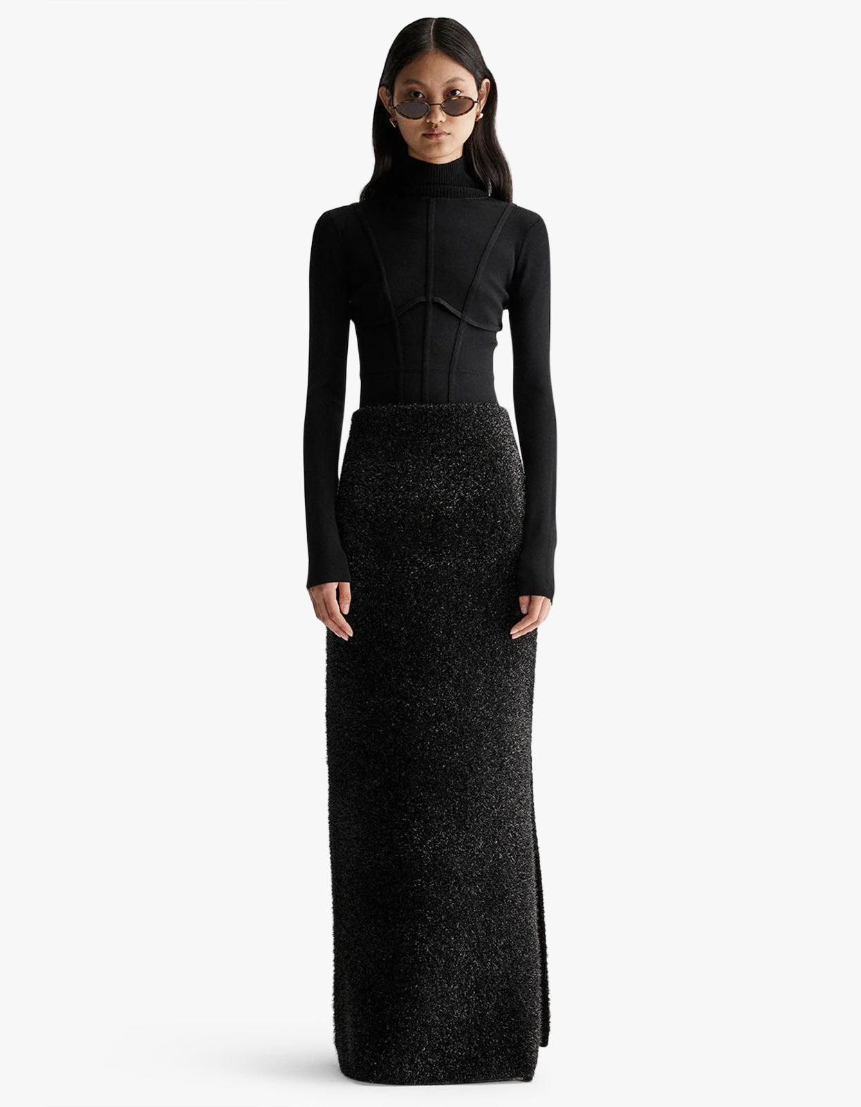 Crafted with black lurex, this sophisticated skirt offers a touch of sparkle to your wardrobe. The midi length adds a touch of elegance, making it perfect for any occasion. Elevate your style with the Aurora Midi Skirt.