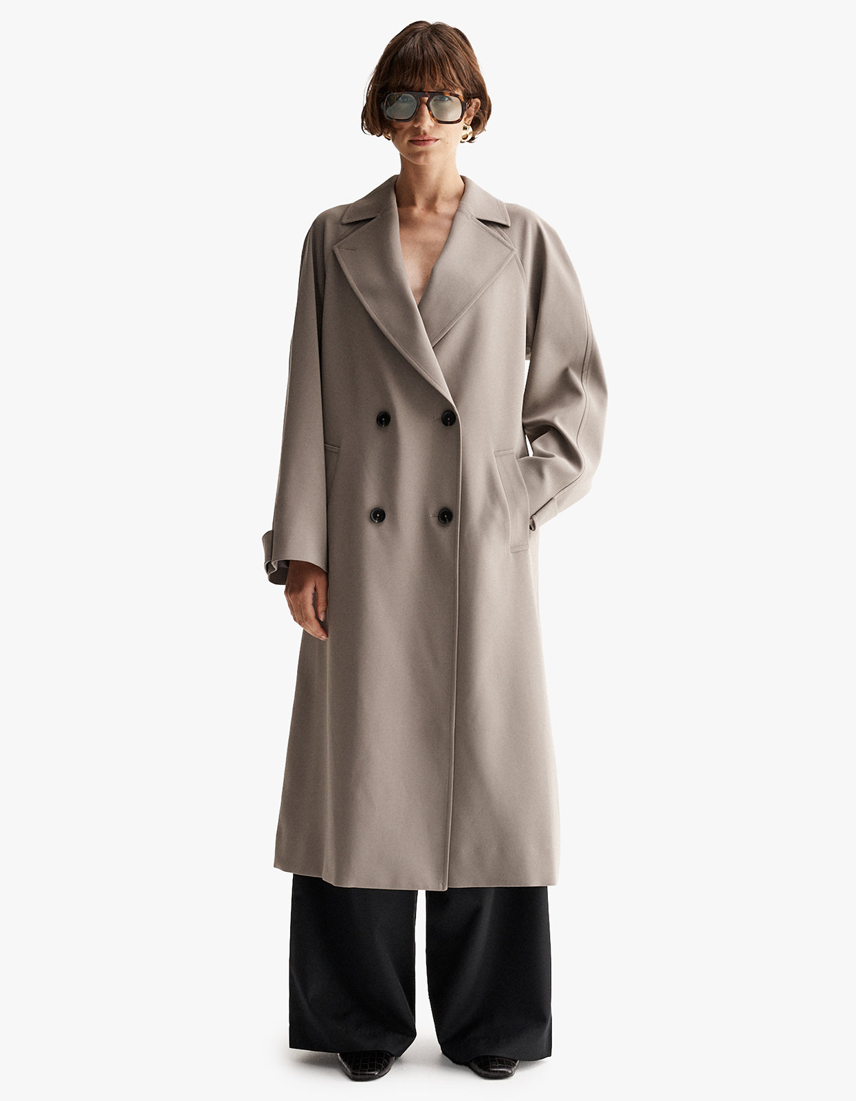 Elka Collective's Corinne Trench in Dusty Sage embodies refined elegance with its sophisticated silhouette and muted, versatile hue.