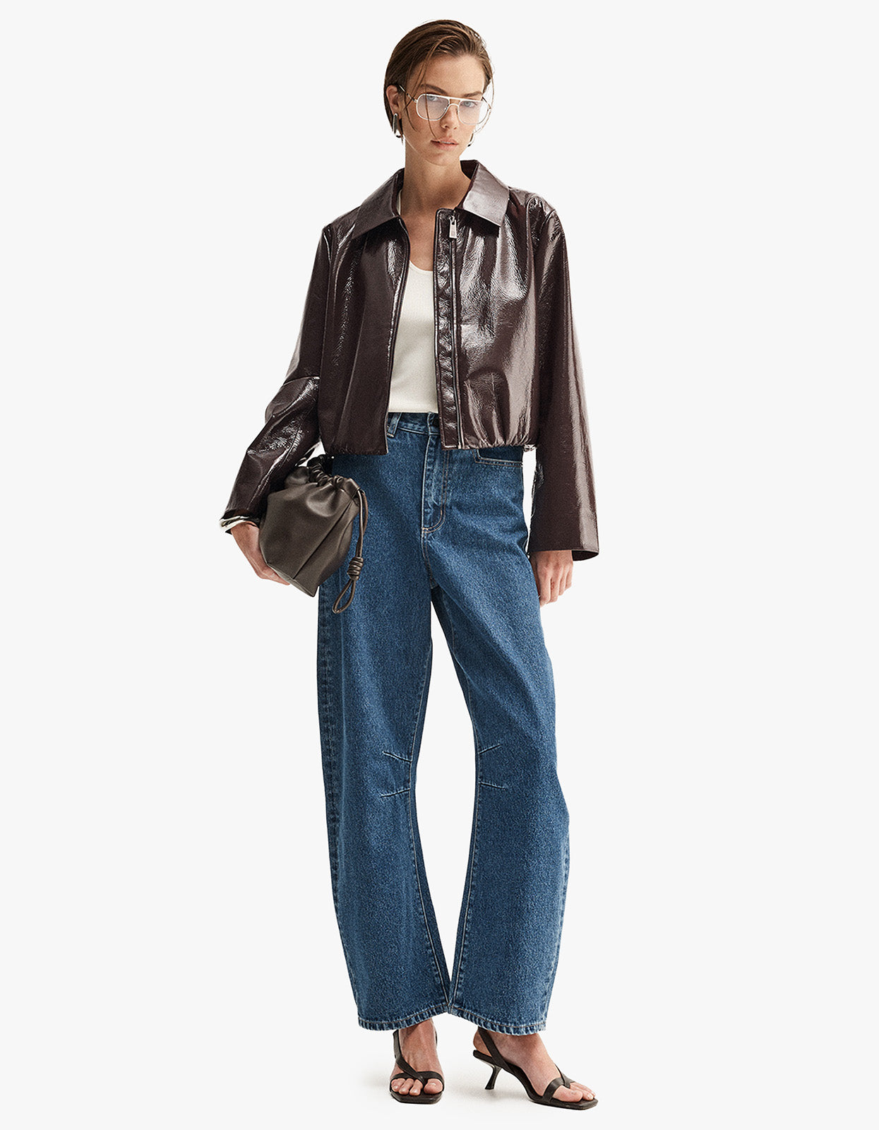 The Winston Jacket is your new go-to for effortless laid-back style. With its luxurious vegan leather construction and distinctive crinkled texture, this cropped jacket features a zip-through front, satin lining, and elastic hemline, making it perfect for layering with your go-to jeans for weekend outfitting.