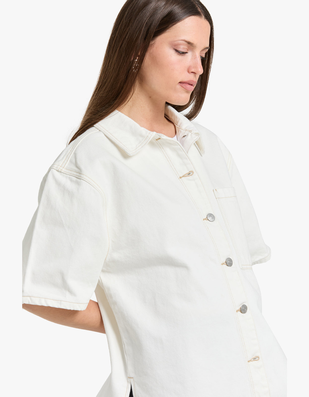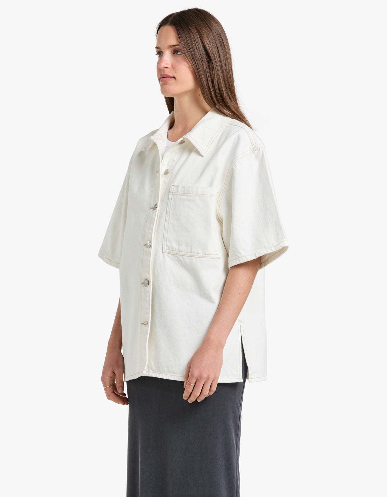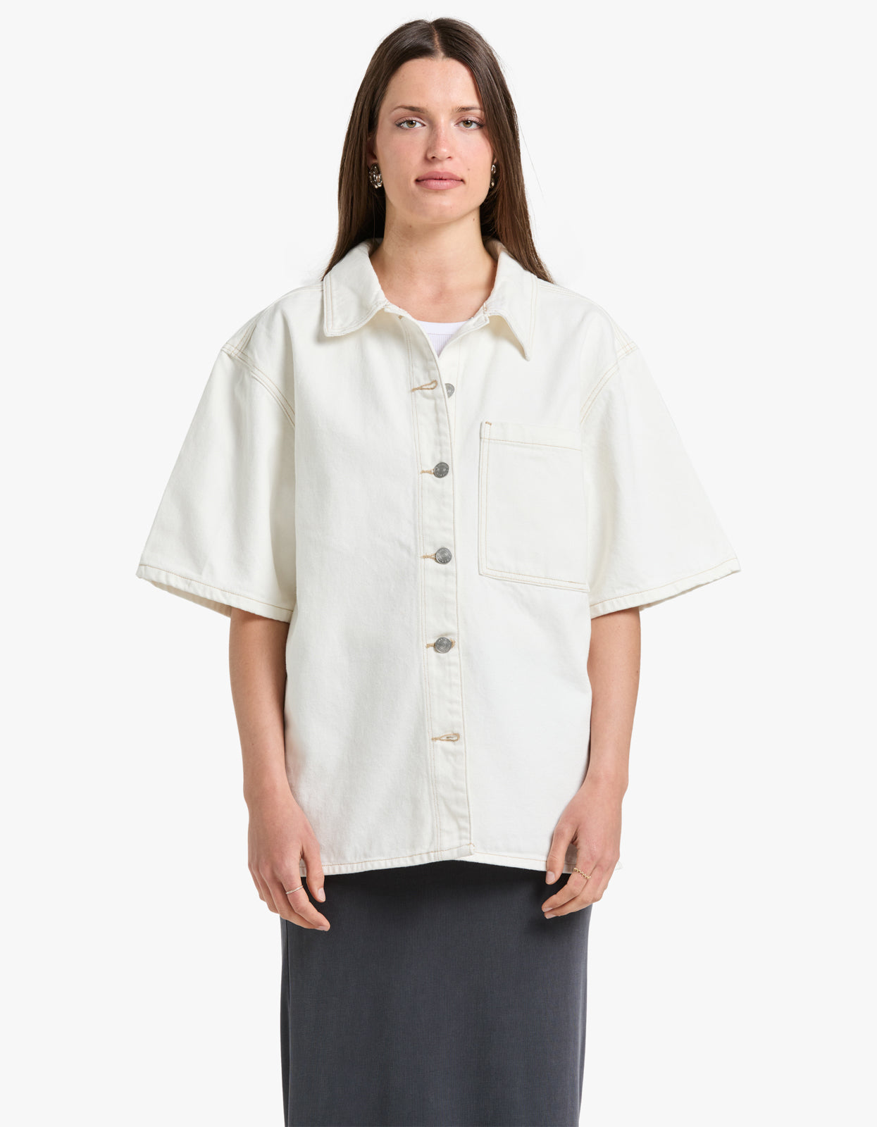 Introducing the Ena Pelly White Denim Short Sleeve Shirt, a contemporary essential adorned with contrast stitching, silver buttons, and a chest pocket. Ideal for effortless style and versatile wear, this shirt is a must-have addition to your wardrobe.