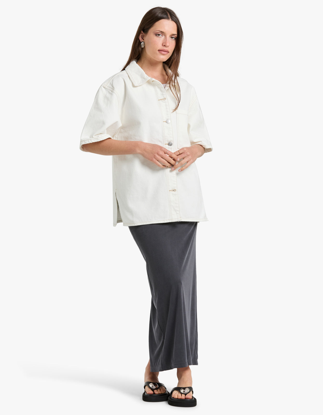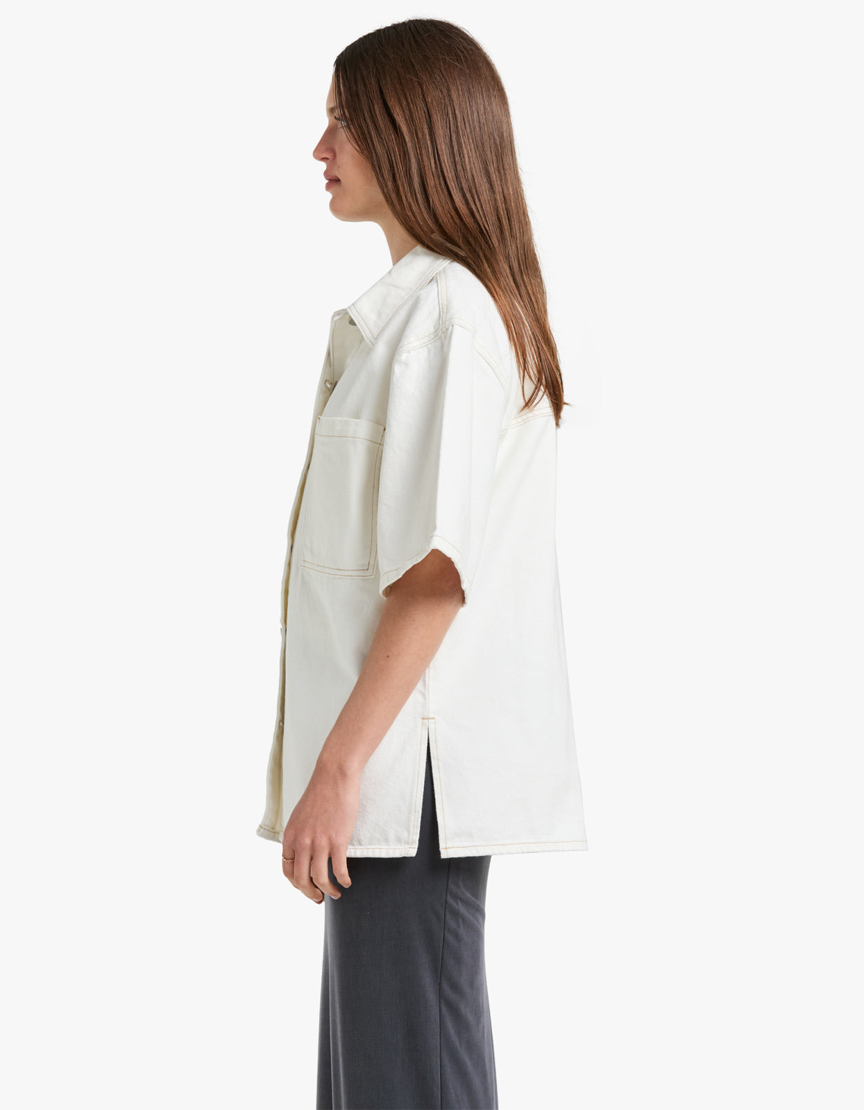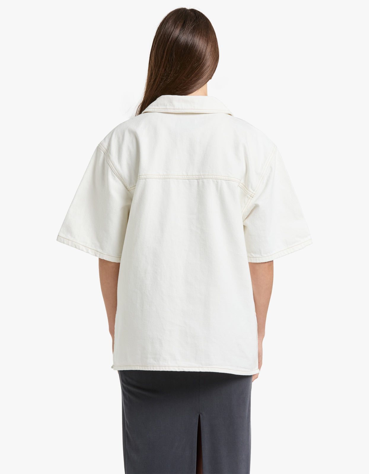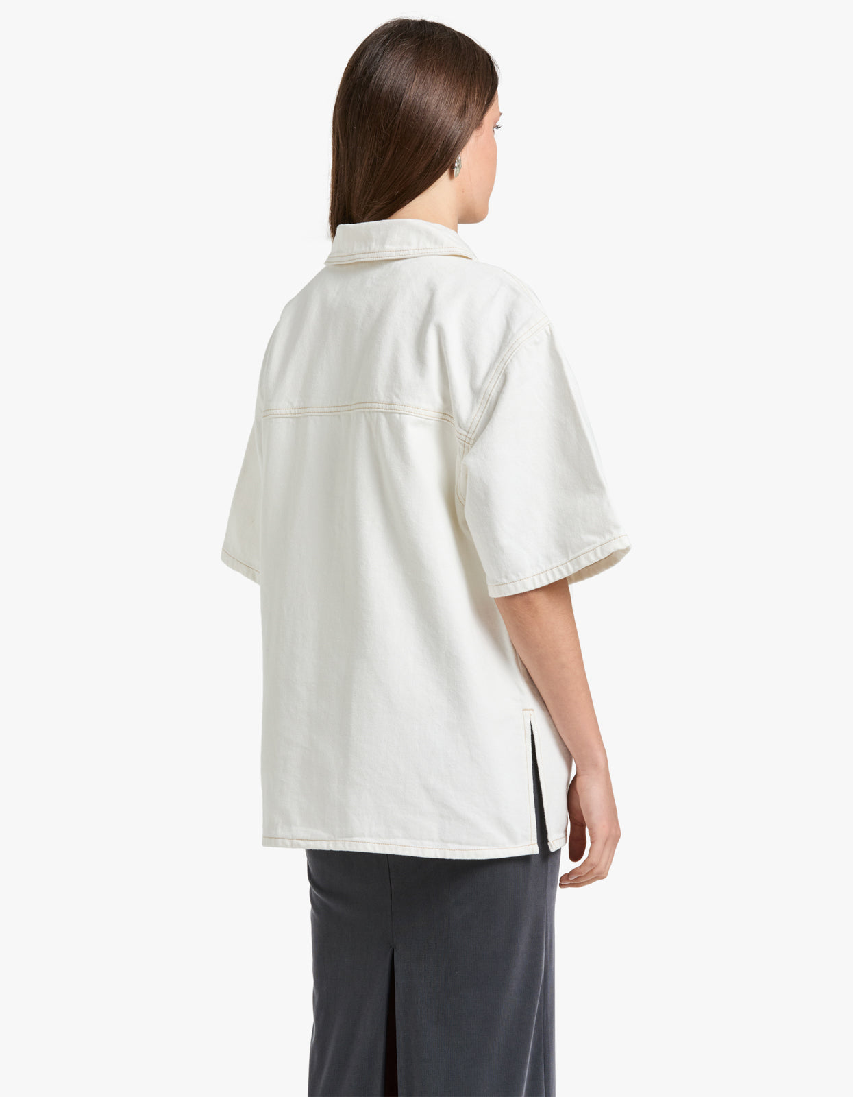 Introducing the Ena Pelly White Denim Short Sleeve Shirt, a contemporary essential adorned with contrast stitching, silver buttons, and a chest pocket. Ideal for effortless style and versatile wear, this shirt is a must-have addition to your wardrobe.