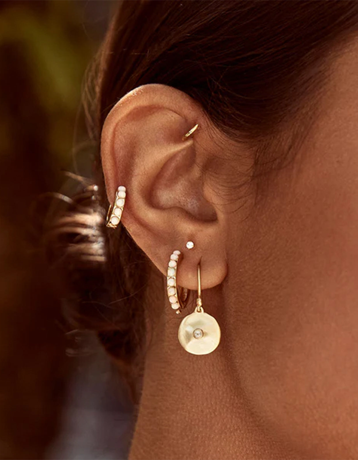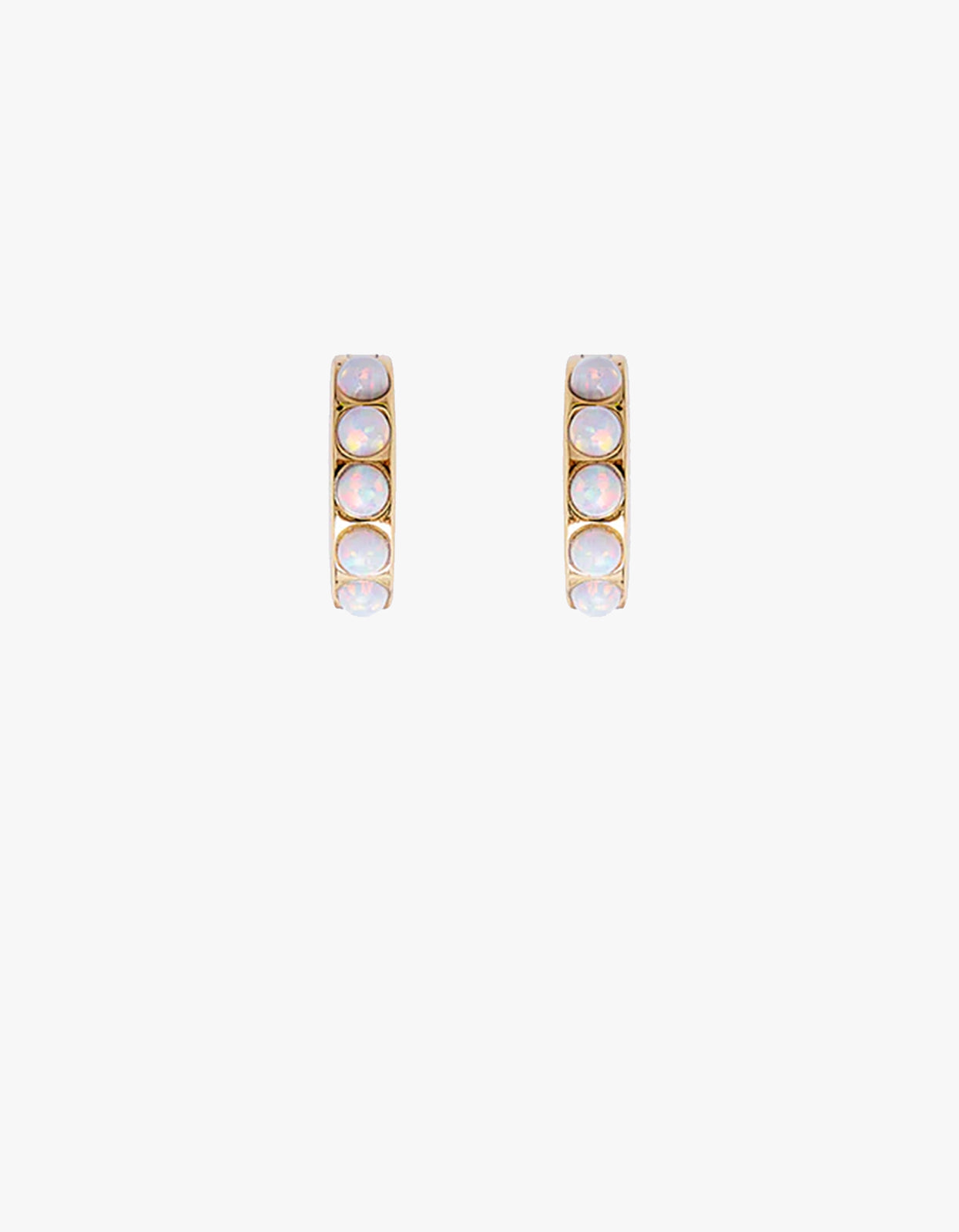 Exquisite 18k gold-plated huggies from Fairley adorned with five luminous cabochon crystal opals.